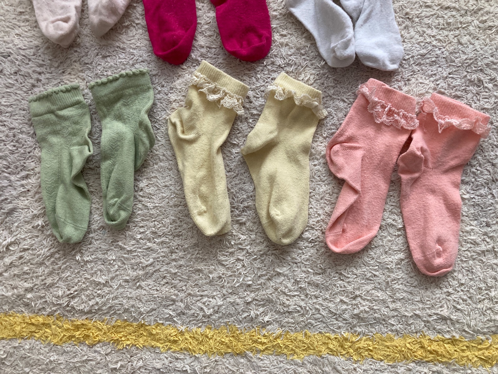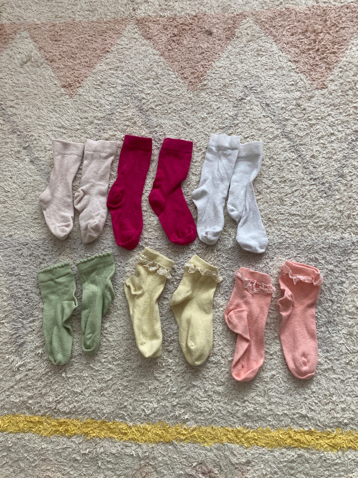 Ponukam na predaj 6 parov detských ponožiek. Prvý rad hore sú s úpravou aloe včera, pre vek 1-3 roky. Sú veľmi elasticke, ľahko sa obúvajú. Druhý rad sú ozdobnejsie s cipkou a vzorom. Predam iba všetky spolu. Cena je za všetky.