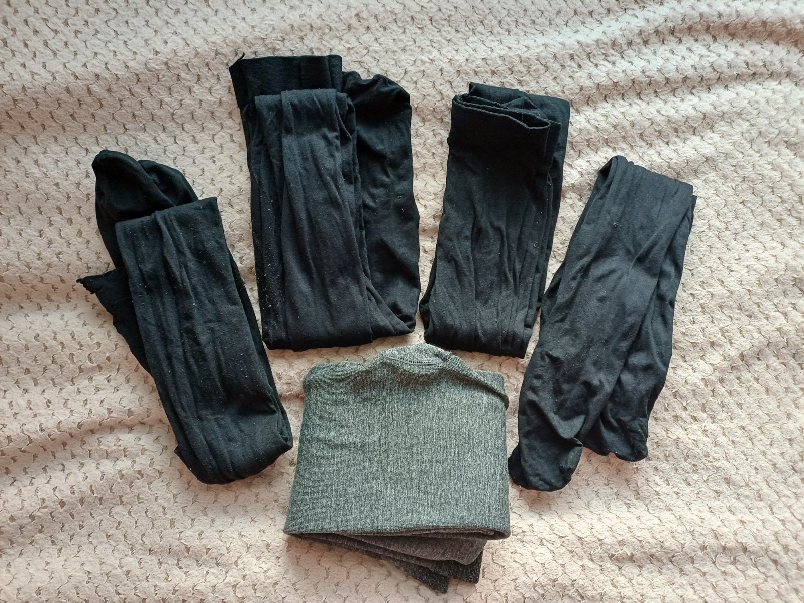 1ks šedé zateplené pančuchy,veľkostne M/L,značka neviem,na jednom stehne z vnútornej strany sú zašité,inak žiadne dierky,aspoň neviem 🙂