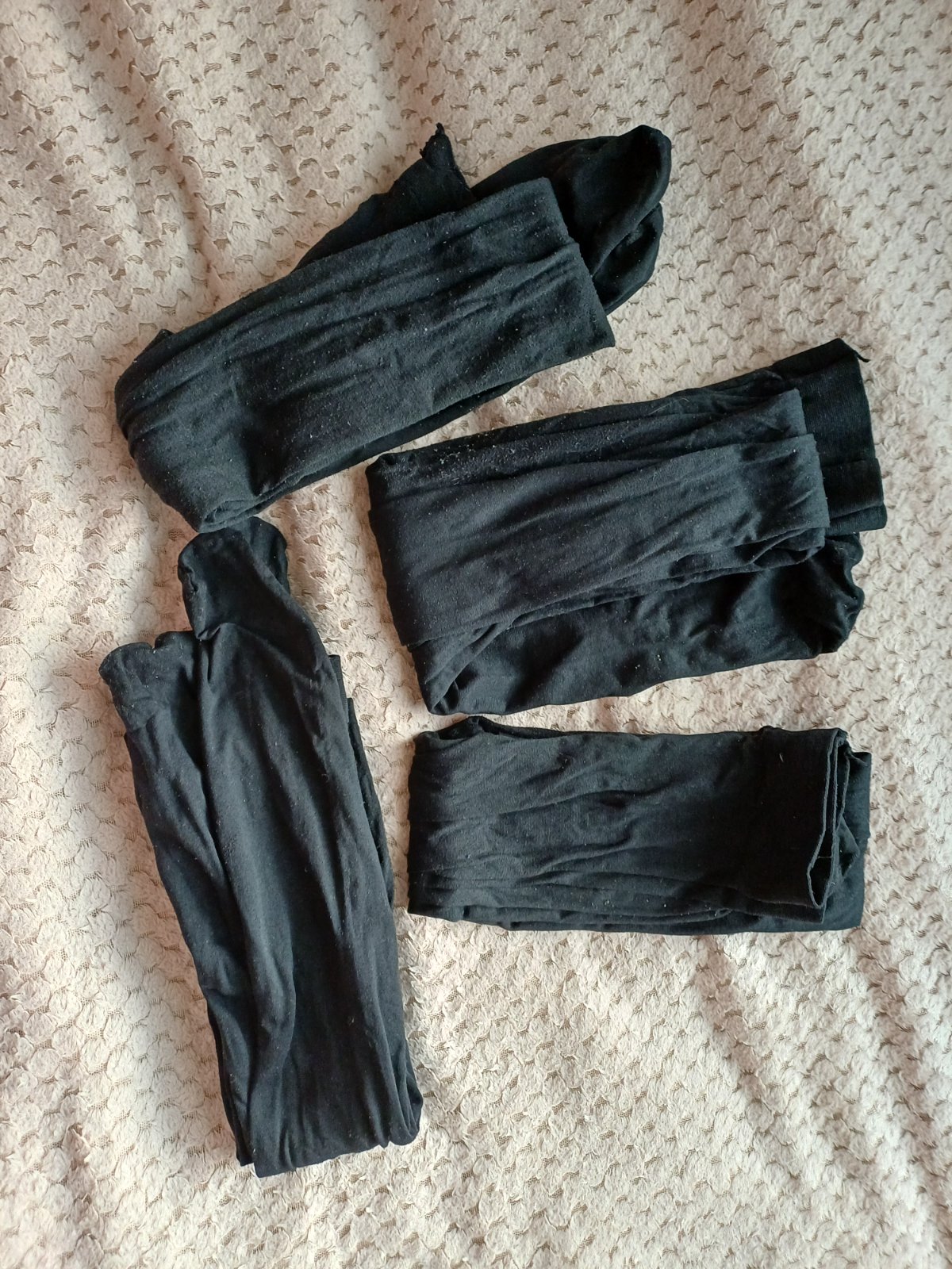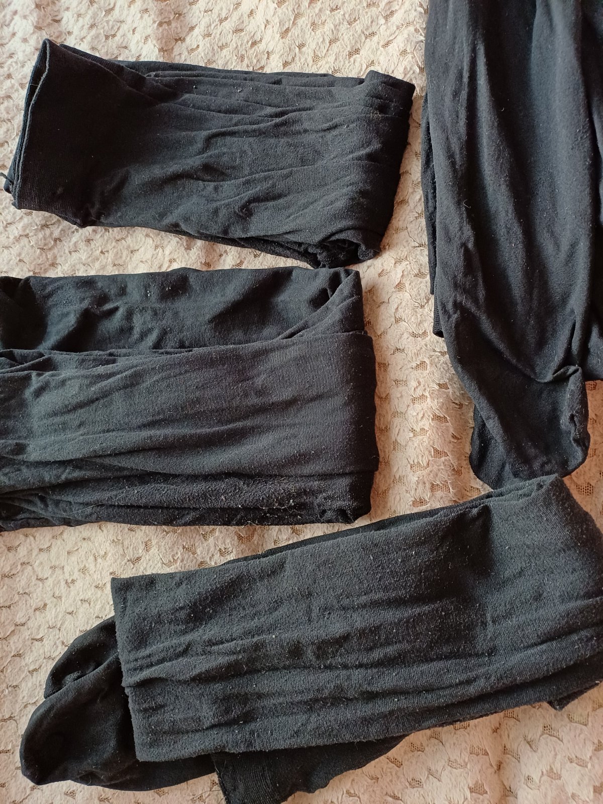 4ks čierne silonkové pančuchy,myslím,že som ich kúpila v tescu f&f,sedia na veľkosť L. Nemajú dierky,len žmolky.