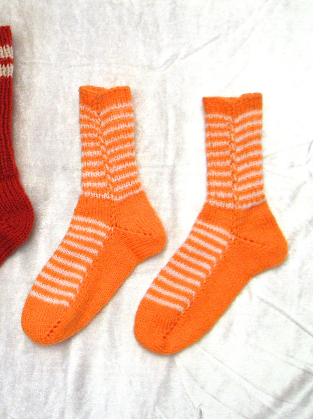 Nové hrubé zimné handmade ponožky oranžovej farby s bielymi prúžkami, ručne pletené mojou mamou zo zvyškov vlny; 1 pár. Dĺžka chodila je cca 23 - 26 cm, čo by malo zodpovedať veľkosti asi 36 - 40.