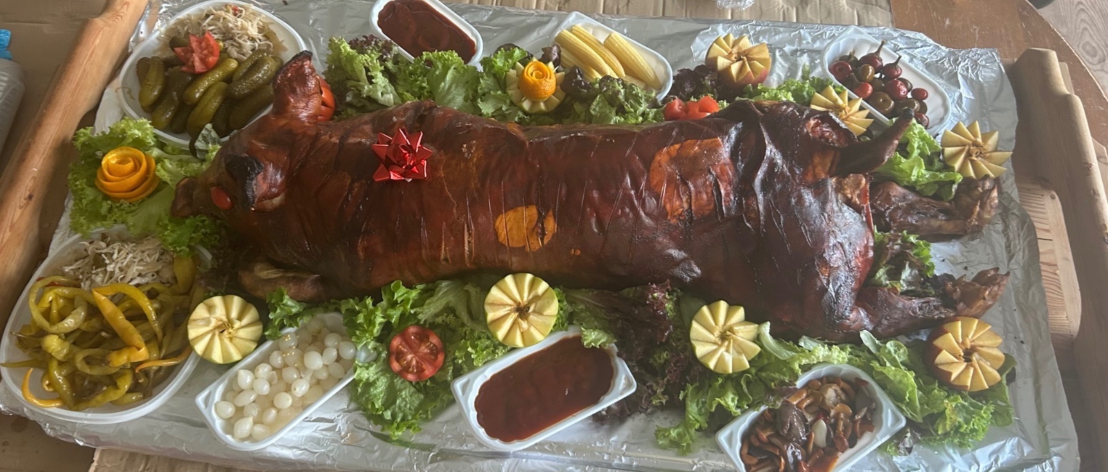 Ponúkame grilované prasiatko pripravované v špičkovom grile NIE v konvektomate! Po ugrilovaní je mäsko chutné, šťavnaté a trhacie. Koža je chrumkavá a zapečená do zlatista. Prasiatka pochádzajú zo slovenského certifikovaného chovu .Je podávané na lopári z bukového dreva ( zapožičiava sa) a zdobené zeleninovou prílohou ( listová zelenina , baranie rohy , feferónky, čalamáda, uhorky, kukuričky, jablkové pyré, ovocné ozdoby, rôzne druhy omáčok a pečené zemiačky. Doprava Poprad a okolie (rádius 10km) Zdarma. Taktiež možnosť osobného odberu . Záloha: 100eur