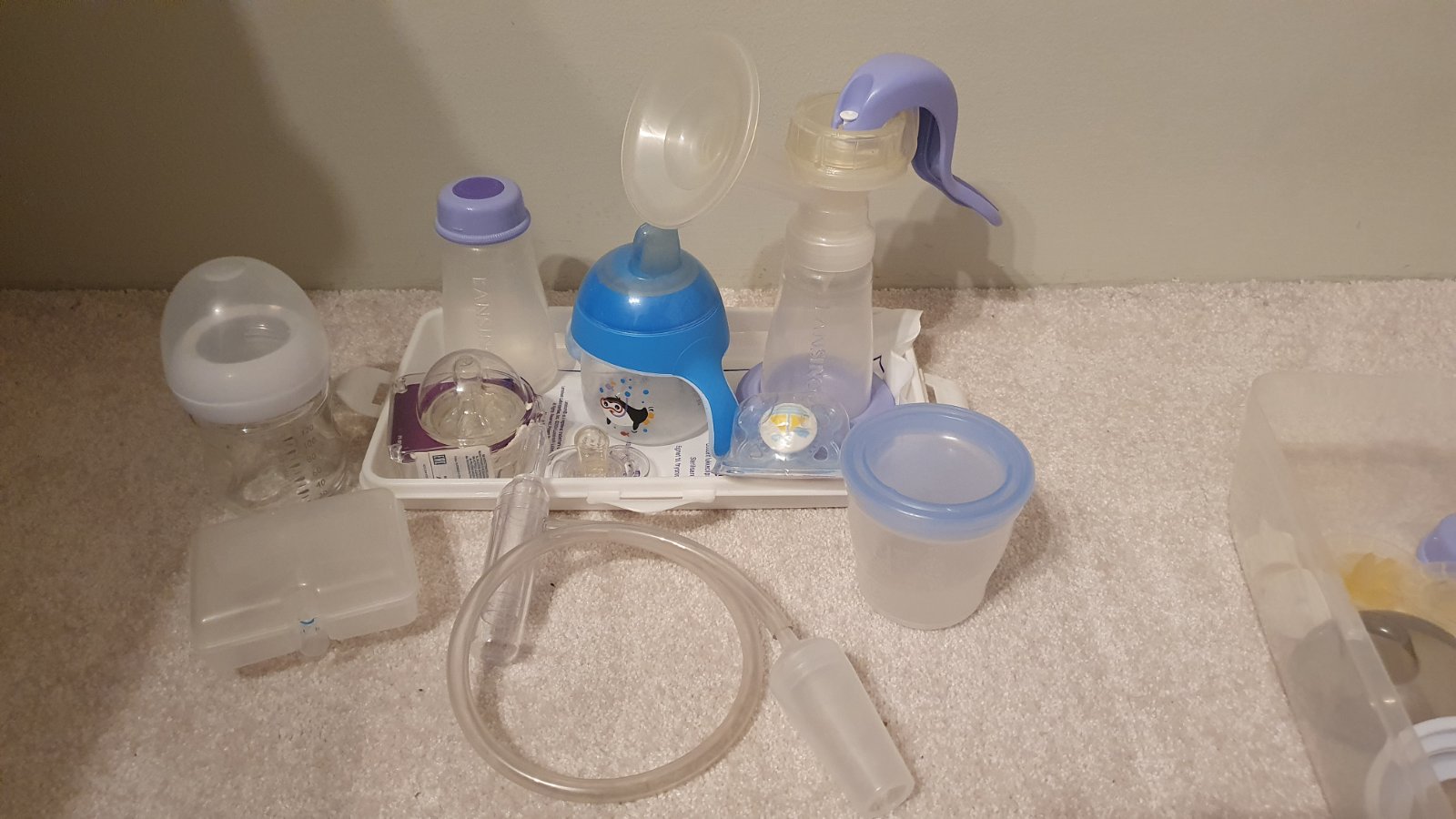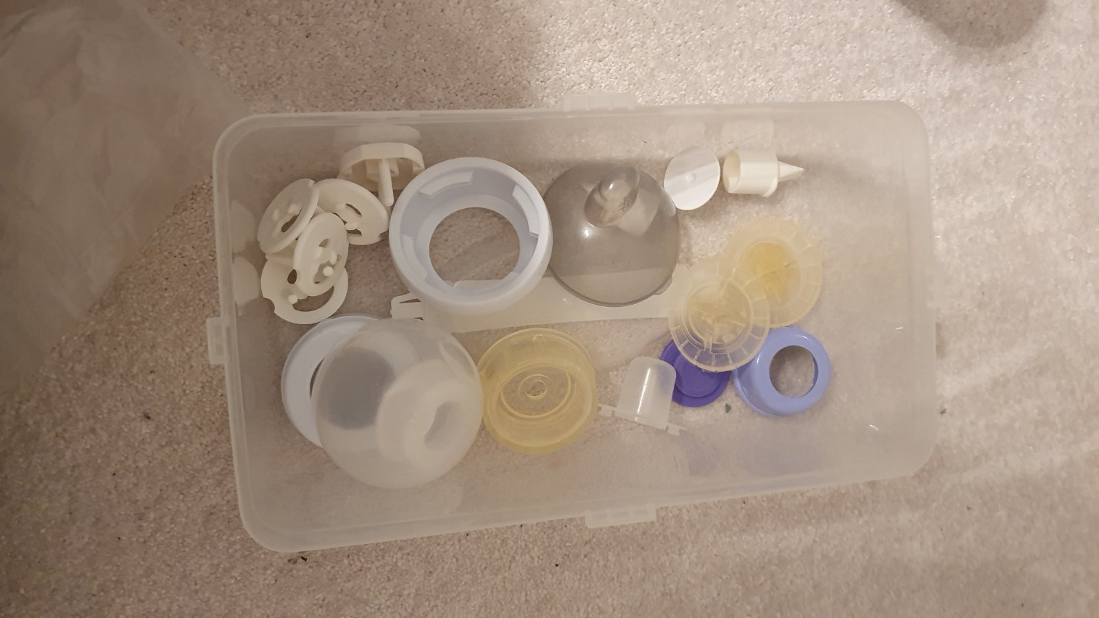Set odsahuje používanú odsávačku Lansinoh, sklenenú flašku Avent, viaceré nepoužité cumlíky, odsávačku hlienov, bezpečnostné zátky, nádobku na sušené mlieko a iné veci - viď fotka.