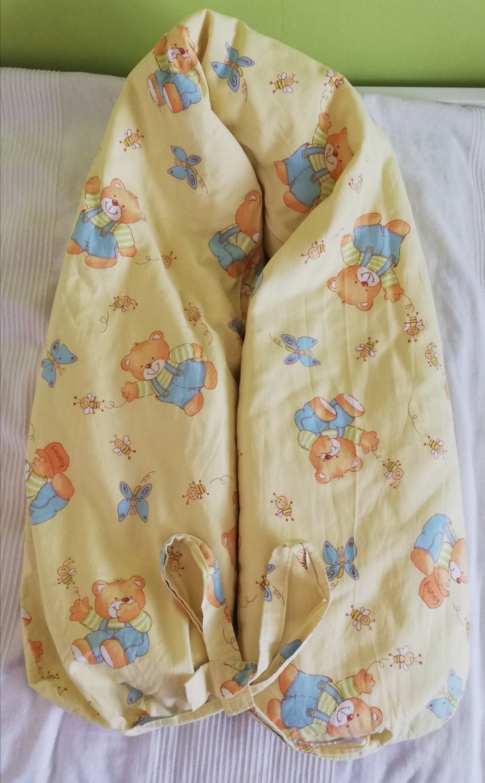 Predám vankúš na kojenie, ja som ho používala aj ako mantinel, aby sa bábo nezgúľalo alebo aj na spinkanie bábätka. Dĺžka je 160 cm. Poťah sa da odzipsovat a vyprať. Na poťahu je fľak - viď foto. Výplň sú malé gulicky, dajú sa dokúpiť v Brendone a v prípade potreby doplniť/rozprárat vankúš a dosypat, zasit/. Mne stačilo takto ako to je, vankúš bol lepšie formovateľný.