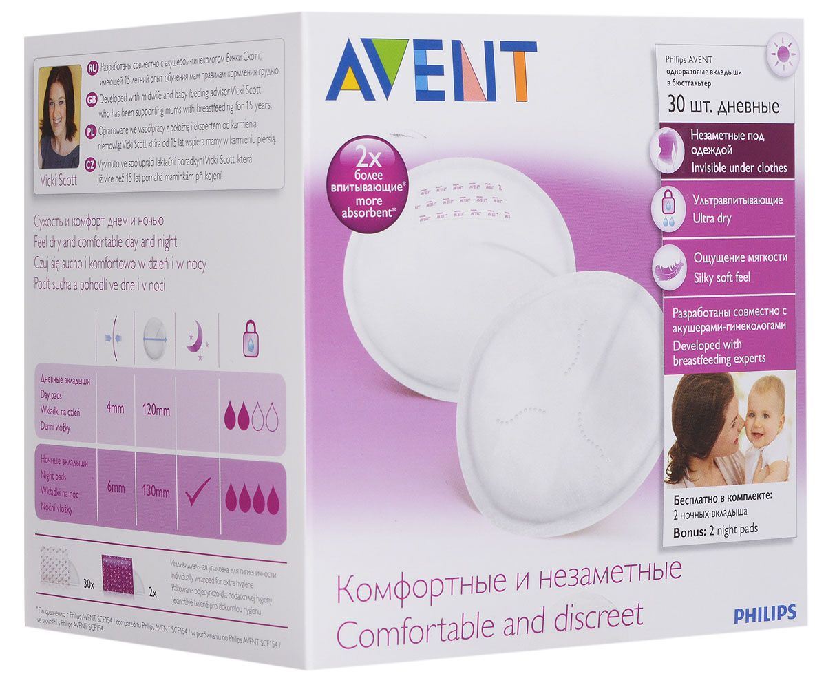 Široký tvar a viac vrstvená stredná časť zvyšuje absorbciu mlieka. Dvojitý samolepiaci pásik zabraňuje posuvu vložky v podprsenke.
