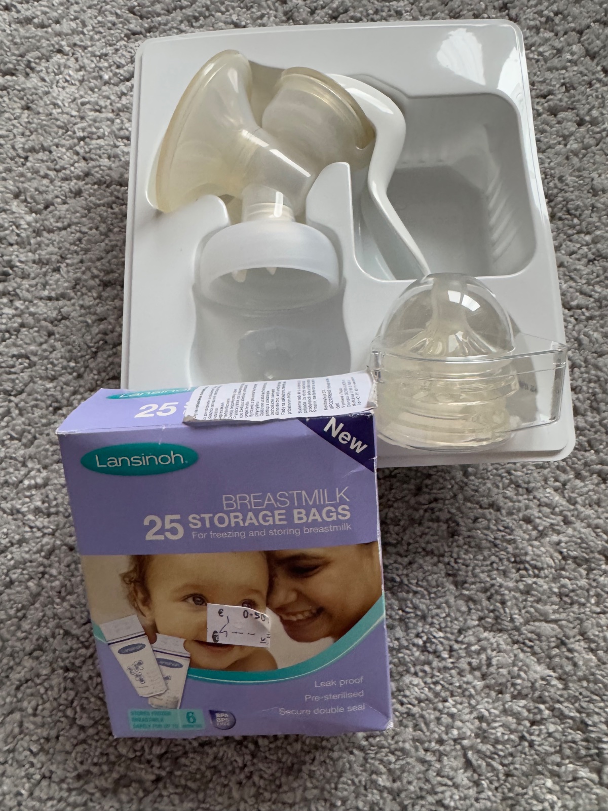 Odsávačka je v dobrom stave. Je bez fľaše. Prikladám k nej sáčky na materské mlieko a sadu troch náhradných cumlíkov číslo 0. Neotvorené balenie.