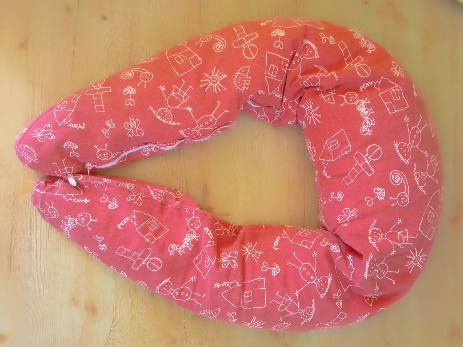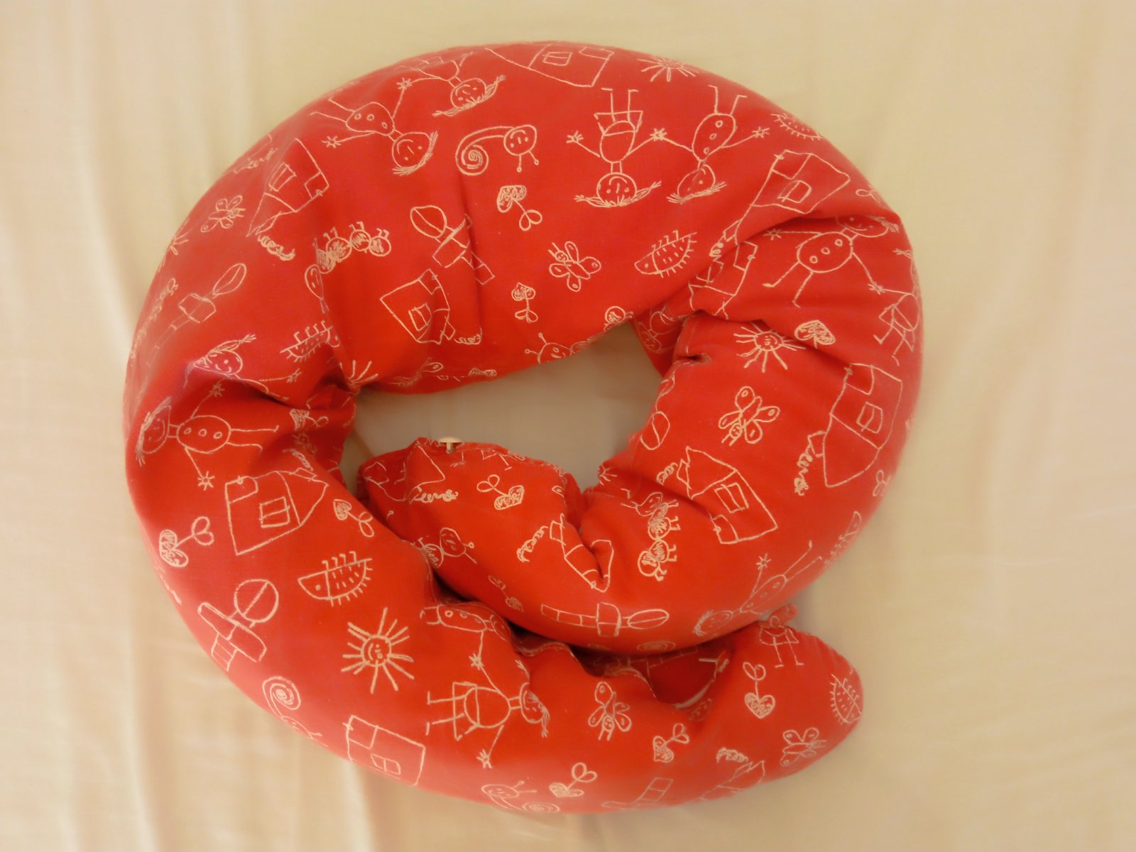 Jeden z dlhších, dobre poslúži ešte aj počas tehu aj po pôrode na polohovanie pri spaní, sedení a potom na dojčenie, ako hniezdo na spanie pre bábätko, alebo ako mantinel do postieľky. Poťah je pratelny, vankúš je plnený polystyrénovými guličkami. Poťah je prijemnejsej červenej farby, nepodarilo sa mi verne zachytiť. Na farbe je vidieť pranie