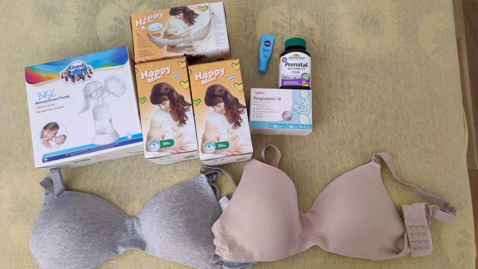 Rucna odsavacka, pouzivana cca mesiac, pravidelne sterilizovana, zostali na nej max flaky od vody, prsne vlozky Happy Mimi, necele 3 baliky, lanolinovy krem Canpol Babies na bradavky 7g - pouzivany len v porodnici, vitaminy, Jamieson - zostalo cca 10tbl, podprsenky na dojcenie, h&m, 85C, bez kostic, nosene, bez poskodeni