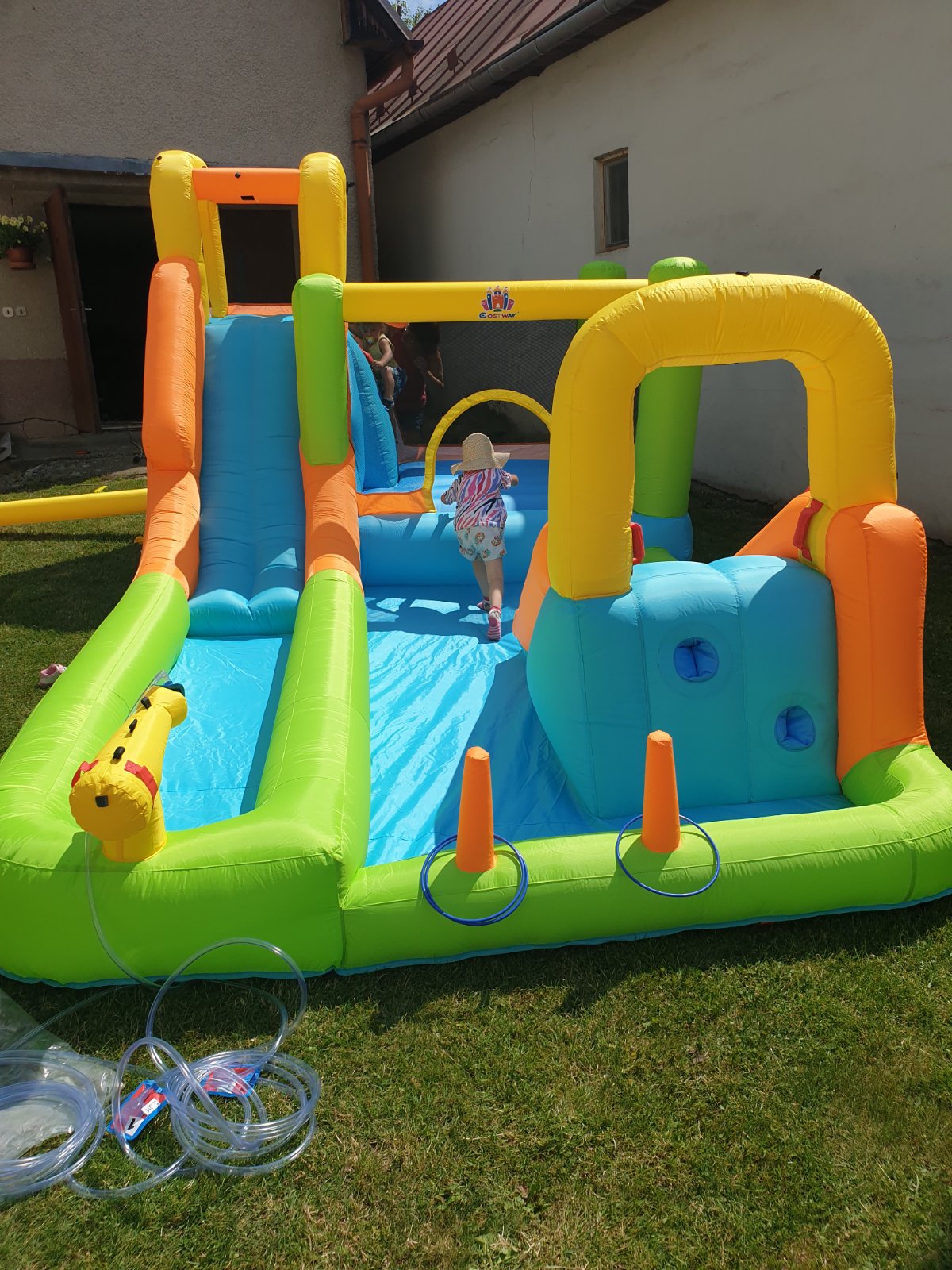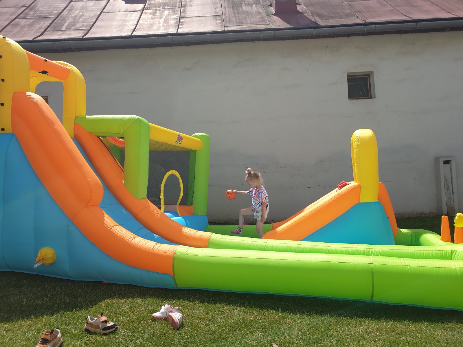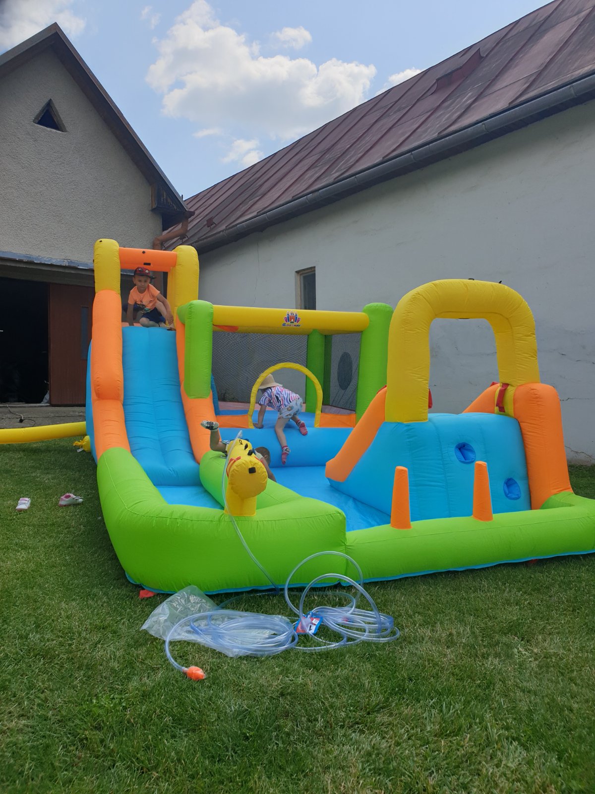 V cene je hrad, dúchadlo, plachta pod hrad, hadice na vodné trisky a loptičky..pri vrátení príliš znečisteného hradu poplatok 30€