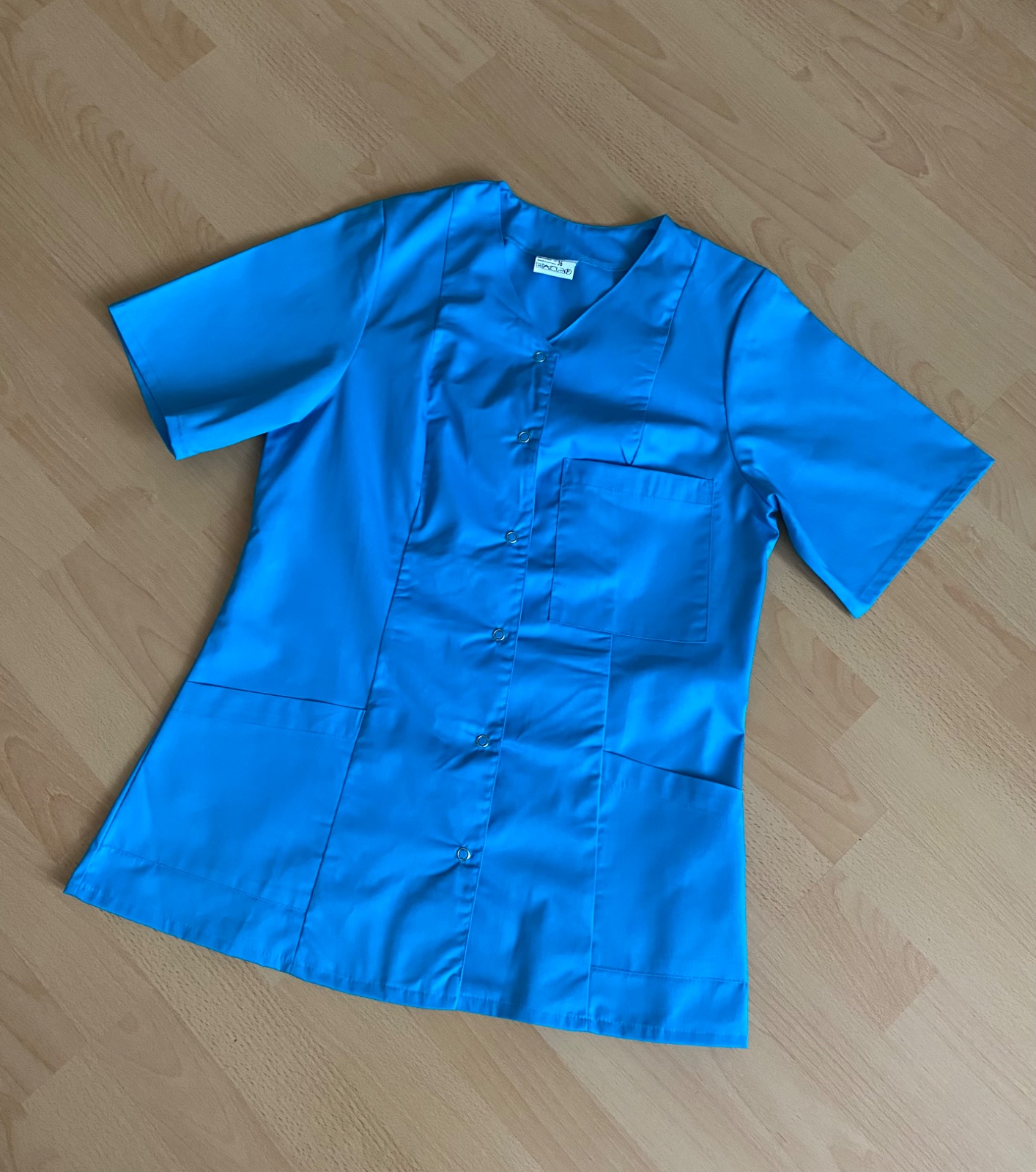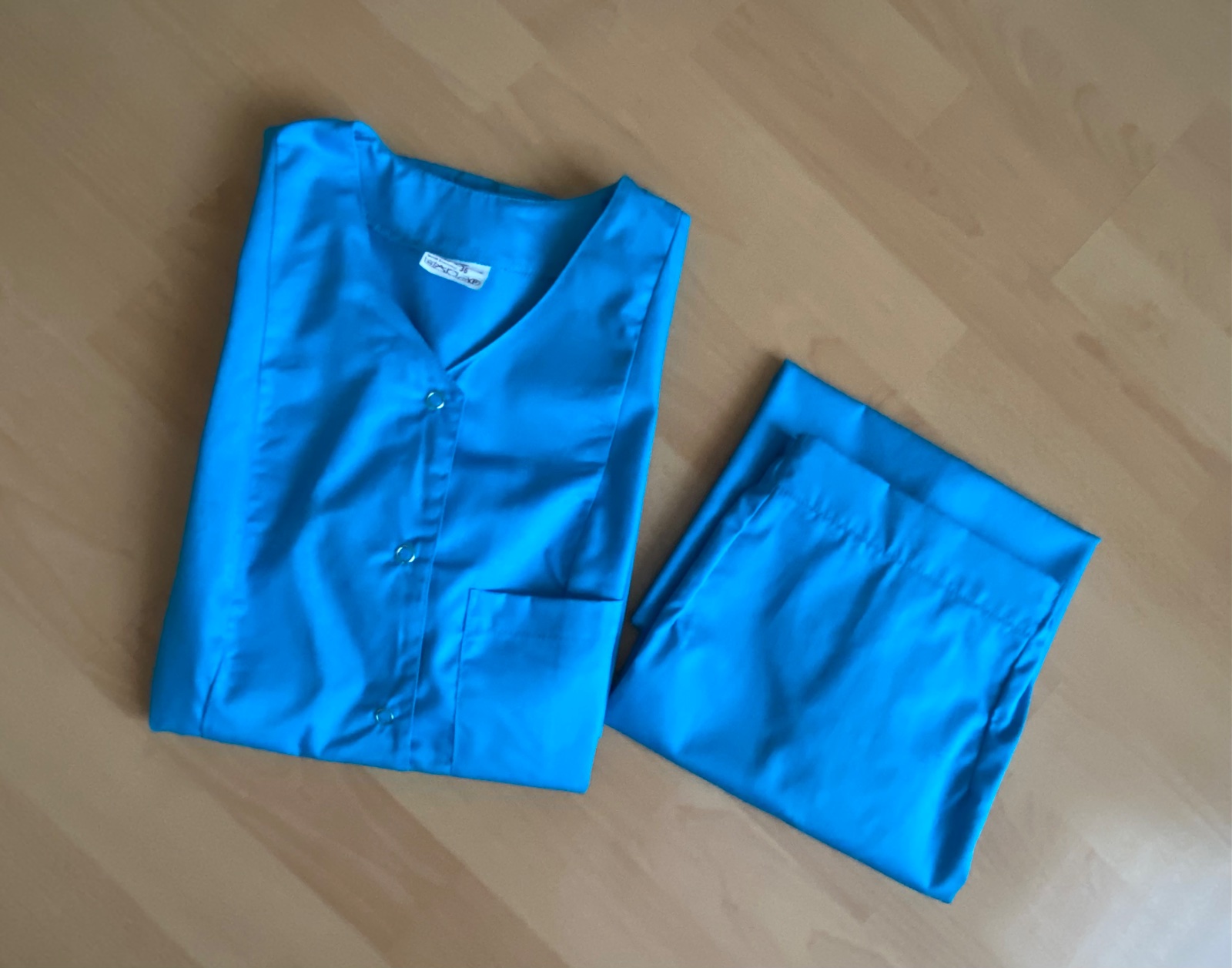 Nová, bez poškodenia súprava pracovného zdravotníckeho oblečenia - blúza a sukňa. Veľkosť S. Materiál bavlna a polyester, nie je elastický. Vyrobené v EU. Blúza zapínanie na patentky. Sukňa v páse guma, zapínanie na zips. Farba tyrkysová.