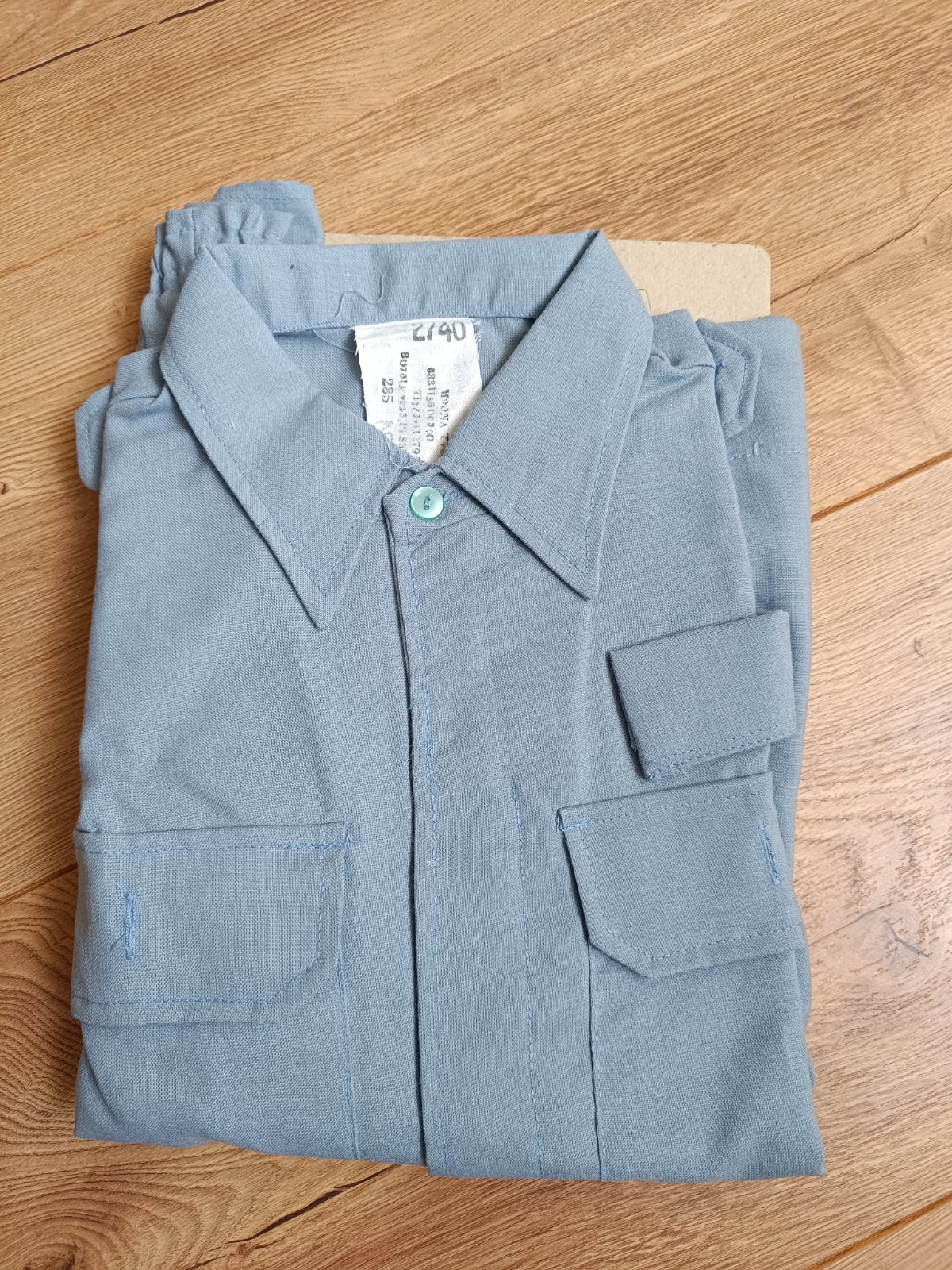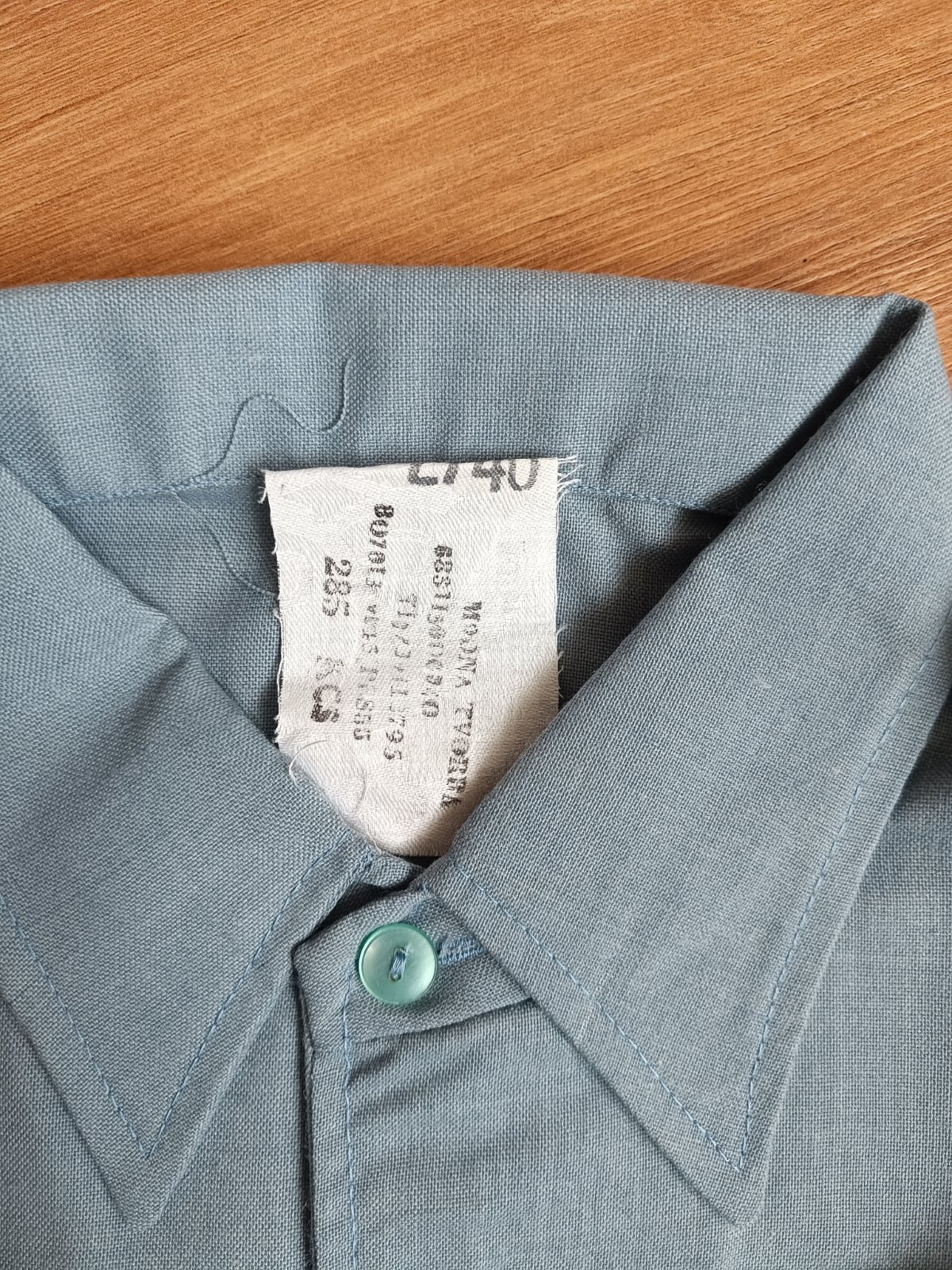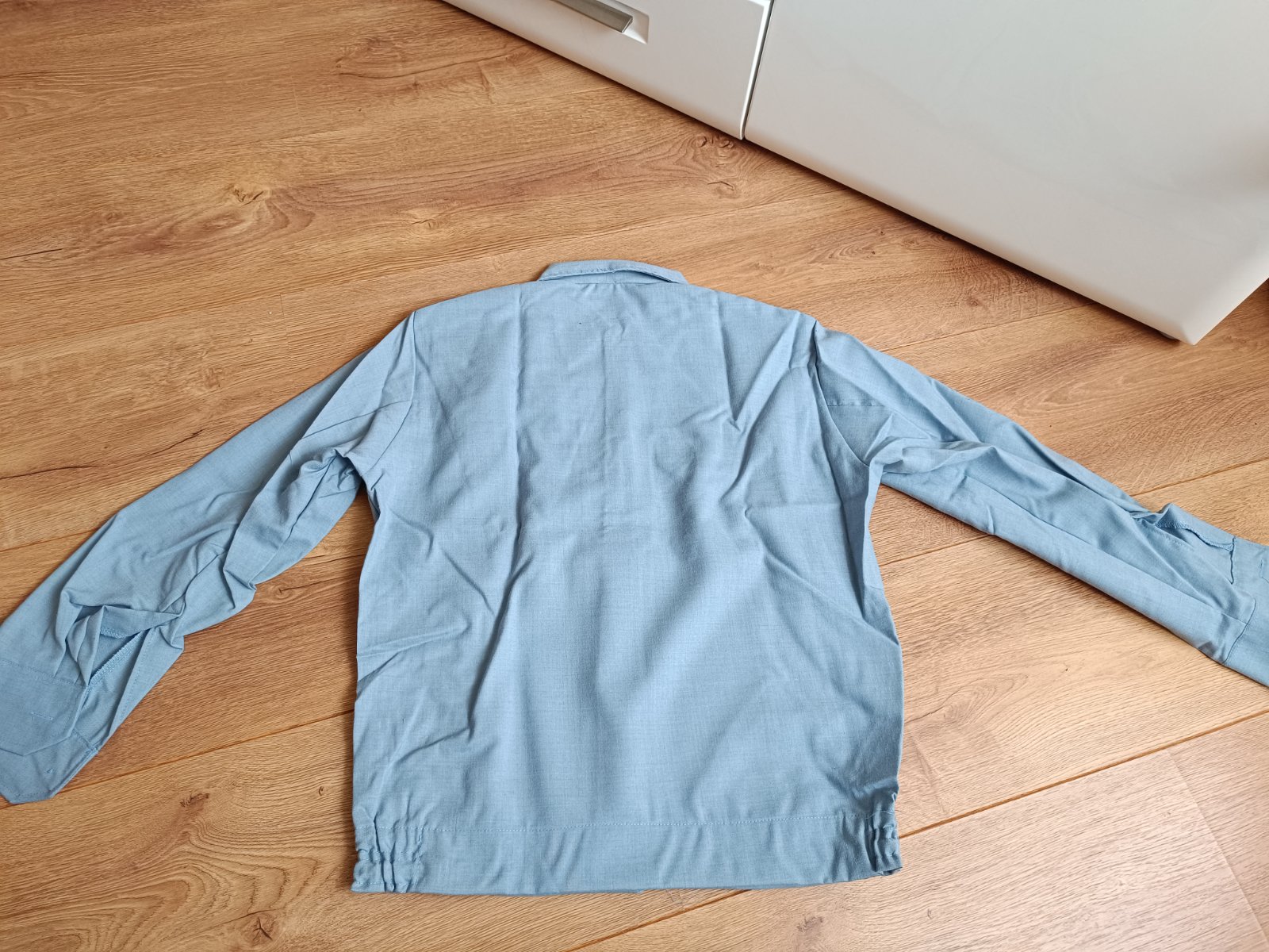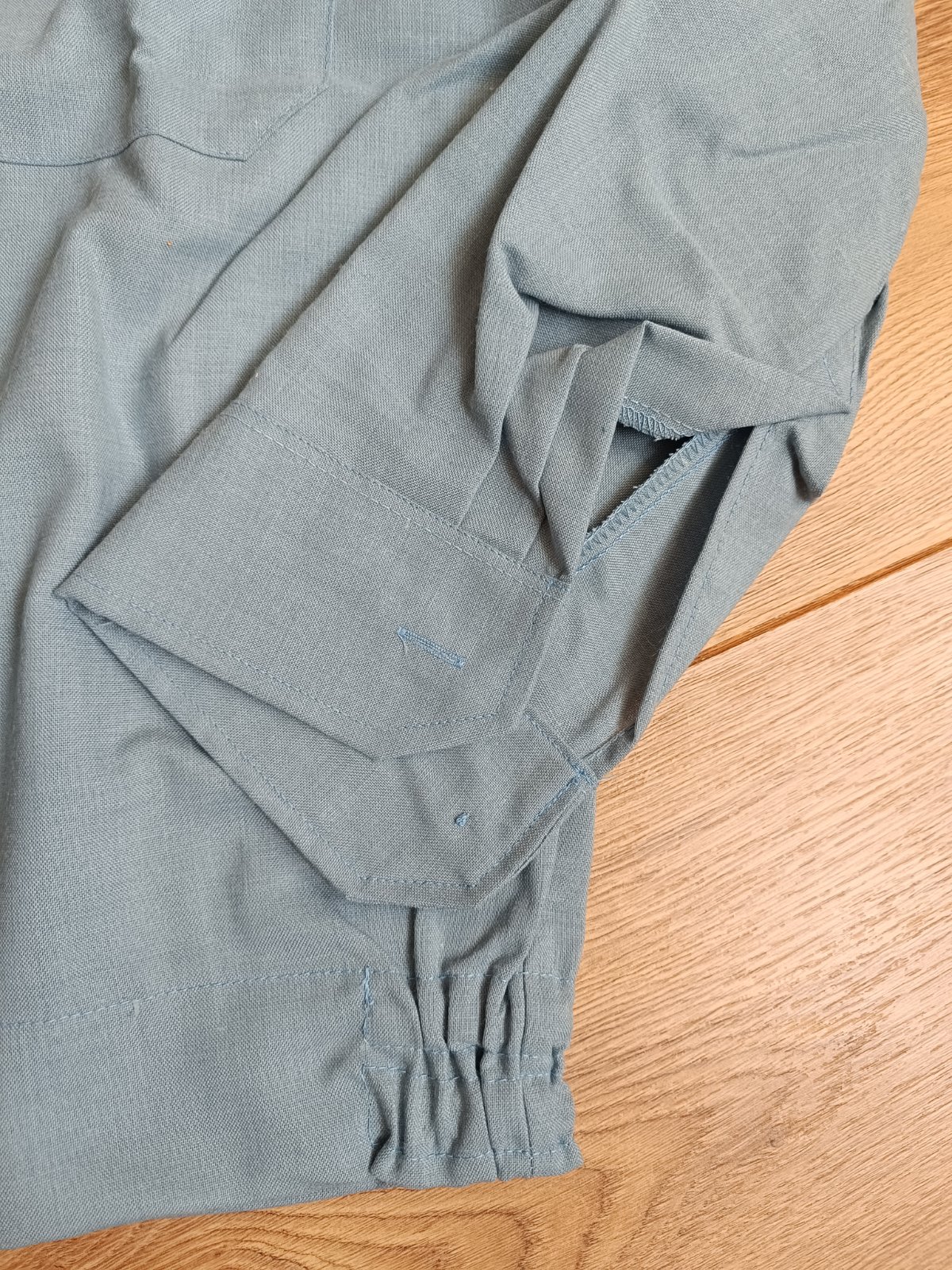 Kosela je vyrobena z bavlnenej latky v bledomodrej farbe so zapinanim na gombiky, na bokoch je stiahnuta gumickami.