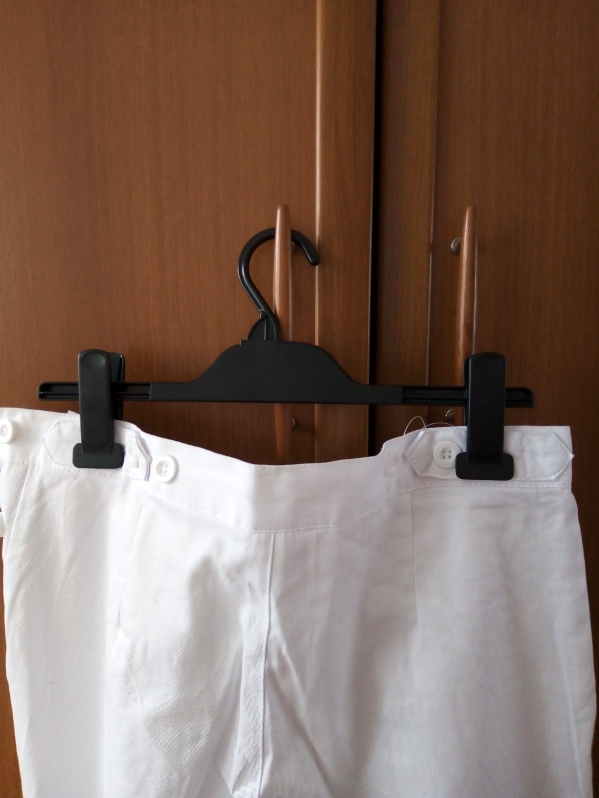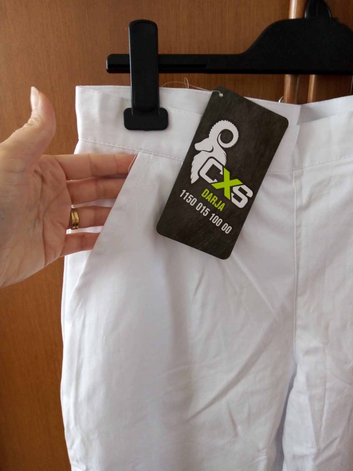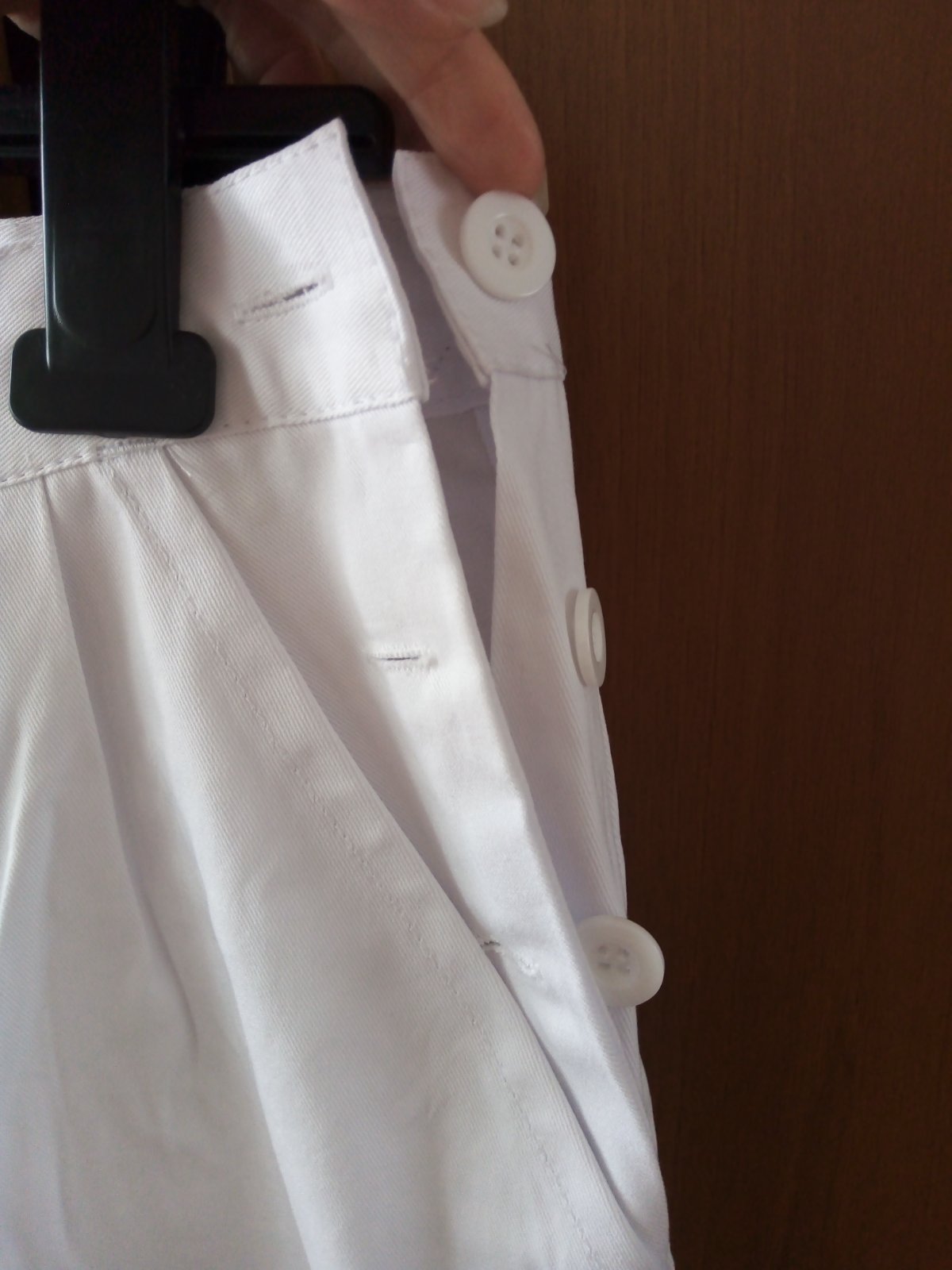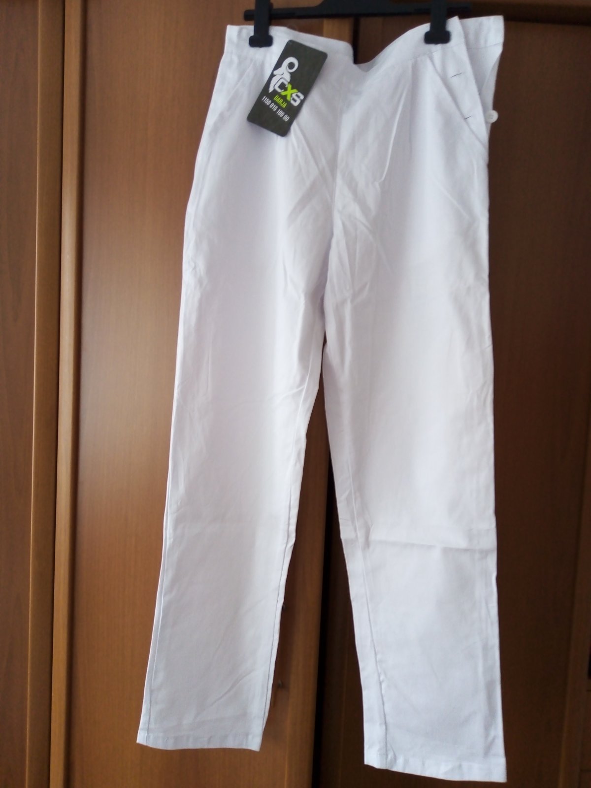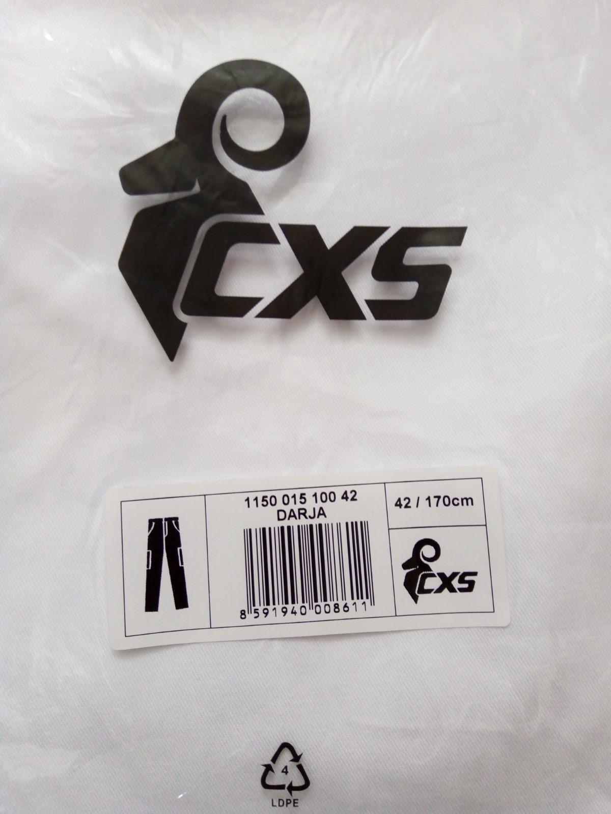 Nohavice sú nové, zabelené, ešte s visačkou. Využitie: zdravotnícke zariadenia, zdravot. školy, gastro prevádzky. Veľ. 42, materiál 100 % bavlna. Vpredu pevný pás, v zadnej časti regulácia na gombíky, zapínanie na boku na gombíky, dve bočné vrecká. Zn.CXS Darja.