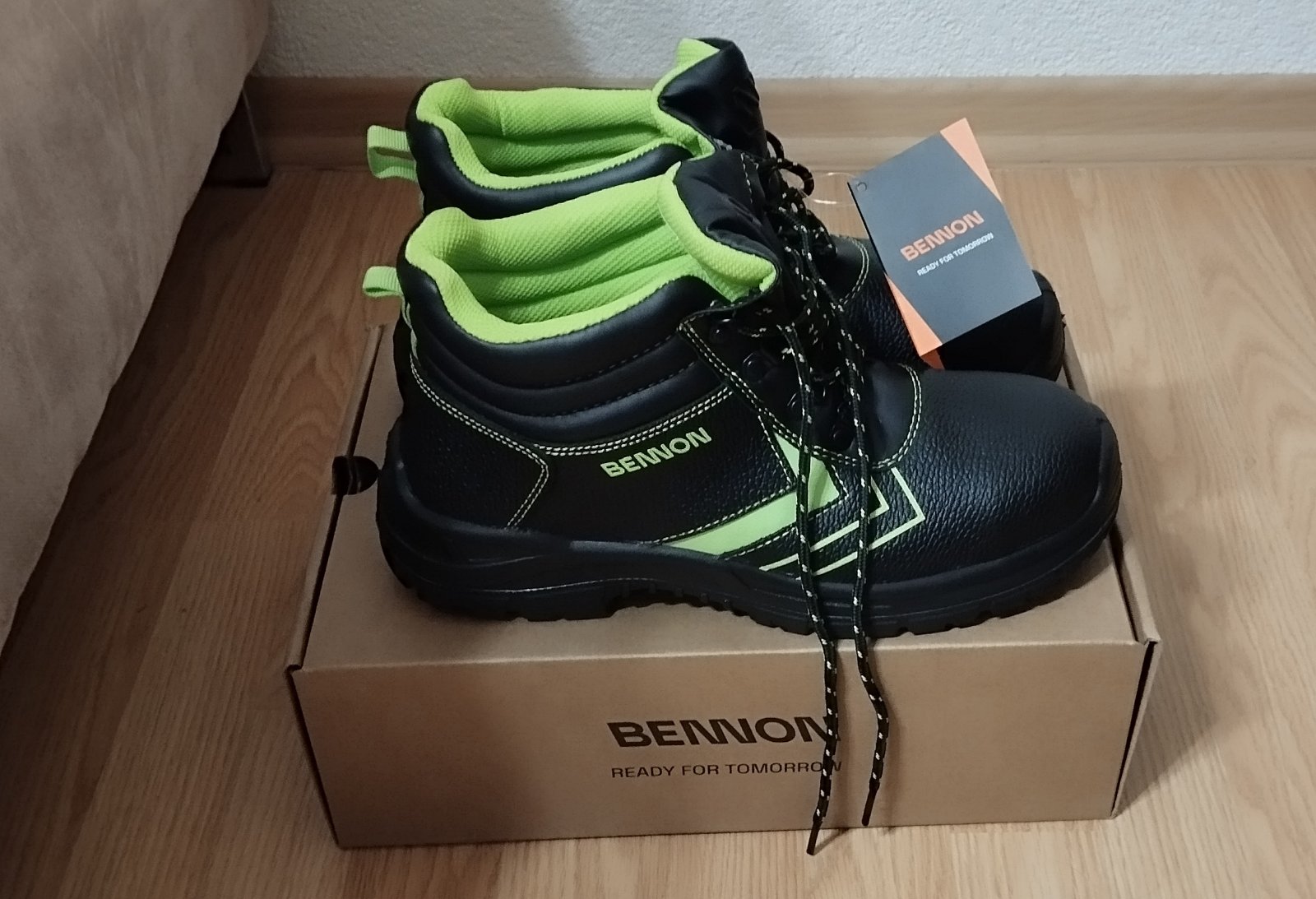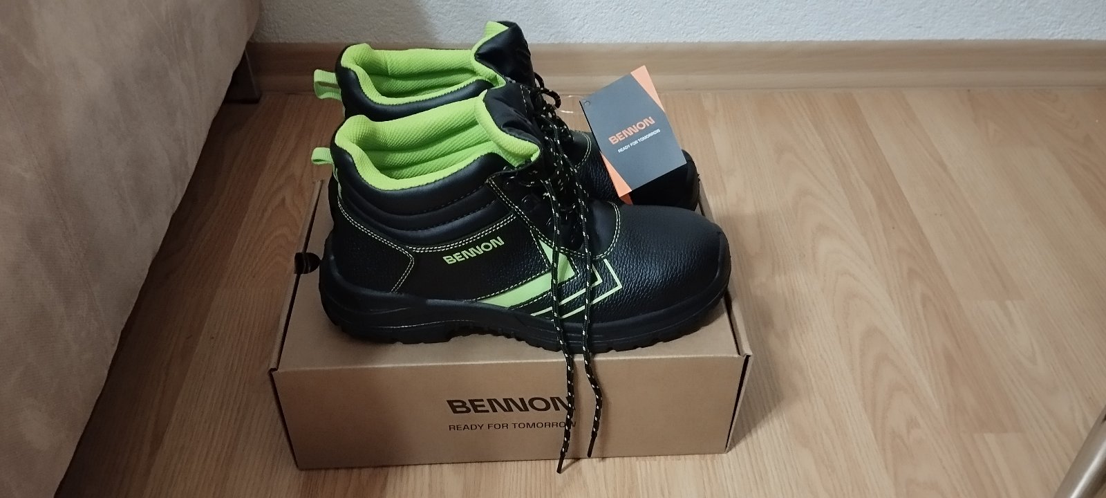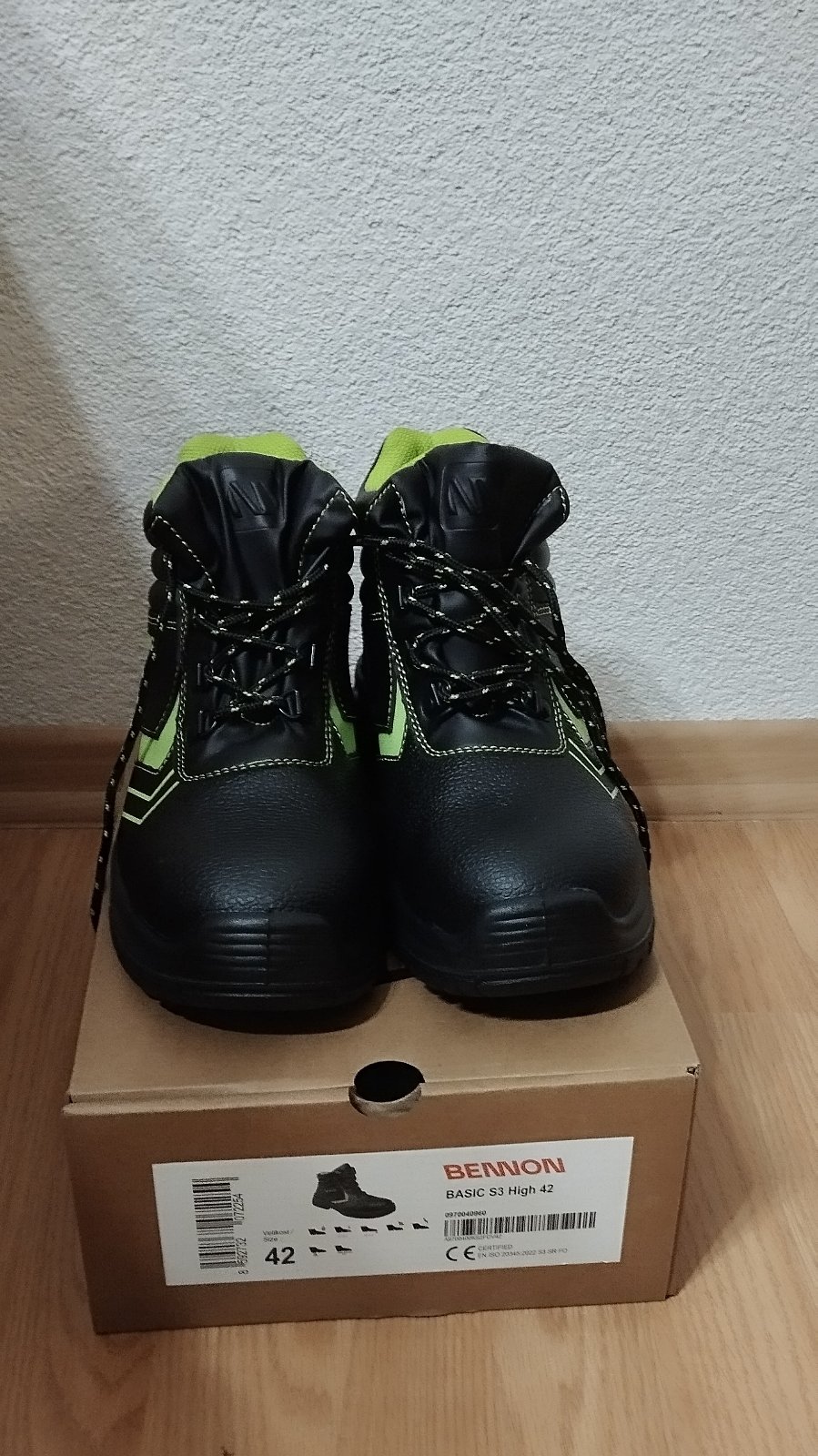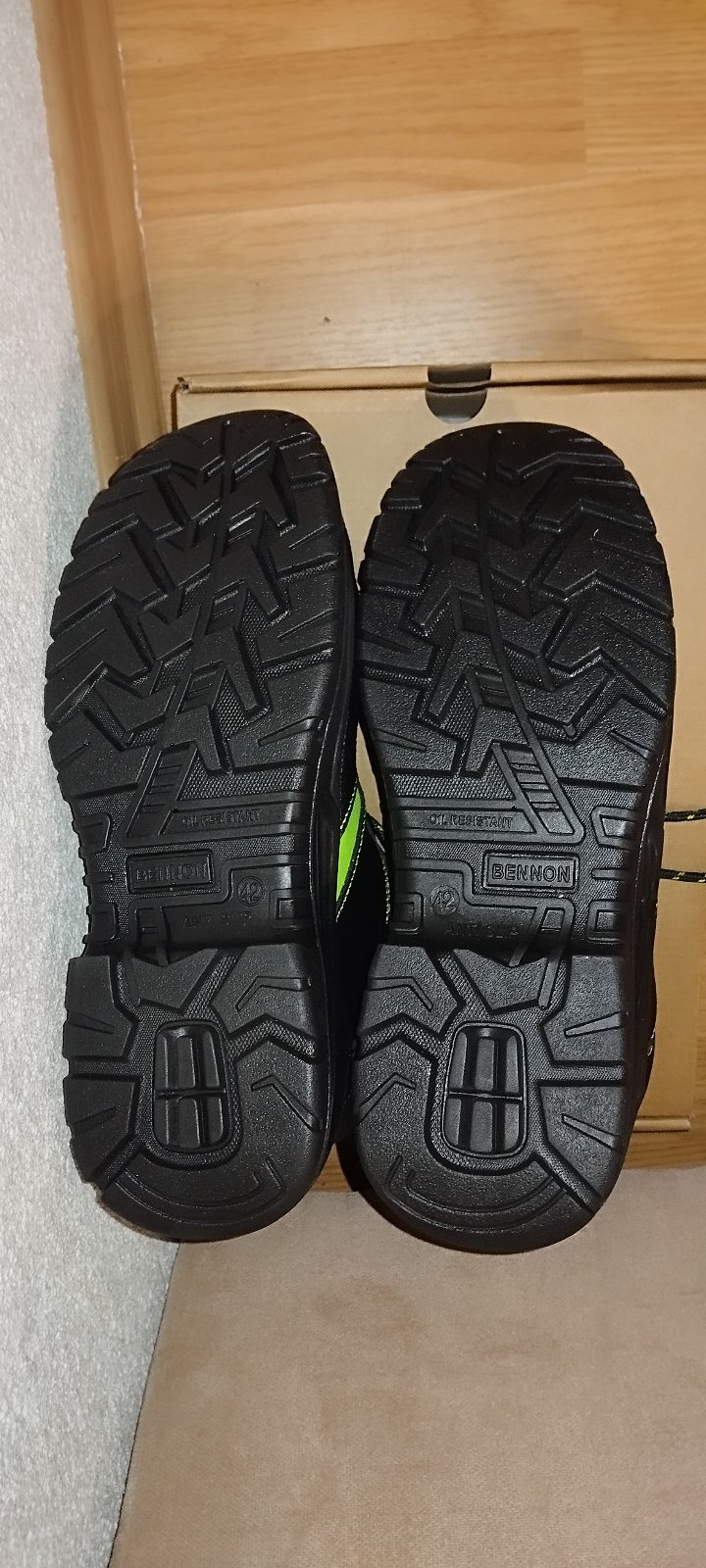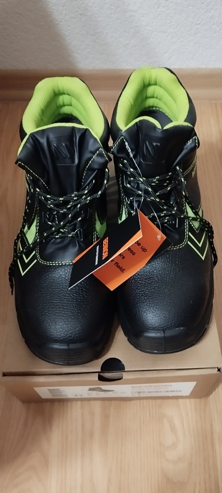 Nenosená pracovná obuv, uvedená veľkosť 44, ale je v nej hrubá vložka, tak reálna veľkosť je skôr 42, VD 28,5cm