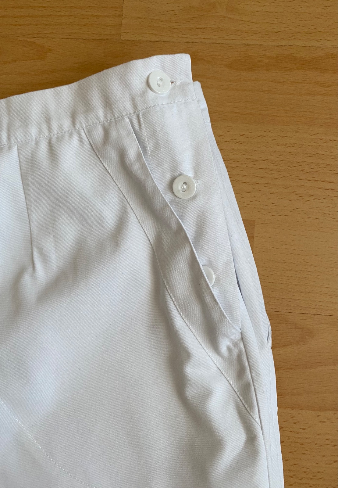 Nové, nenosené bez poškodenia. Farba snehovobiela. Zapínanie na boku na gombíky. Vpredu dve vrecká. Vzadu gumička. Kvalitný materiál, vyrobené na Slovensku. Značka Meditex. Na štítku veľkosť 40. Rozmery na foto.
