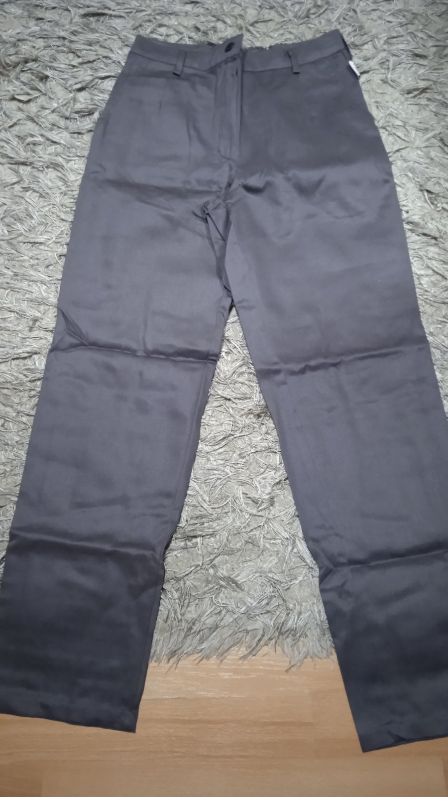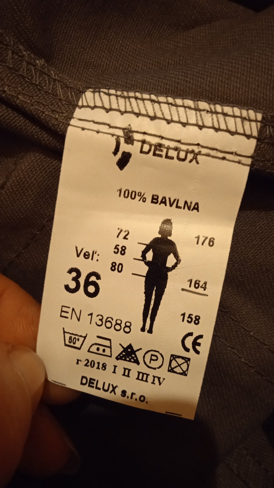 Montérky, nové, dĺžka 108 cm, obvod pásu bez natiahnutia 34 x 2 cm, v zadnom diely je guma povolí na 39 x 2 cm