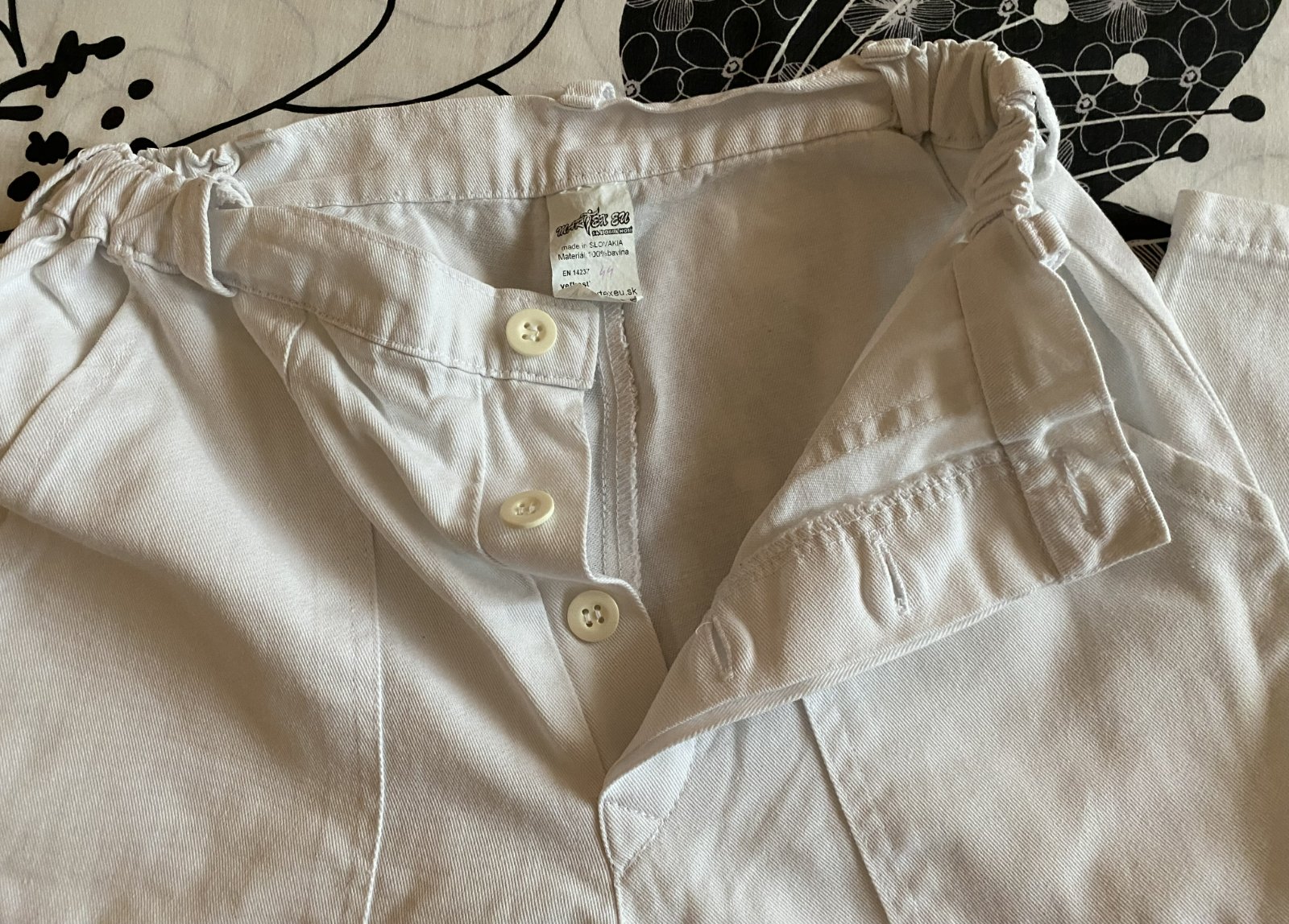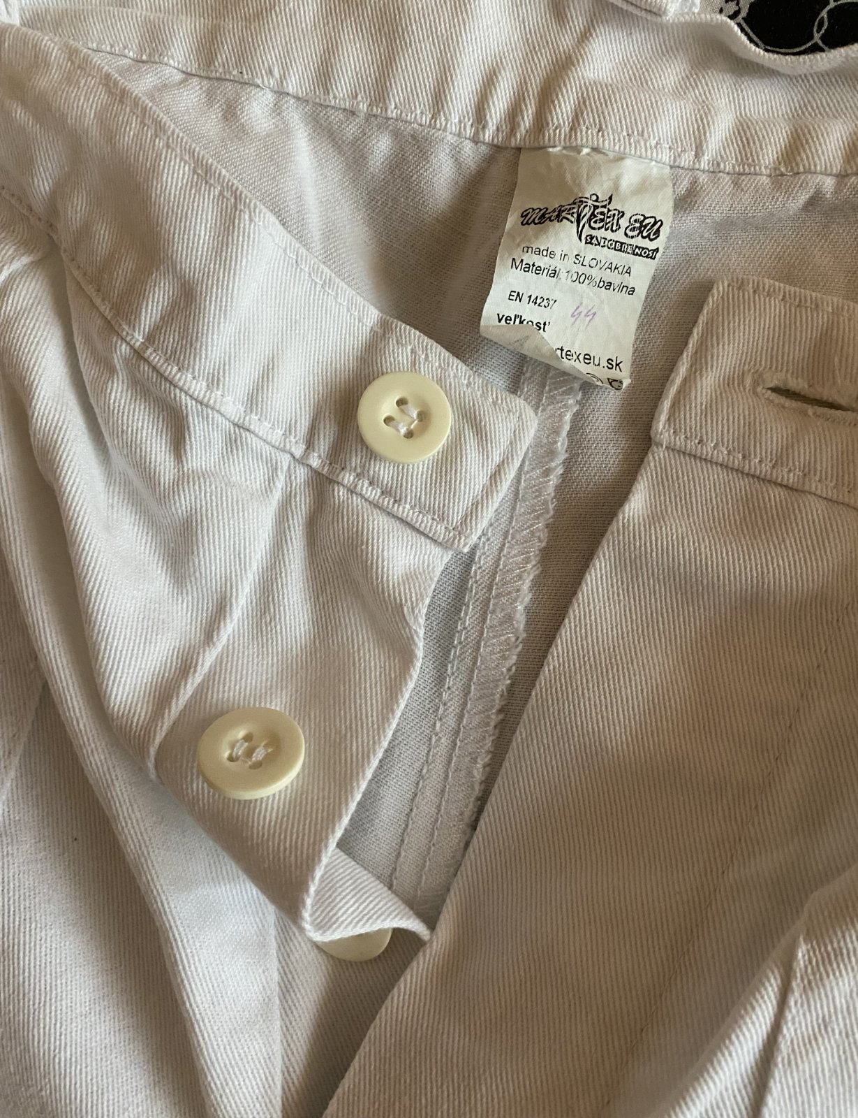 Zdravotnícke (pracovné) nohavice Martex v. 44, kvalitne prepracované, materiál 100% bavlna - pevná, nie tenká, pekná biela farba, 3 funkčné vrecká 2 vpredu, jedno vzadu, vpredu zapínanie na kryté gombíky, v páse na bokoch stiahnutie s gumičkami, pútka na opasok, asi 2-3 krát oblečené, bez poškodenia. Miery: vonkajšia dĺžka: 104cm, vnútorná dĺžka po sed: 75, predný sed: 28cm, zadný sed: 39.5cm, pás: 34-38cmx2, šírka stehna v mieste sedu: 29.5cmx2, šírka dolu: 23cmx2.