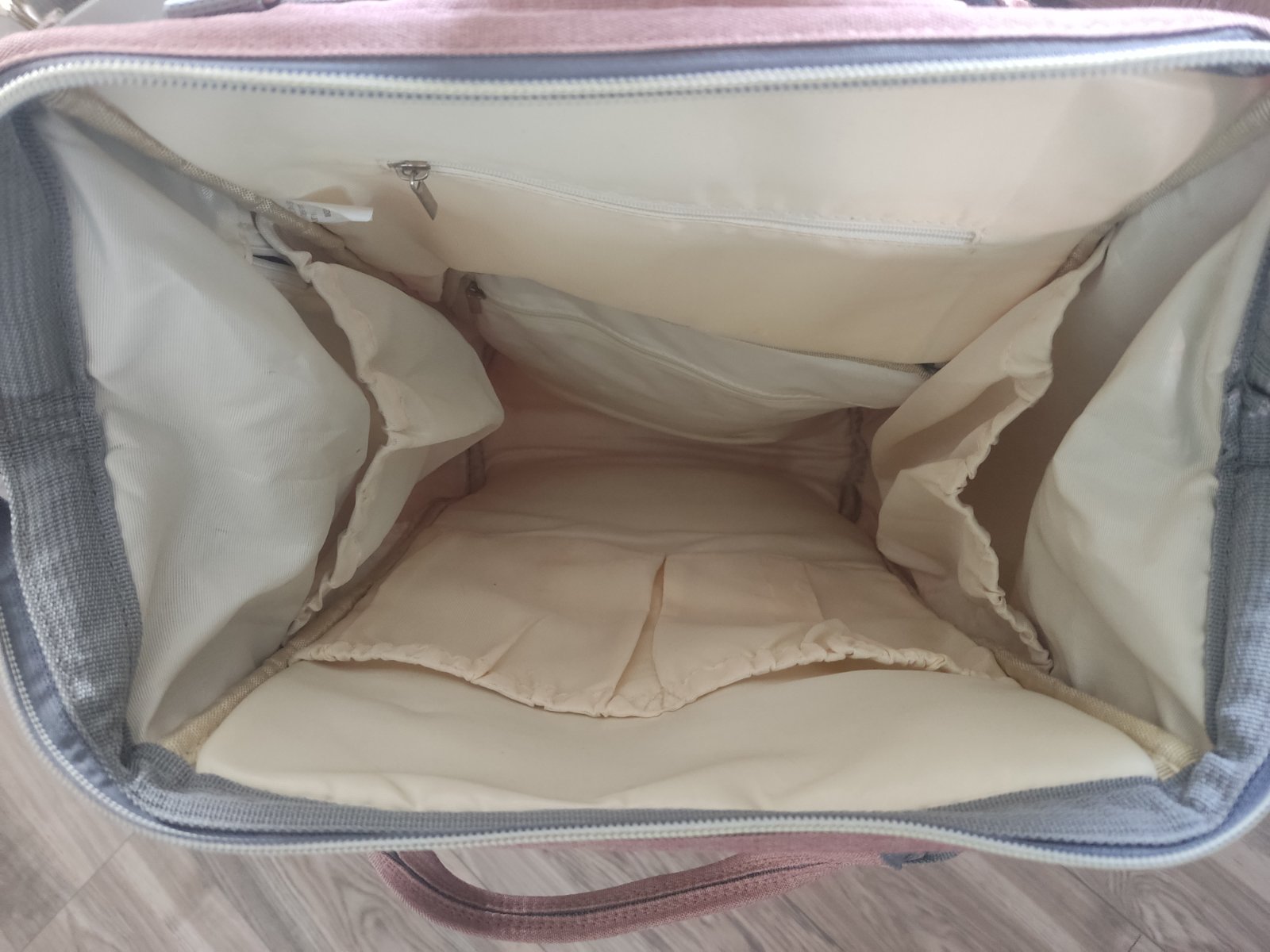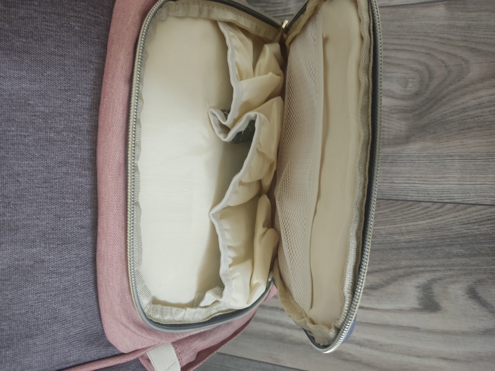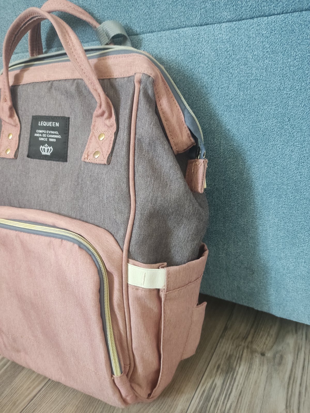 Batoh je vo velmi dobrom stave. Má niekoľko priehradiek, v každom vrecku je viacero ďalších vreciek pre organizáciu obsahu. Dá sa nosiť na chrbáte alebo zavesený na kočíku.