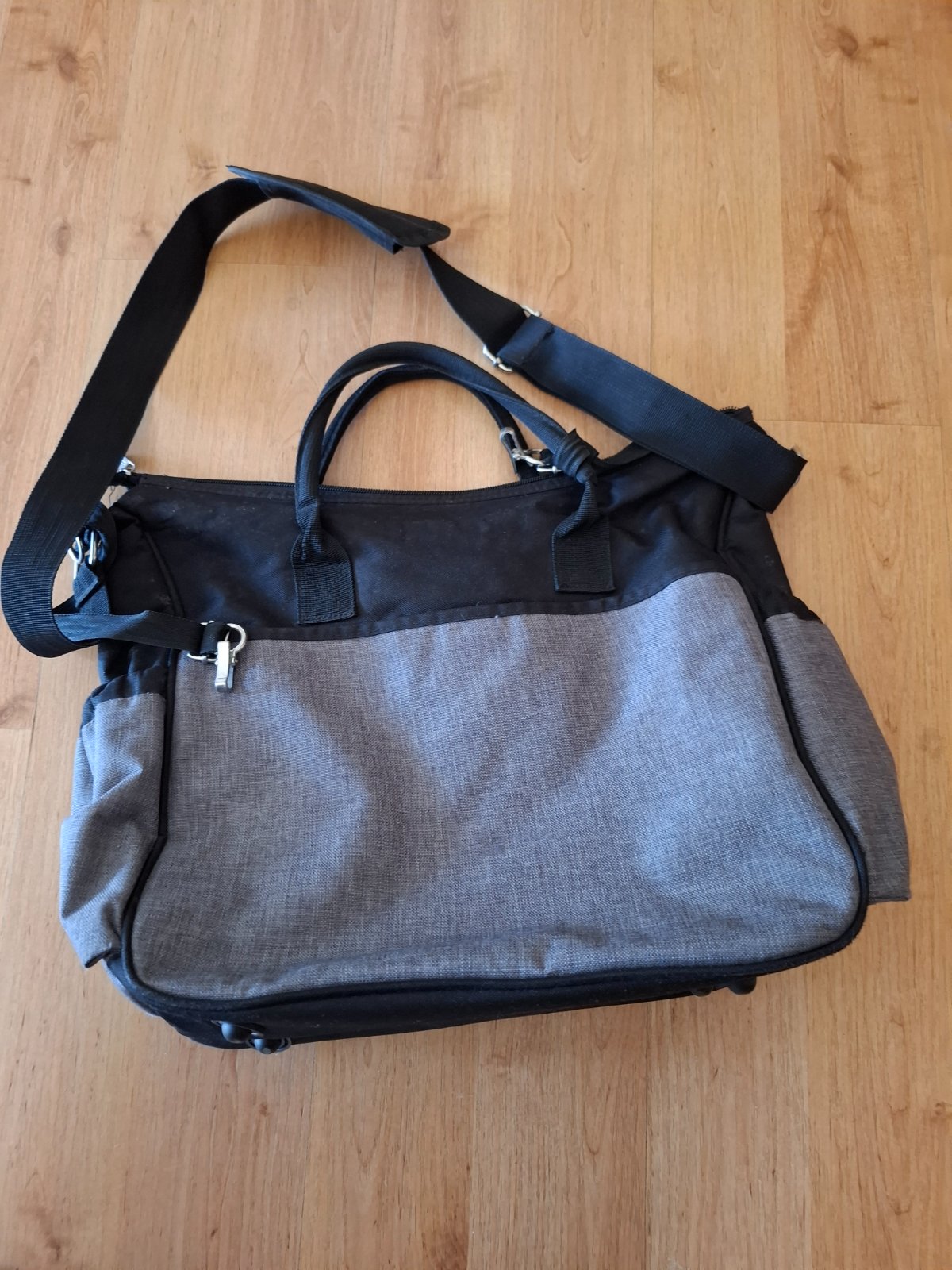Taška na prebaľovanie, bez poškodení. Minimálne používaná. Má veľa priehradok, z toho je 5 na suchý zips. Má dlhý nastaviteľný popruh s ramennou vložkou 2 pevné, krátke uši. Má 2 bočné popruhy pre ...