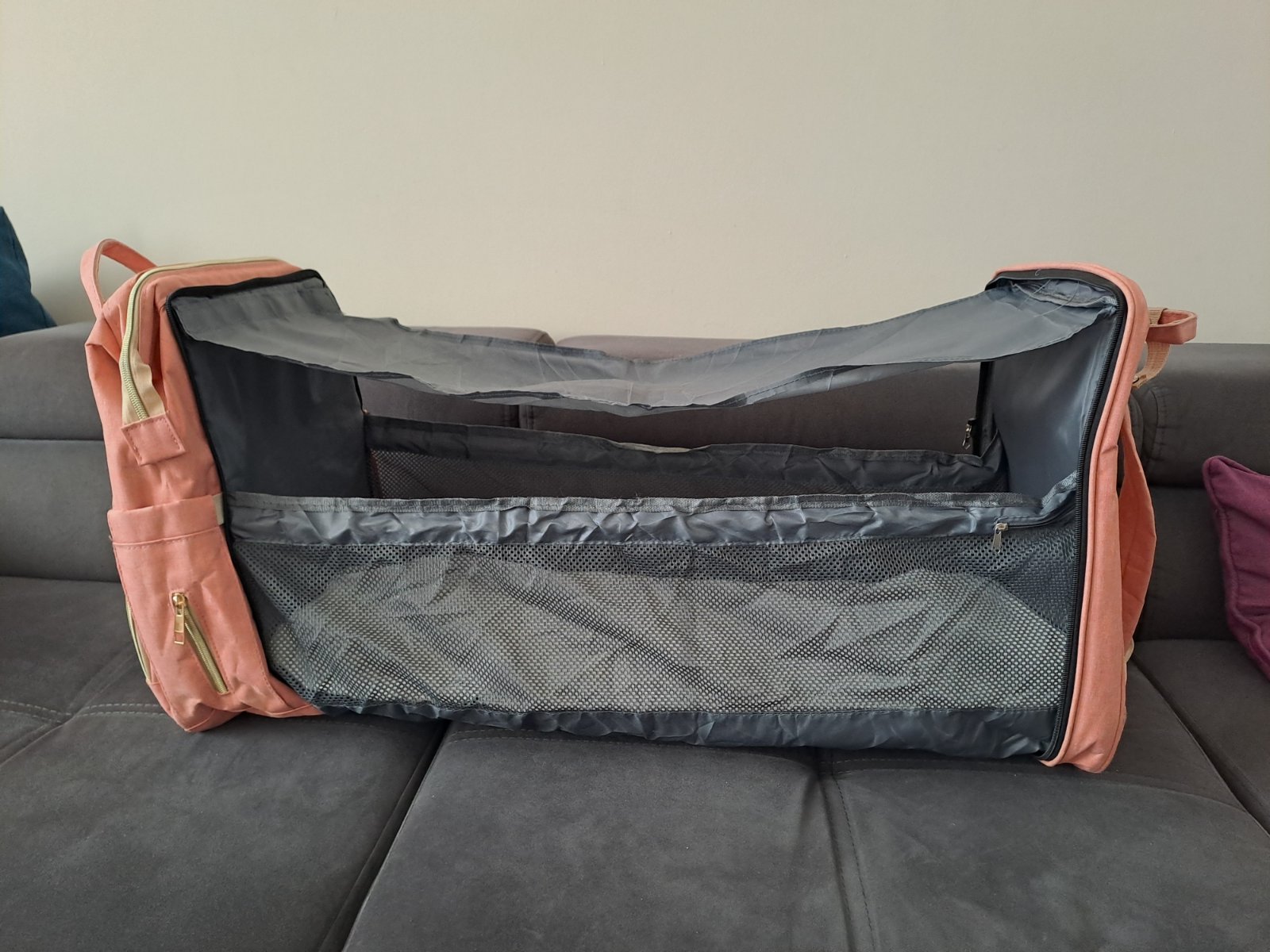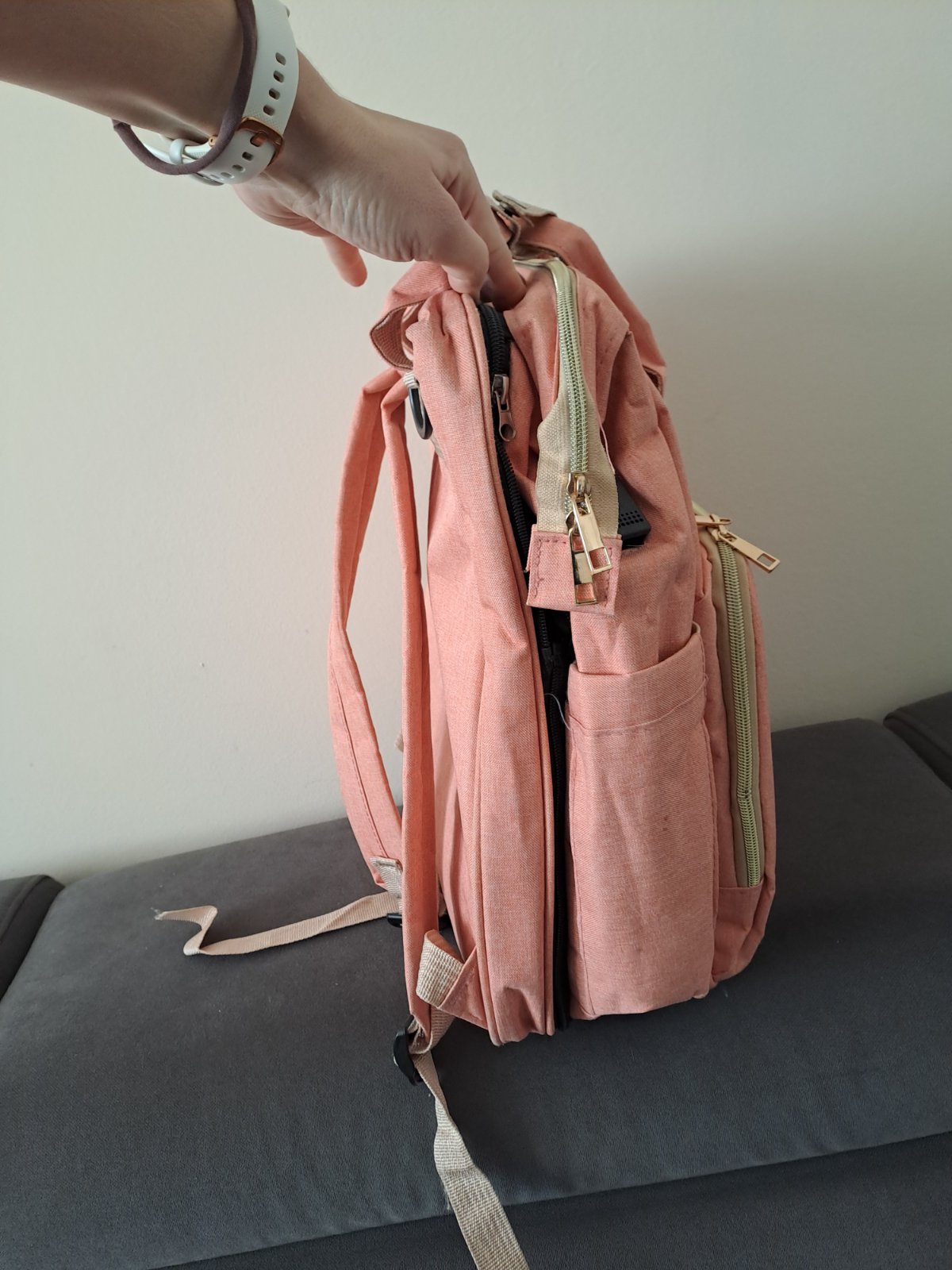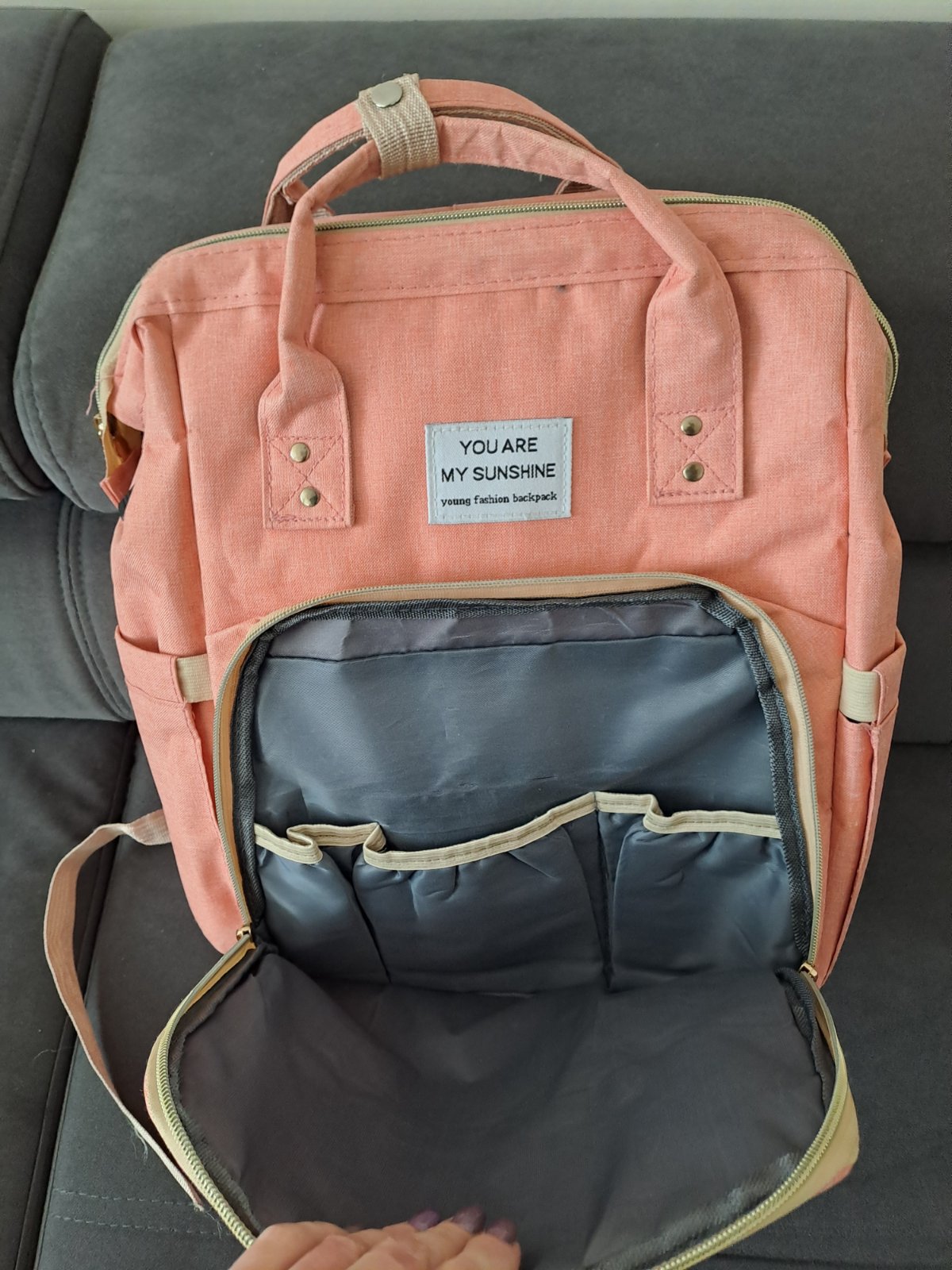 Batoh má niekoľko priehradiek. Dá sa nosiť na chrbáte alebo zavesený na kočíku. Sám o sebe je príjemne ľahký, látka je pevná, pekne drží batoh tvar.