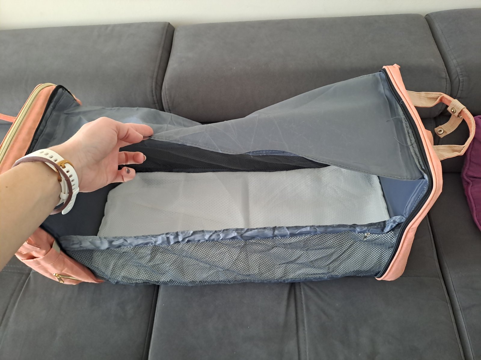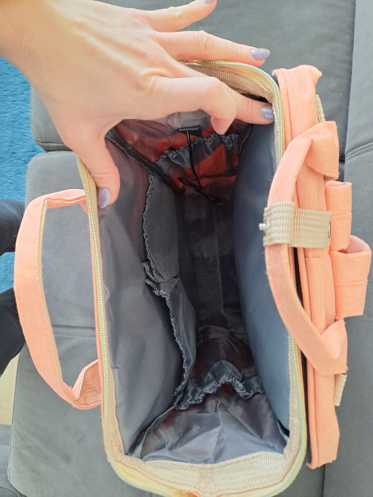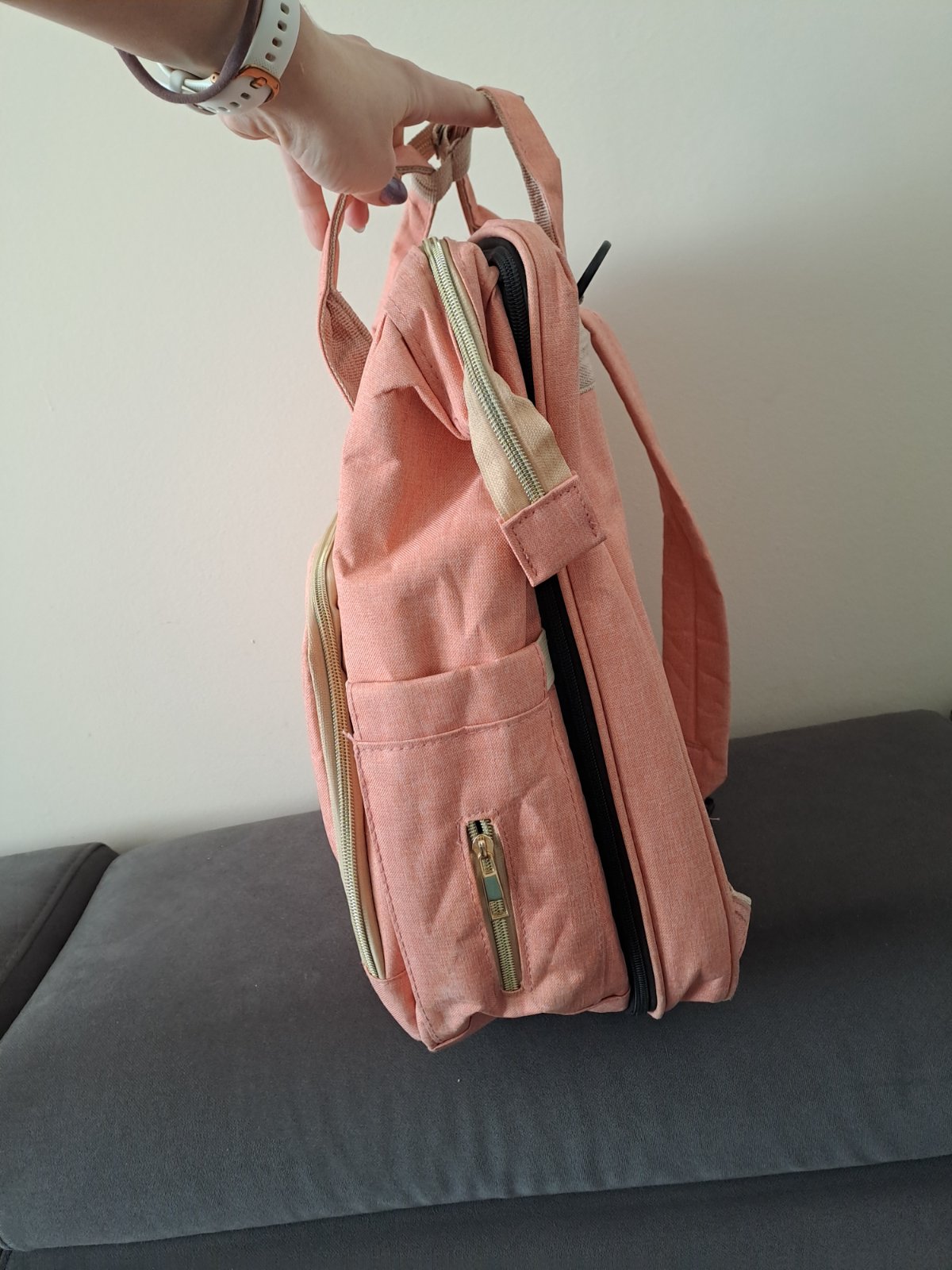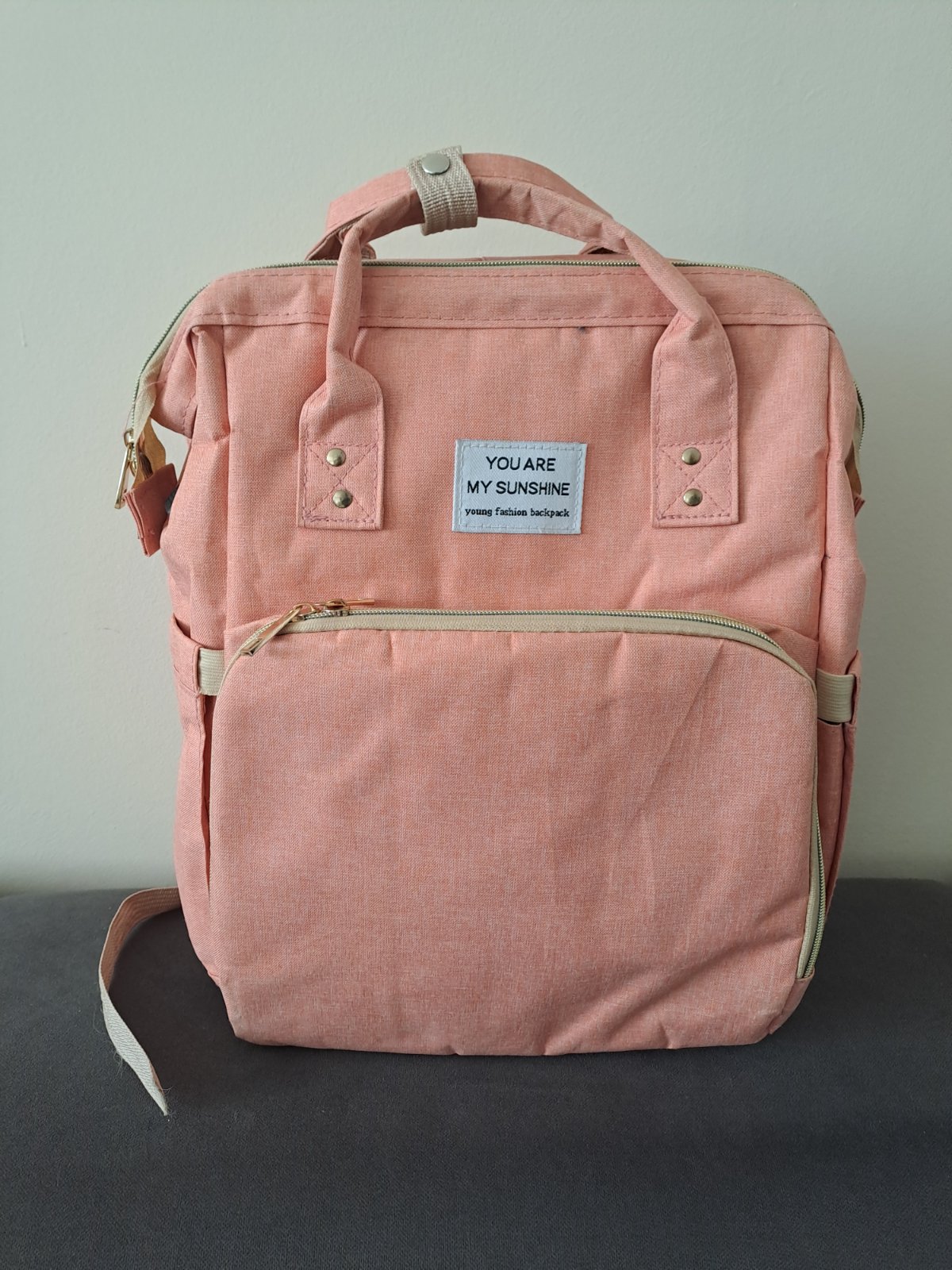Batoh má niekoľko priehradiek. Dá sa nosiť na chrbáte alebo zavesený na kočíku. Sám o sebe je príjemne ľahký, látka je pevná, pekne drží batoh tvar.