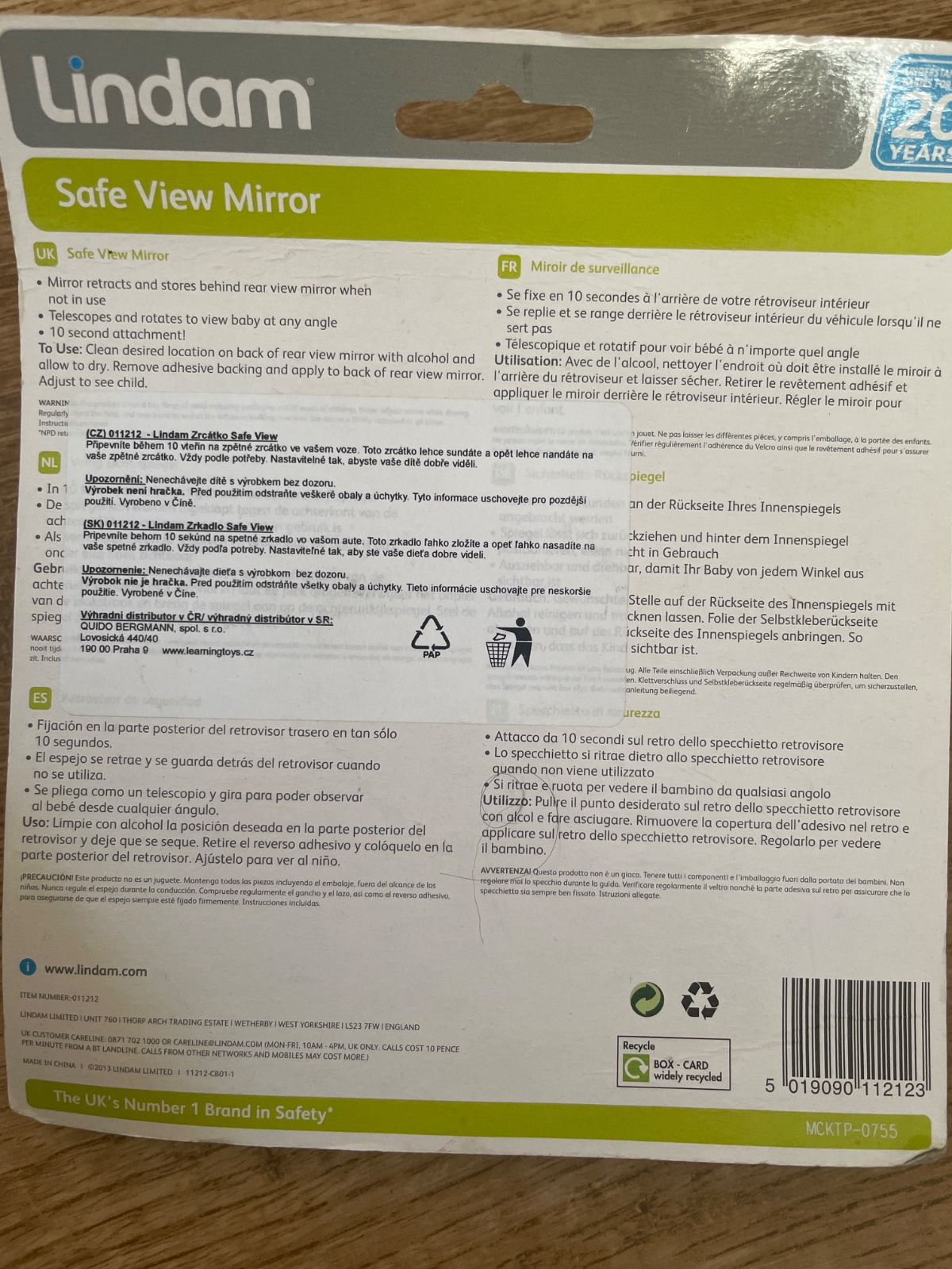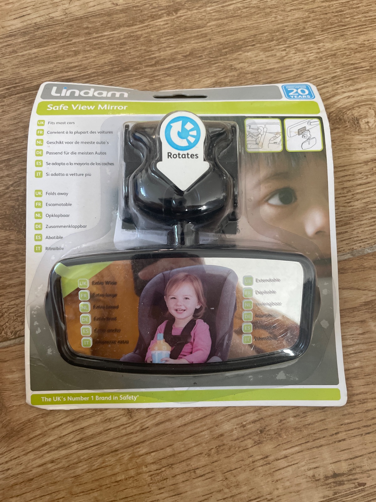 Spätné zrkadlo na sedačku auta, aby bolo možné vidieť na bábätko v protismernej autosedačke. Pripevňuje sa nastaviteľným popruhom na opierku hlavy. Má jemné škrabance. Je z plastu, takze sa nerozbije.