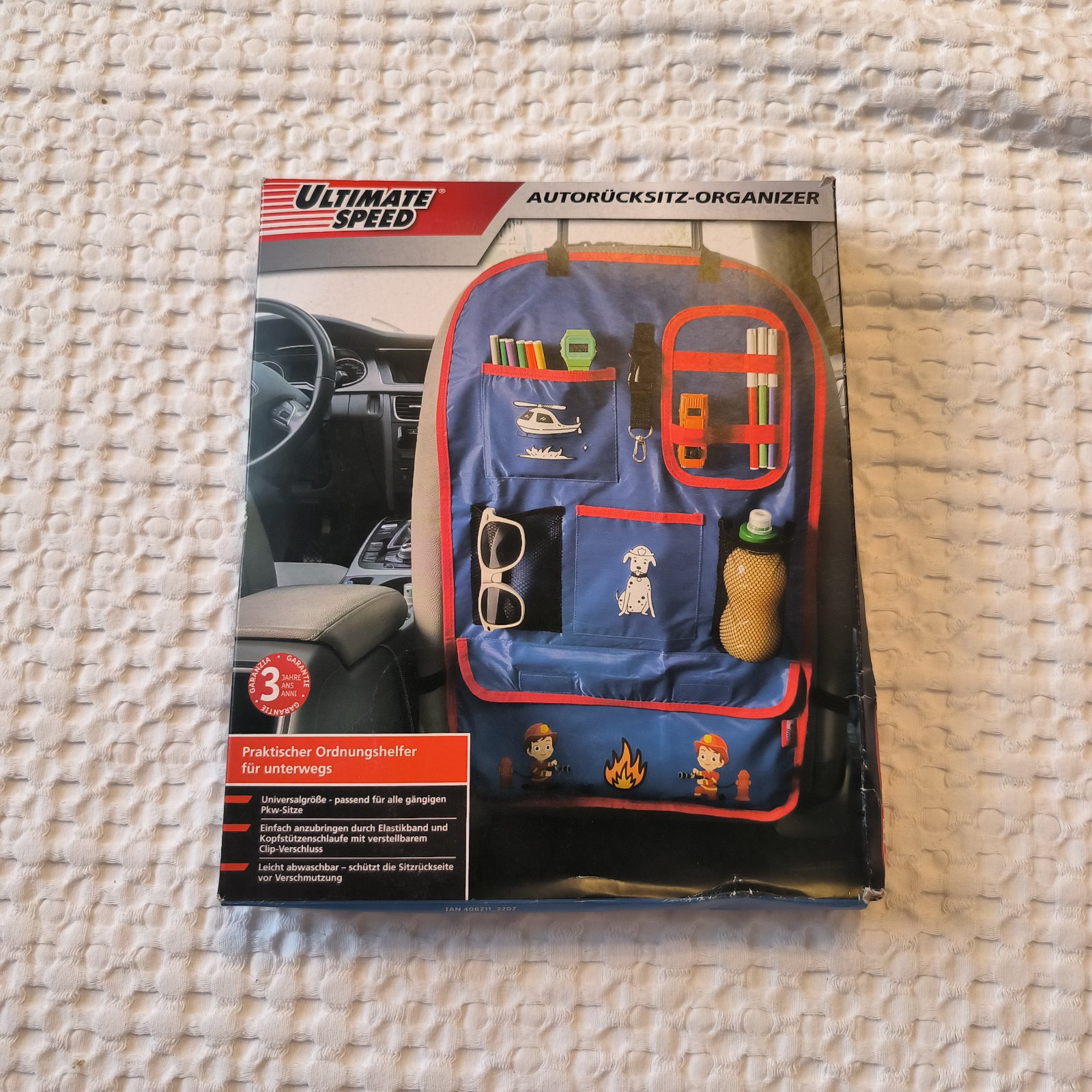 Materiál: polyester. Dá sa umiestniť na akúkoľvek zadnú stranu sedadla v automobile. Pripevňuje sa pomocou nastavitelných popruhov s rychlosponami. Možné ručne čistit vodou. Rozmer: 58 x 35cm.
