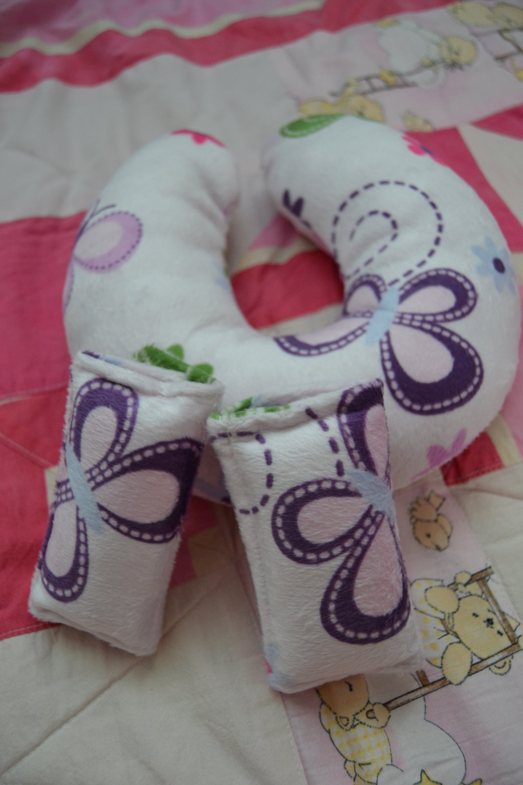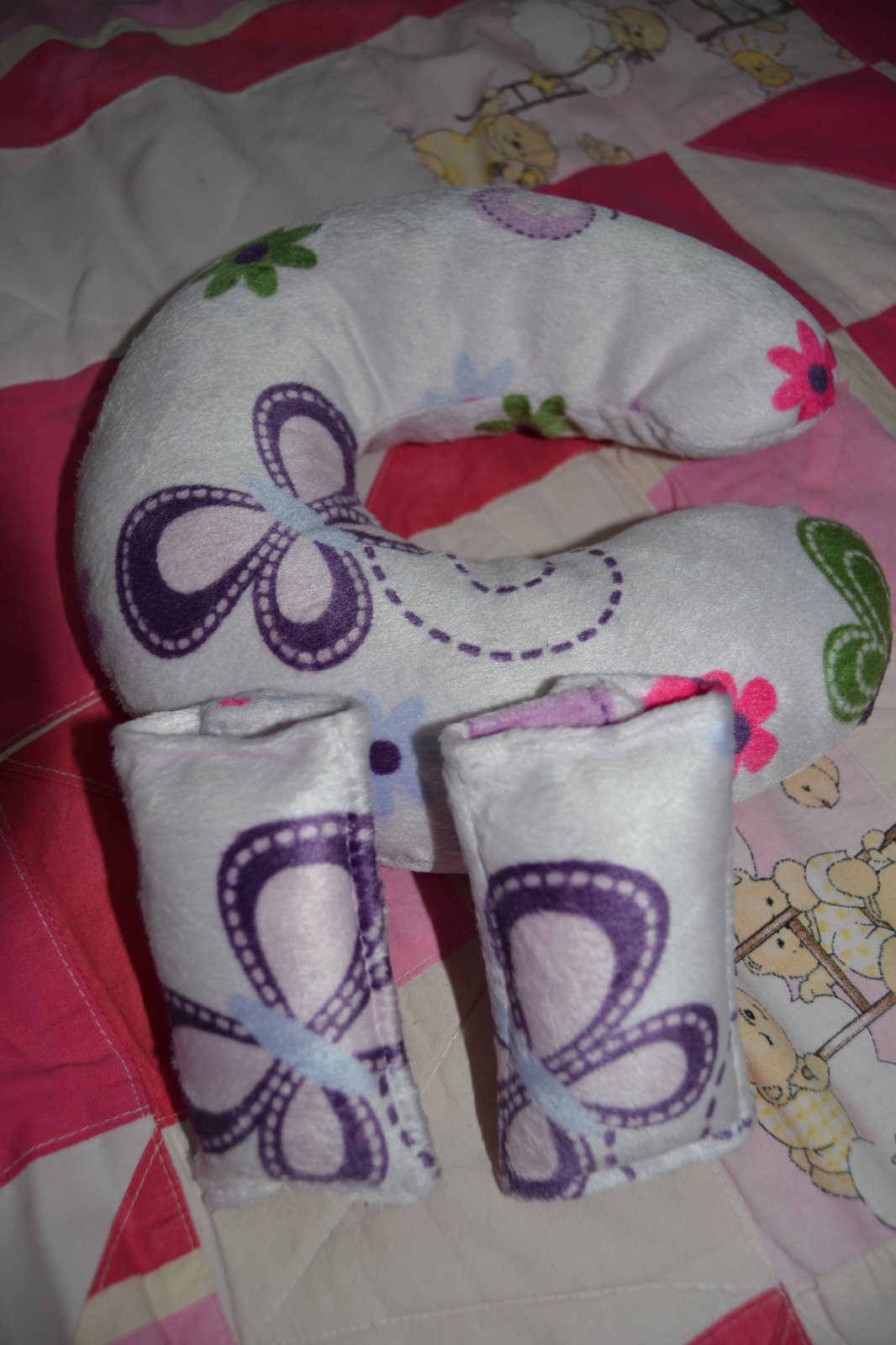 SkladomCestovný set 3ks, obsahuje nákrčník-dĺžka 62 cm a chrániče na bezpečnostný pás, zapínanie na suchý zips – veľkosť 11 cm. Vhodný pre deti od 2-4 rokov. Materiál výplň PP bavlna / polyester. Farba jemno ružová s kvetinkami.