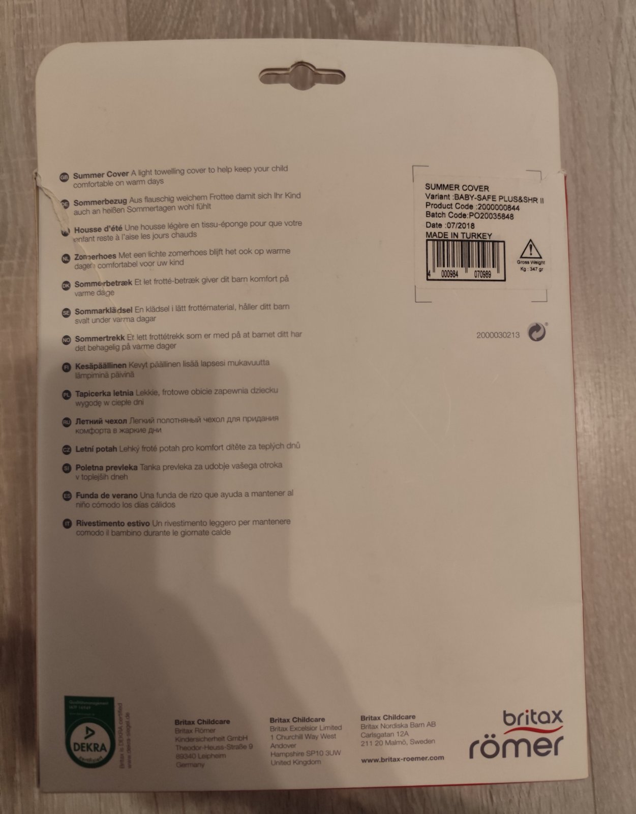 Letný poťah na autosedačky radu Baby-Safe Plus, II, SHR II vyrobený z ľahkého, príjemného froté materiálu (80% bavlna, 20% polyester), ktorý dobre saje vlhkosť a chráni tak dieťa pred nadmerným potením či prehriatím. Zároveň ochraňuje autosedačku pred znečistením. Poťah možno bez problémov prať na 60 ° C.