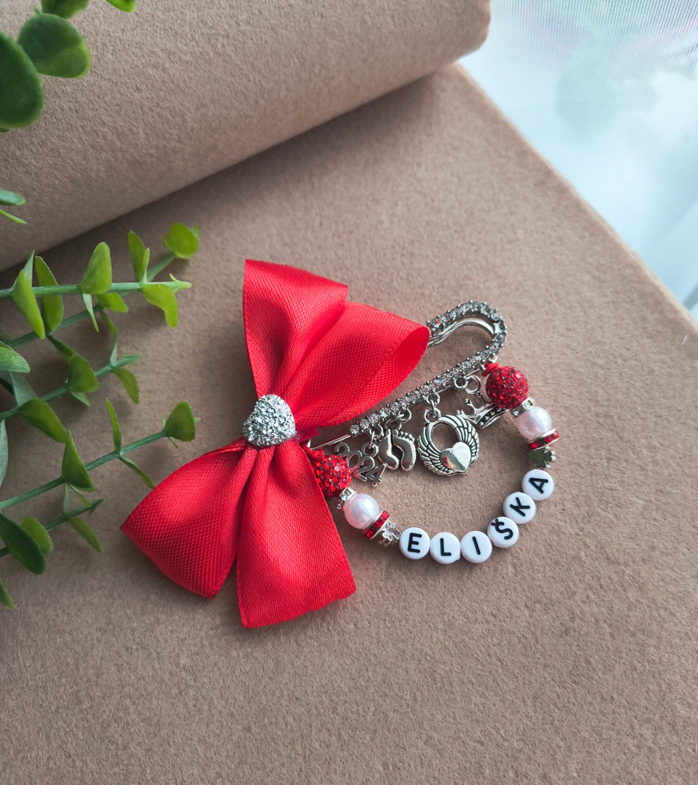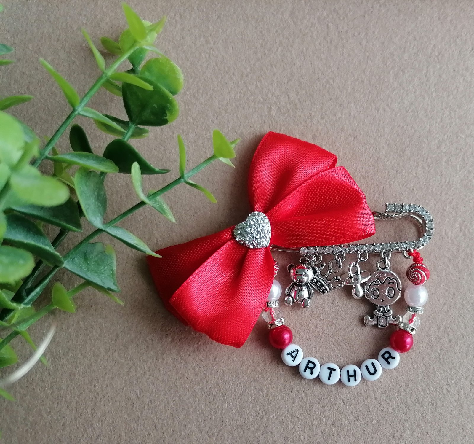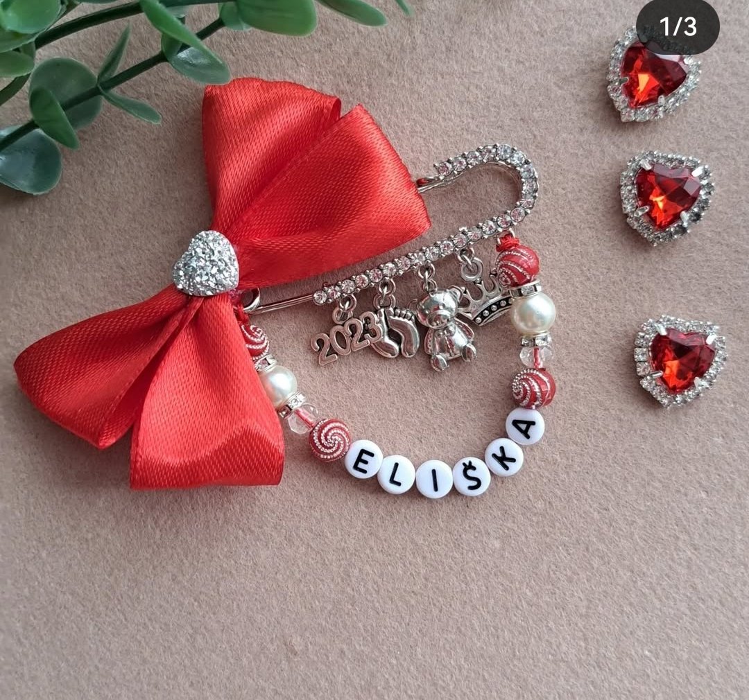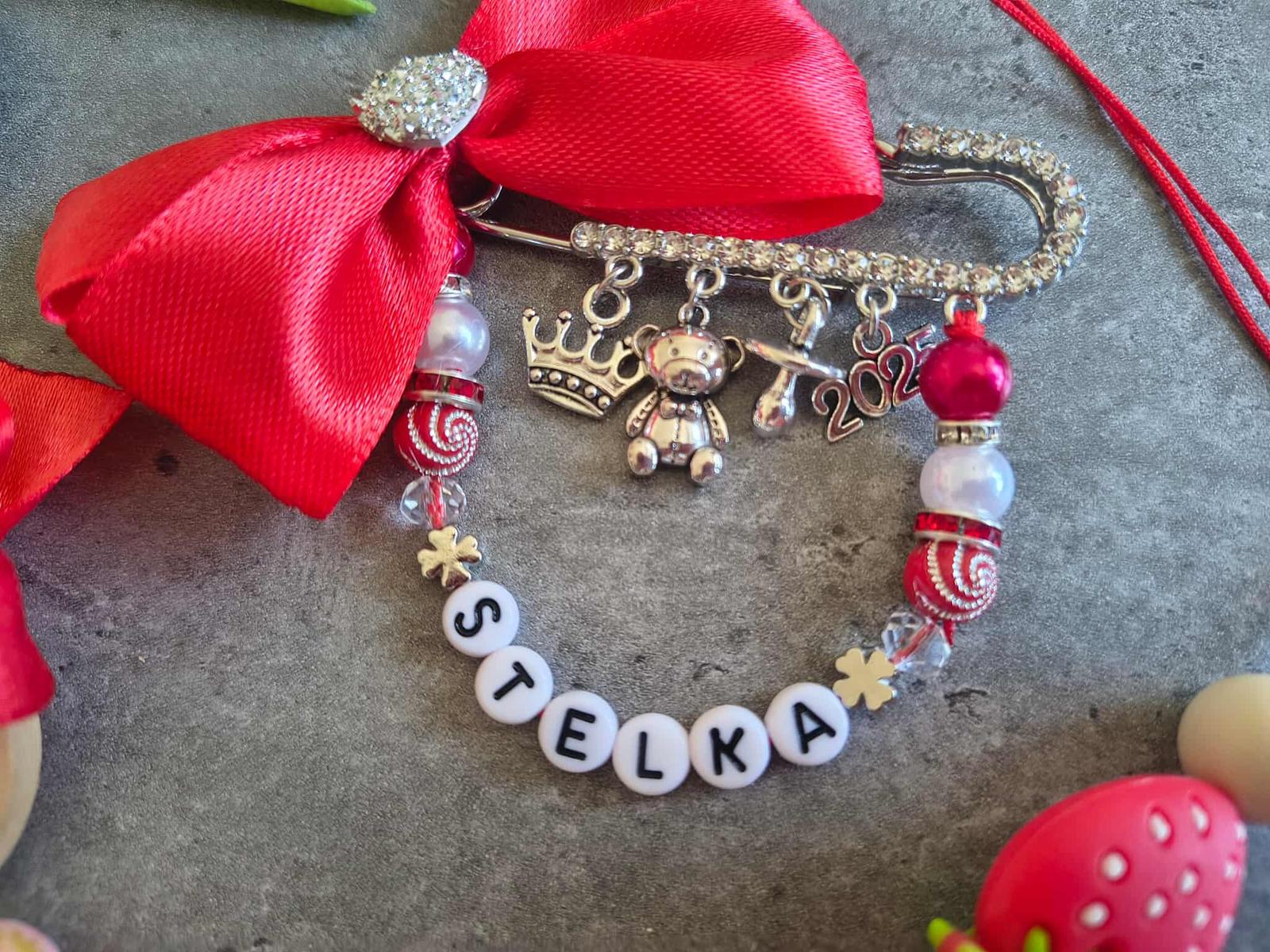 Mašlička na kočík s okrasnou brošňou, privesky na zelanie. V ponuke aj obyc.brošňa(bez kamienkov). Rozmer 7x8cm. Cena 6,90e/5,90e.