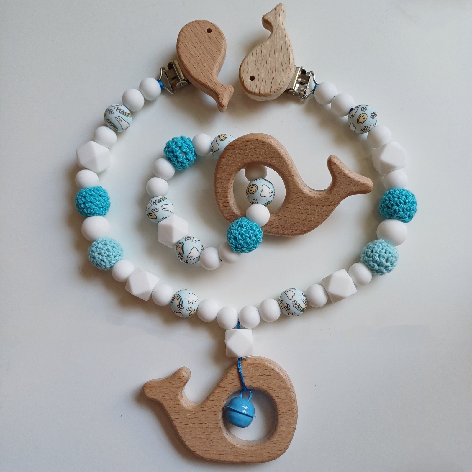 🔹 Hryzadlo s drevenou veľrybou – pomáha pri prerezávaní zúbkov a podporuje úchop malých ručičiek.