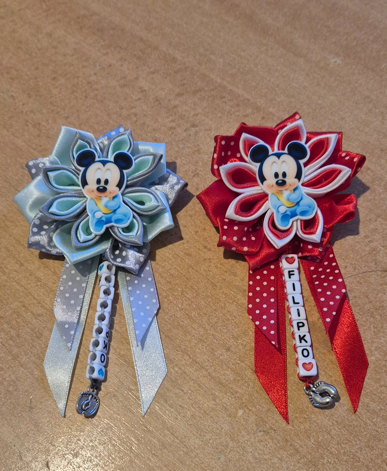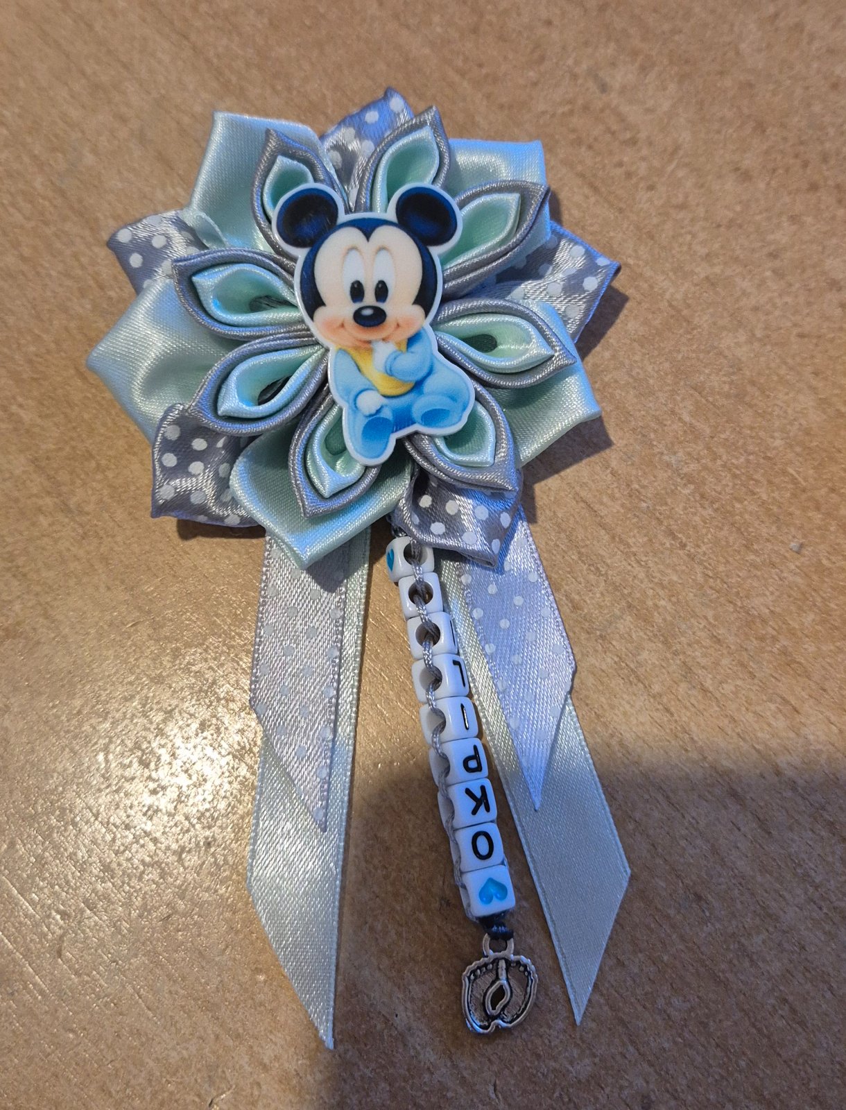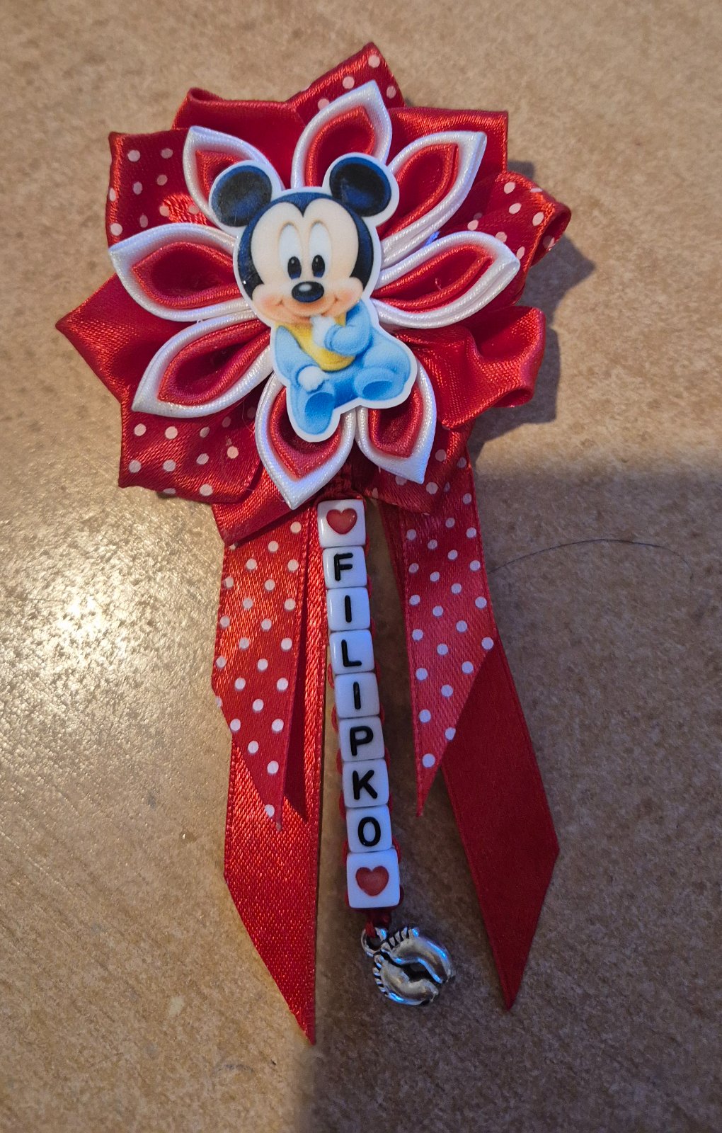 Ručne robený kvietok na kočík s menom vášho dieťatka. Vyrobím v akejkoľvek farbe podľa vášho želania. Miesto Mickeyho môžem dať Minie, Hello Kitty, lienočku štrasovu ozdobu... Cena od 5€.