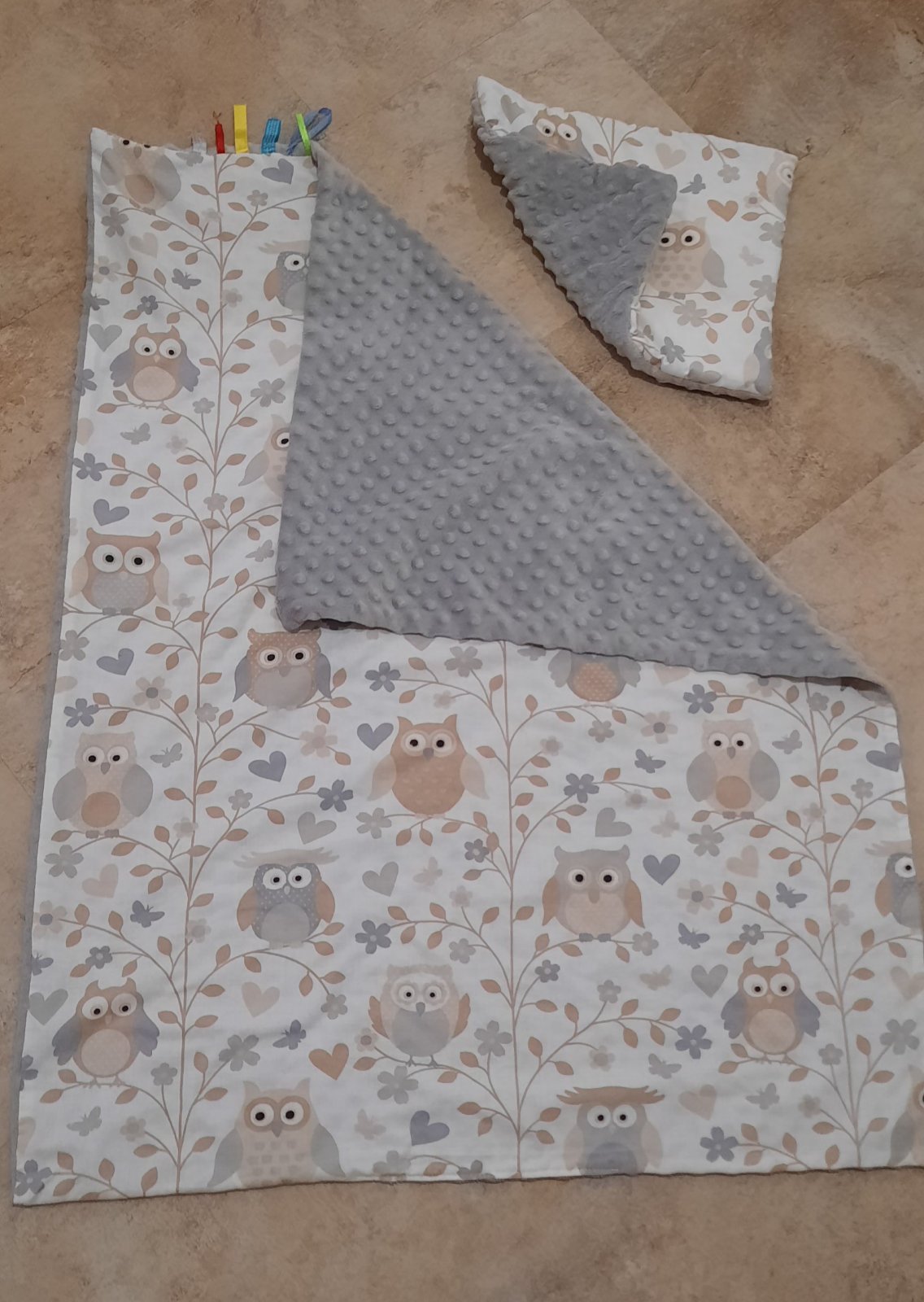 Vankus a deka do kocika/postielky. Z jednej stranky je minky a z druhej obrazok sovy. V super stave.Vankus 28x33cm a deka 98x74cm.