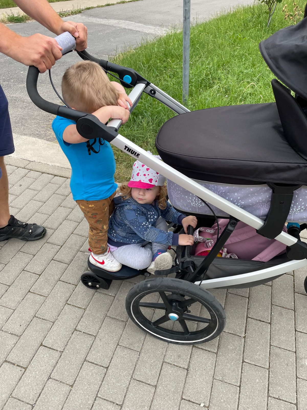 Predam pouzivany skejt ku kociku, pouzivali sme s Thule Urban Glide aj s Twistshakom, z toho usudzujem, ze pasuje asi na vsetky kociky. Ma par skrabancov, nosili sme ho radi.
