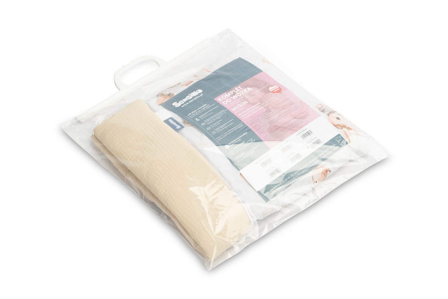 Súprava obsahuje vankúšik a deku vyrobené z príjemného na dotyk mušelínu a bavlny. Súprava je ideálna do kočíka, postieľky alebo ako mäkká podložka pre bábätko. Samotný vankúšik môže slúžiť ako maznáčik. Súprava je vyrobená z dvoch materiálov – vnútorná strana je zo 100 % bavlny, vonkajšia vrstva je mäkký mušelín.
