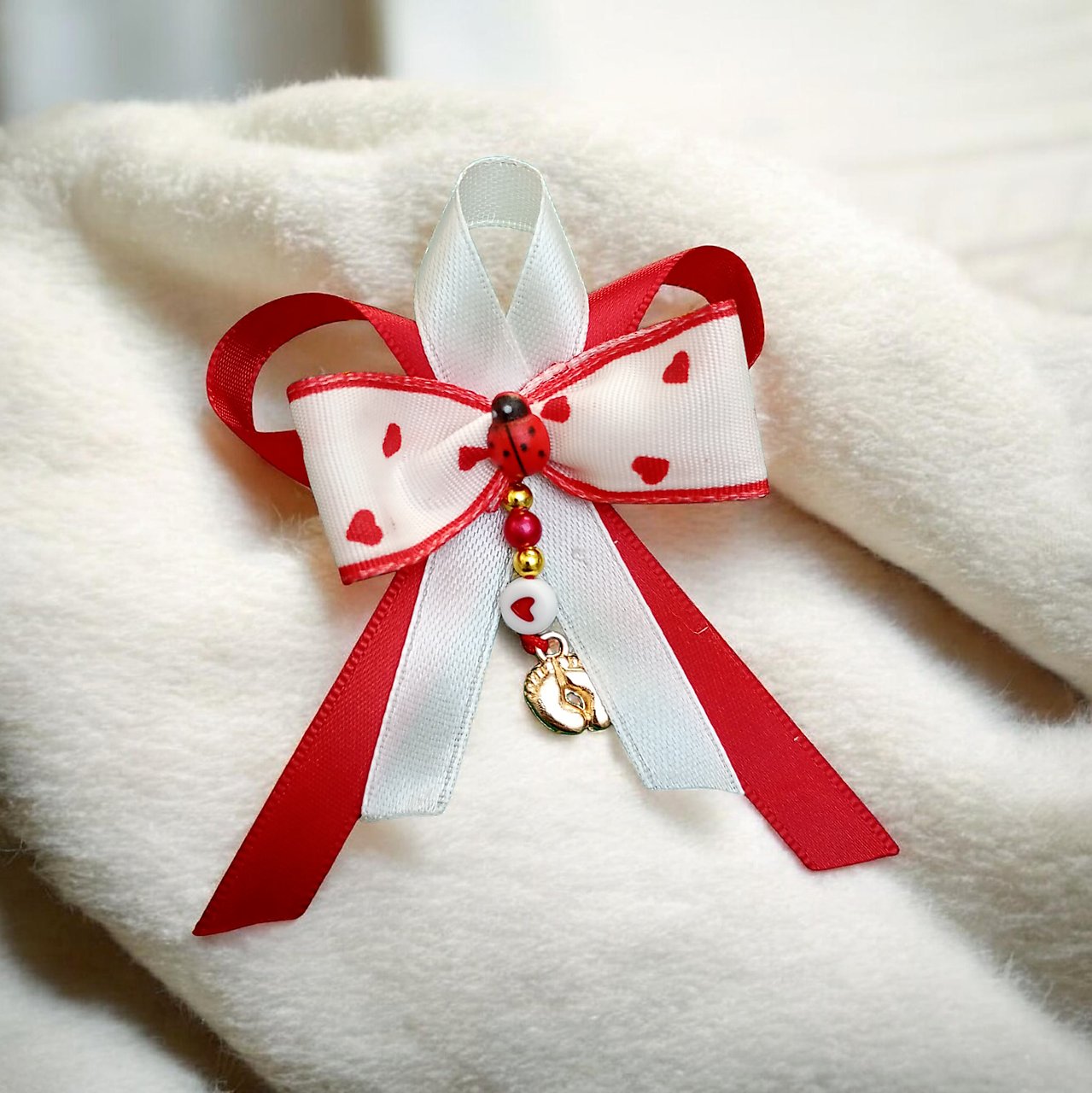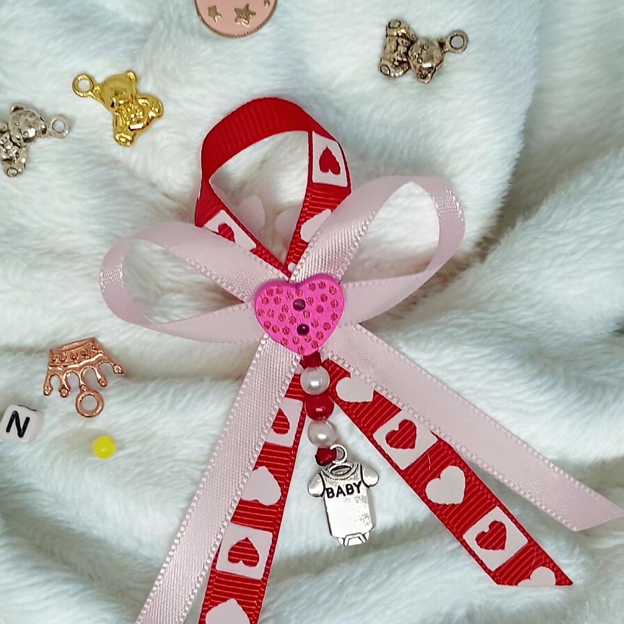 Mašlička na kočík alebo postieľku je naozaj krásny a osobný darček, ktorý poteší každú mamičku. Zapínanie na zicherku zabezpečuje jednoduché a bezpečné upevnenie. Táto konkrétna mašlička je dostupná presne tak ako je na fotke aj s konkrétnym príveskom.