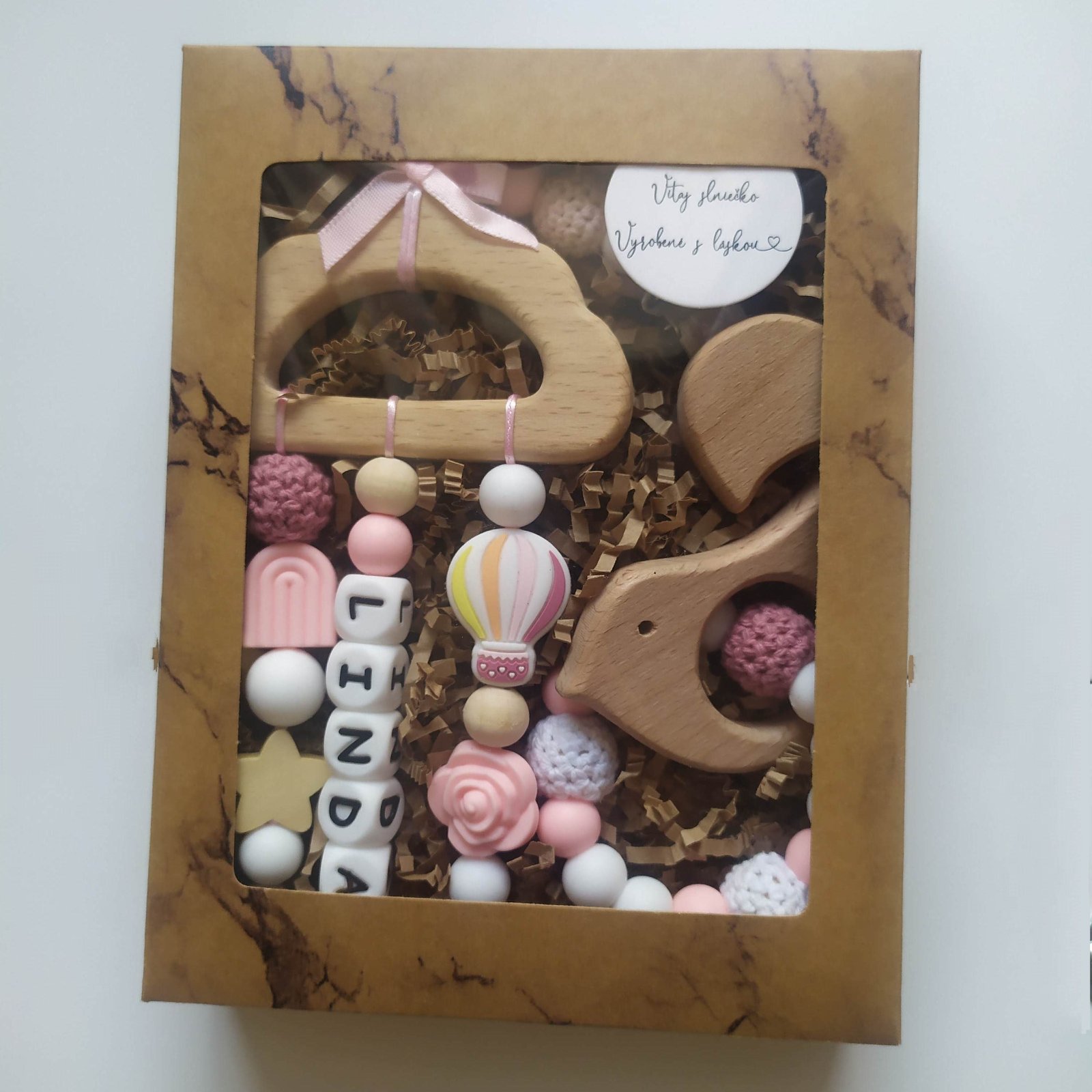 Čokoľvek môžem prispôsobiť - meno, farbu, klipy, ozdoby alebo samotné guličky. Vyrobím aj samostatné alebo môžem vytvoriť sadu - retiazka na cumlík (s menom alebo bez mena), hryzadlo (s dreveným zvieratkom alebo bez zvieratka), menovka na kočík (slzička, obláčik alebo iné zvieratko), ozdoba na kočík (slzička alebo obláčik bez mena), retiazka na kočík (s rolničkou a dreveným zvieratkom alebo aj bez zvieratka a rolničky), retiazku na vajíčko (s dreveným zvieratkom a rolničkou), a kľúčenku pre mamu (drevené alebo silikónové písmená, aj bez nápisu mama, alebo aj s menom dieťatka). Vyrobím aj darčekové koše na krstiny, plienkové torty a rámčeky s údajmi dieťaťa.