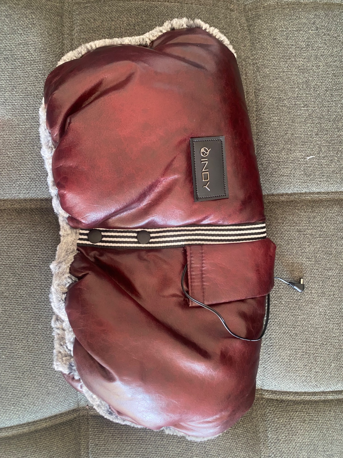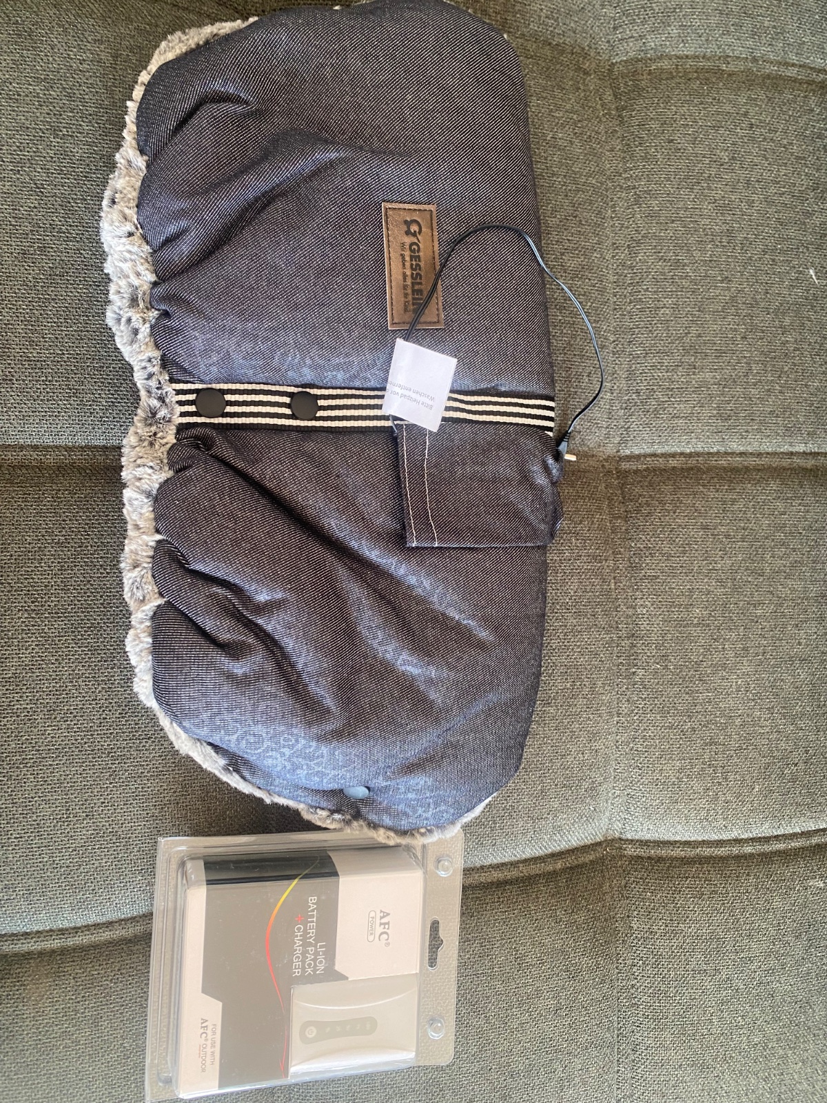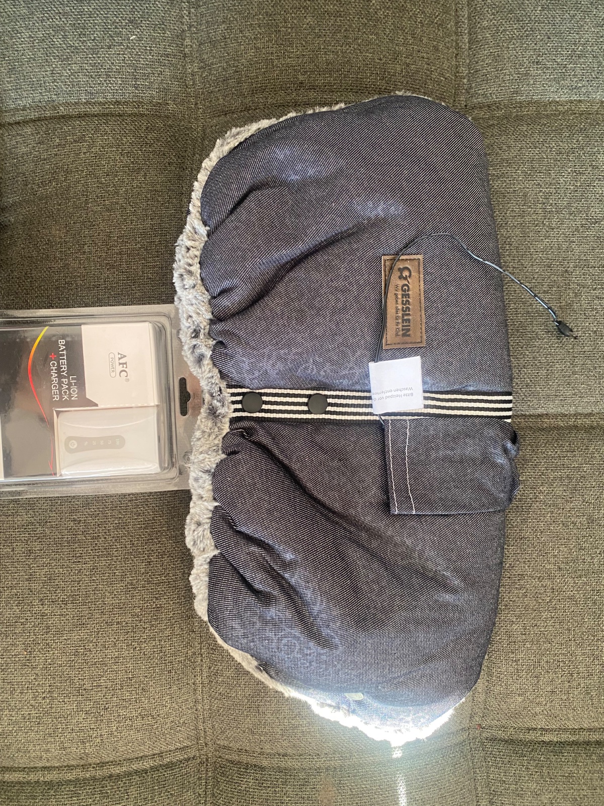 Rukávnik s mäkkučkou kožušinovou vnútornou stranou a nabíjateľným ohrevným prvkom (biela nabijateľná baterka na foto) - výkon ohrevu je možné regulovať v 3 stupňoch. Na kočík sa upevňuje na riadidlách úplne jednoducho pomocou úbim patentiek.