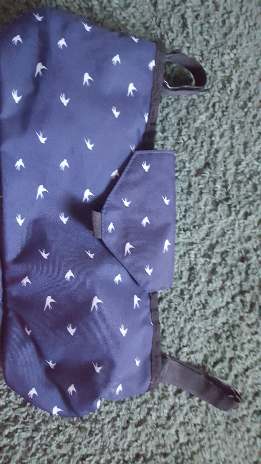 Tmavomodrý pasikavy organizer, na putka na kocik olzs ramienko, aby,sa dal pouzit ako kabelka. Na zip, vnutripo bokoch vela vreciek. Je vypraty, ale dno ma hnede flaky. Rozmery spodok: 35 cm dlzka,...