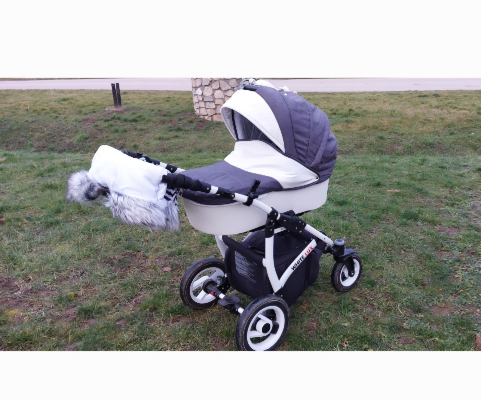 Rukávnik s mäkkučkou kožušinovou vnútornou stranou a nabíjateľným ohrevným prvkom (biela nabijateľná baterka na foto) - výkon ohrevu je možné regulovať v 3 stupňoch. Na kočík sa upevňuje na riadidl...