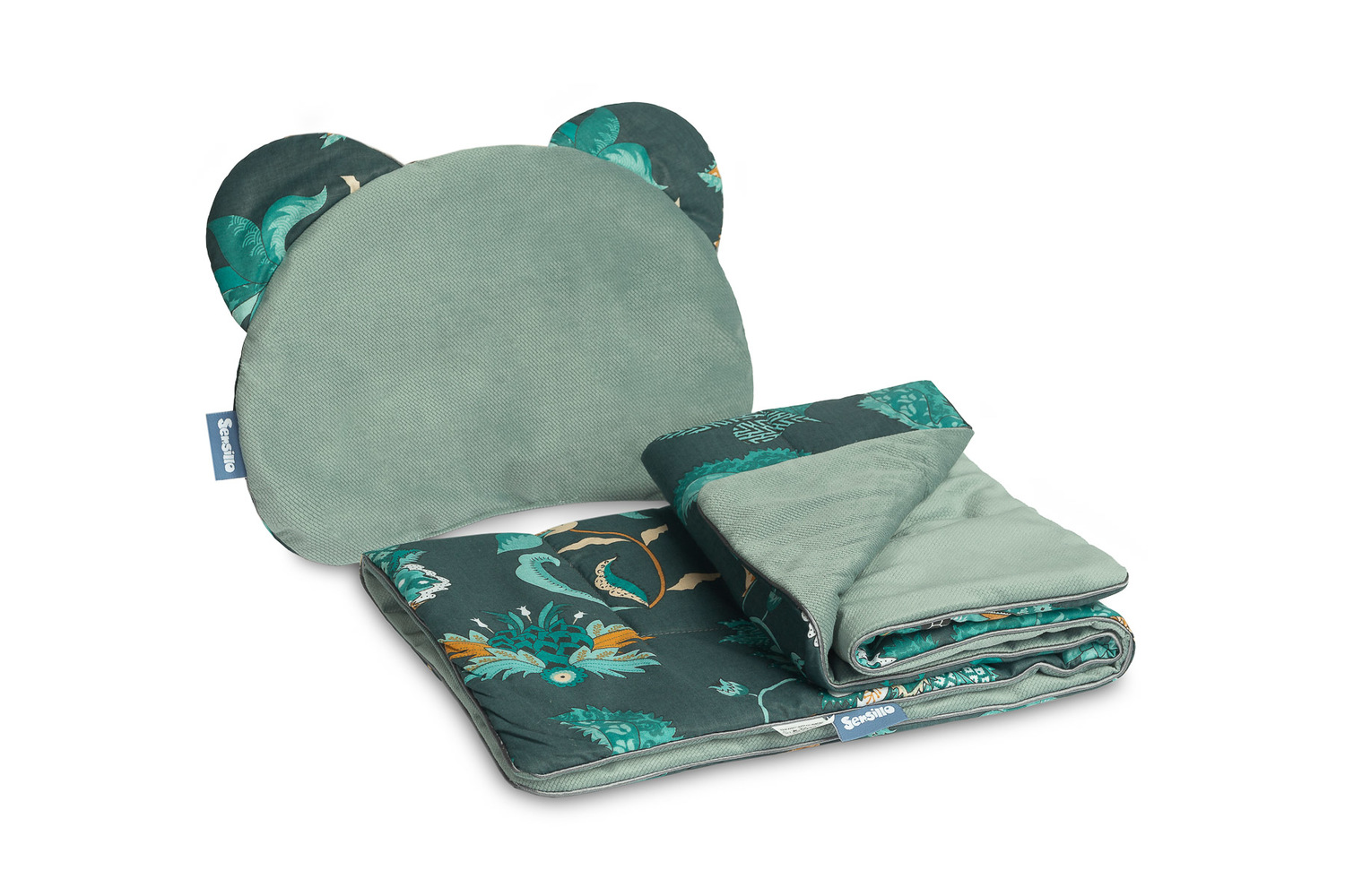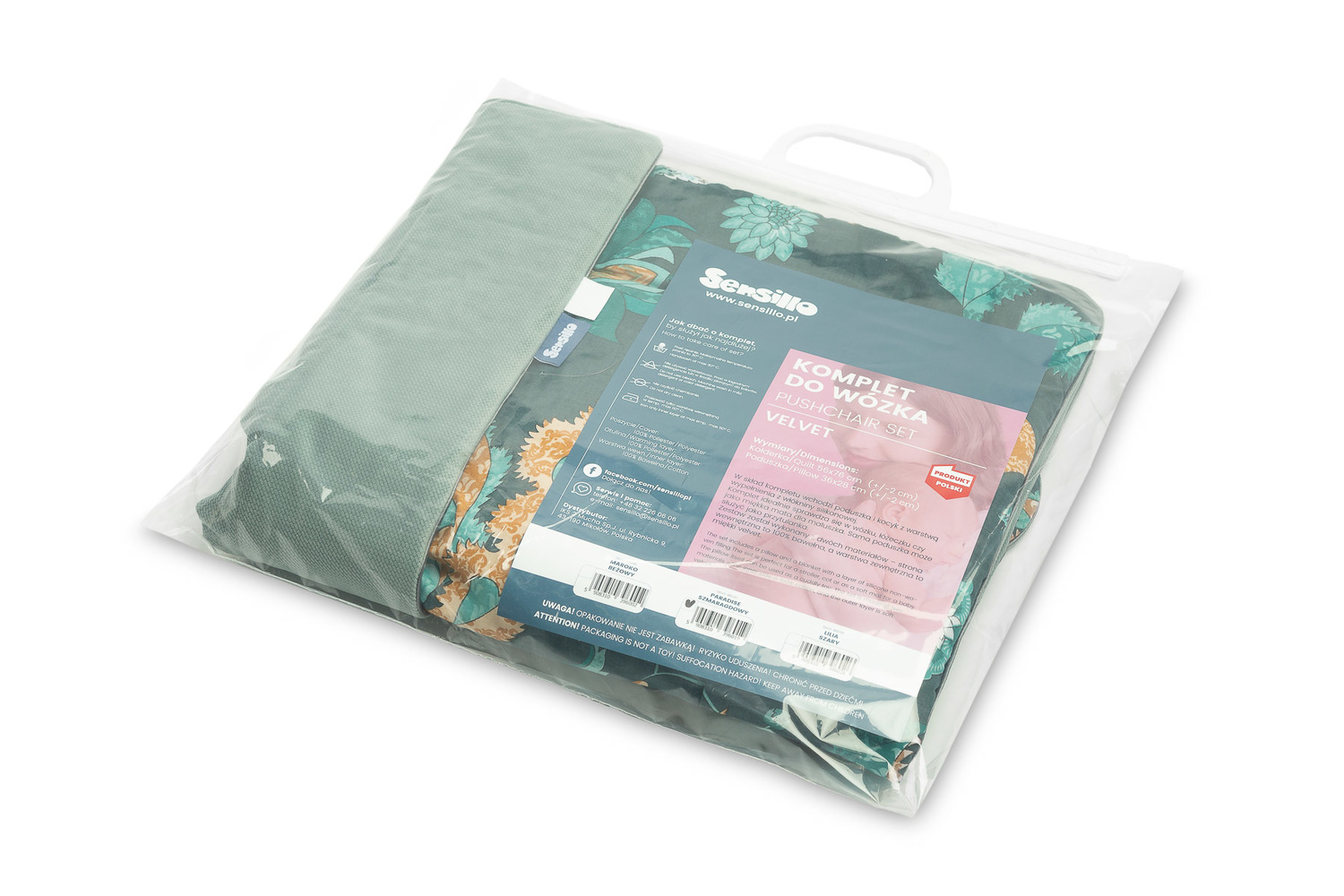 Obojstranná súprava je vyrobená z vysokokvalitných materiálov – farebnej bavlny a veľmi príjemnej látky velvet, ktorá nežne objíme každé bábätko. Súprava je ideálna do kočíka, postieľky, kolísky alebo ako mäkká podložka pre bábätko. Samotný vankúšik môže poslúžiť aj ako maznáčik. Vysokú kvalitu spracovania podčiarkuje aj estetické lemovanie.