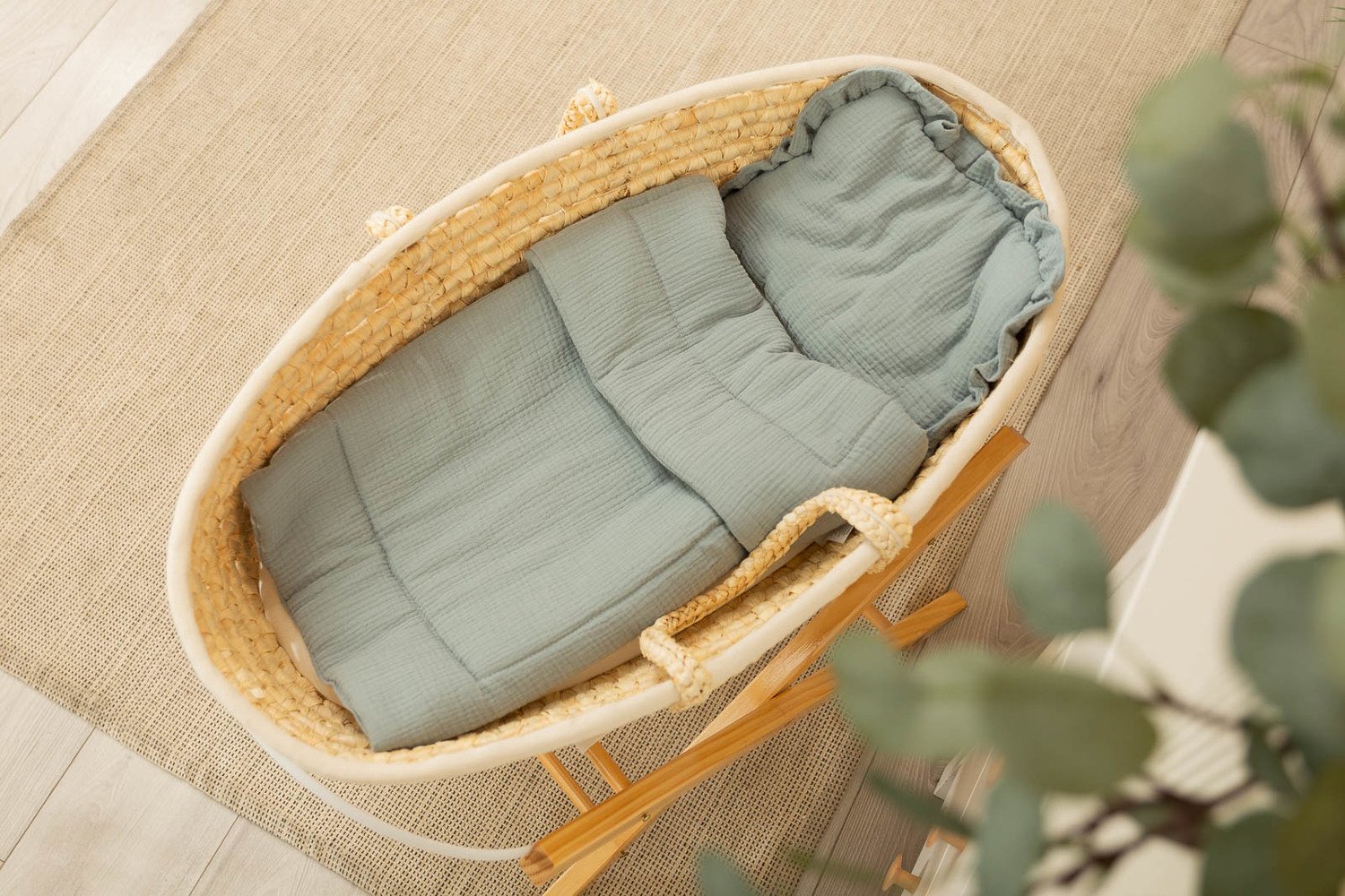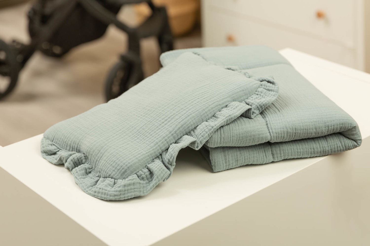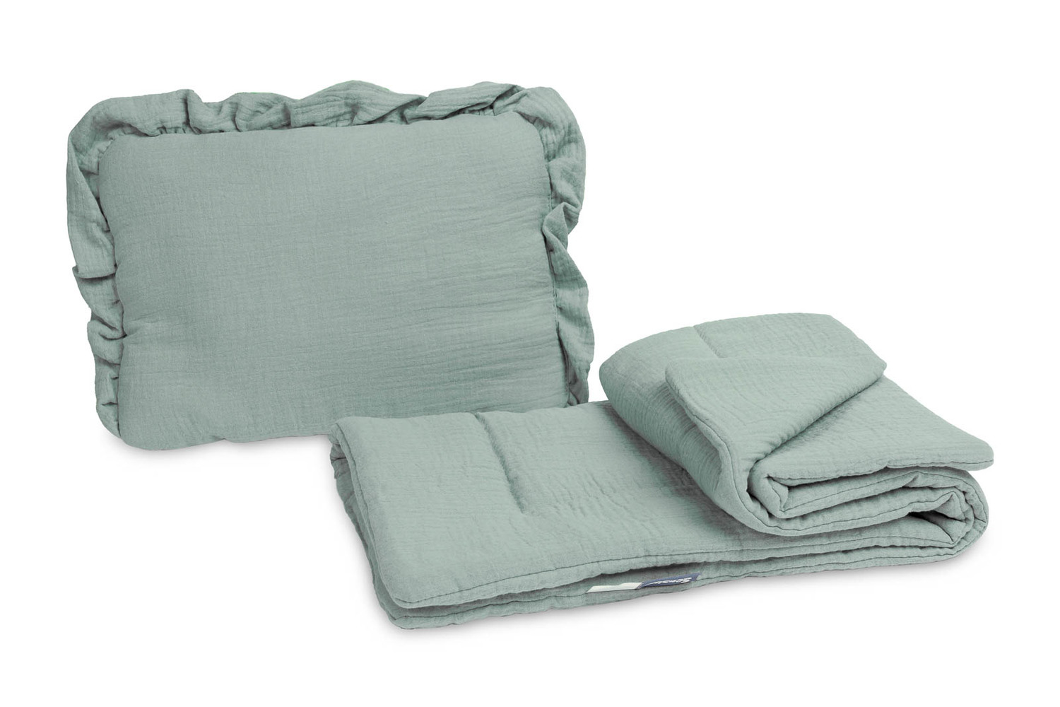 Súprava obsahuje vankúšik a deku, ktoré sú vyrobené z príjemného na dotyk mušelínu. Súprava je ideálna do kočíka, postieľky alebo ako mäkká podložka pre bábätko. Samotný vankúšik môže slúžiť ako maznáčik. Set je vyrobený z dvoch materiálov – vnútorná strana je zo 100 % bavlny a vonkajšia vrstva z mäkkého mušelínu.