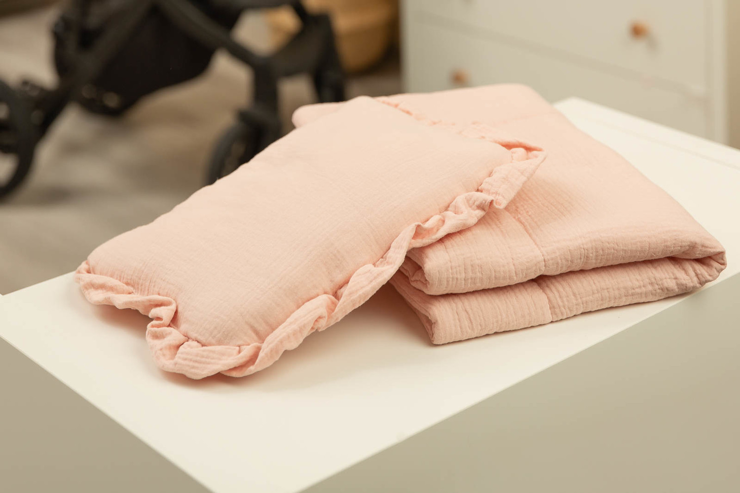 Súprava obsahuje vankúšik a deku, ktoré sú vyrobené z príjemného na dotyk mušelínu. Súprava je ideálna do kočíka, postieľky alebo ako mäkká podložka pre bábätko. Samotný vankúšik môže slúžiť ako maznáčik. Set je vyrobený z dvoch materiálov – vnútorná strana je zo 100 % bavlny a vonkajšia vrstva z mäkkého mušelínu.