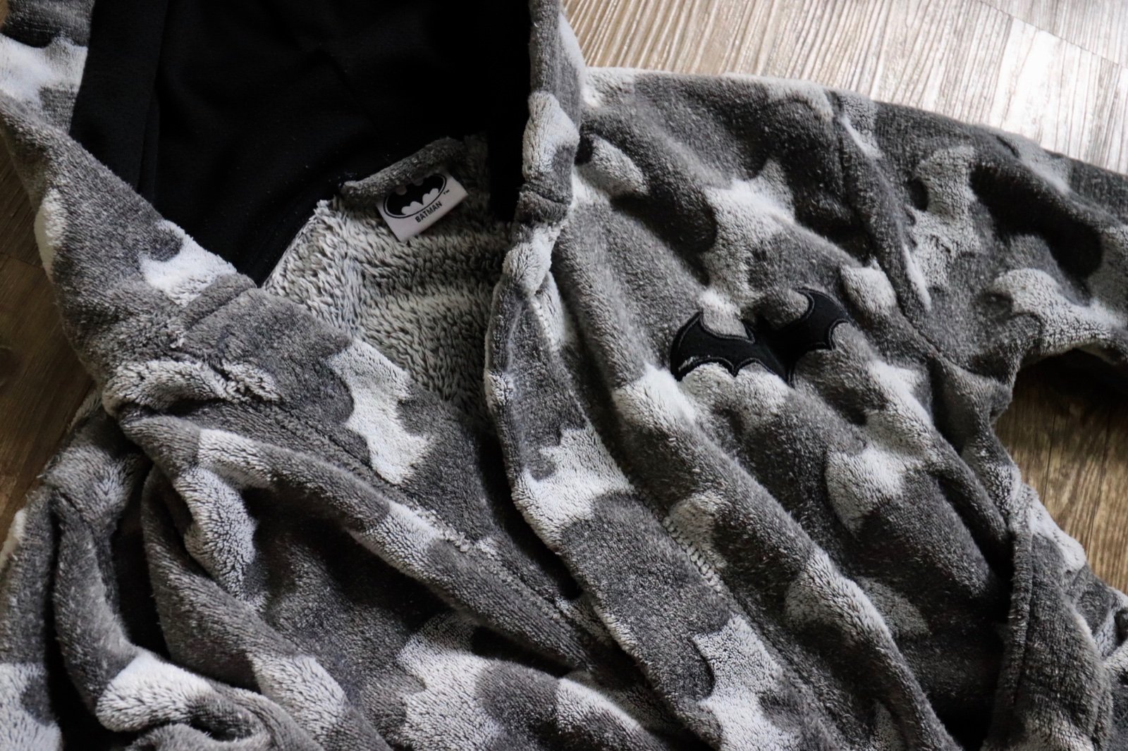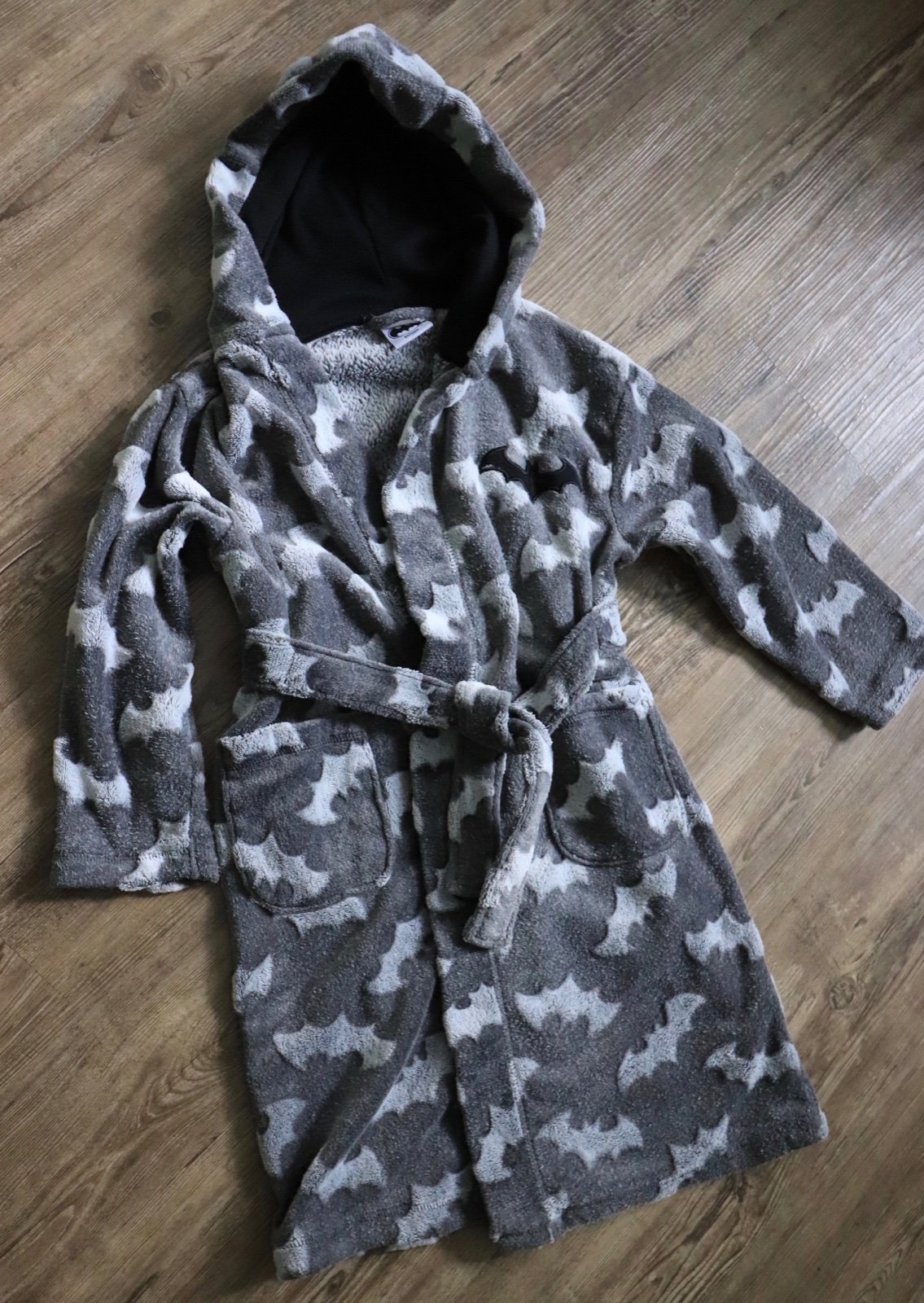 Teplý mäkký župan s Batman vzorom.. Má malý svetlý fľak, nie je to moc vidno. Inak je v dobrom nosenom stave.