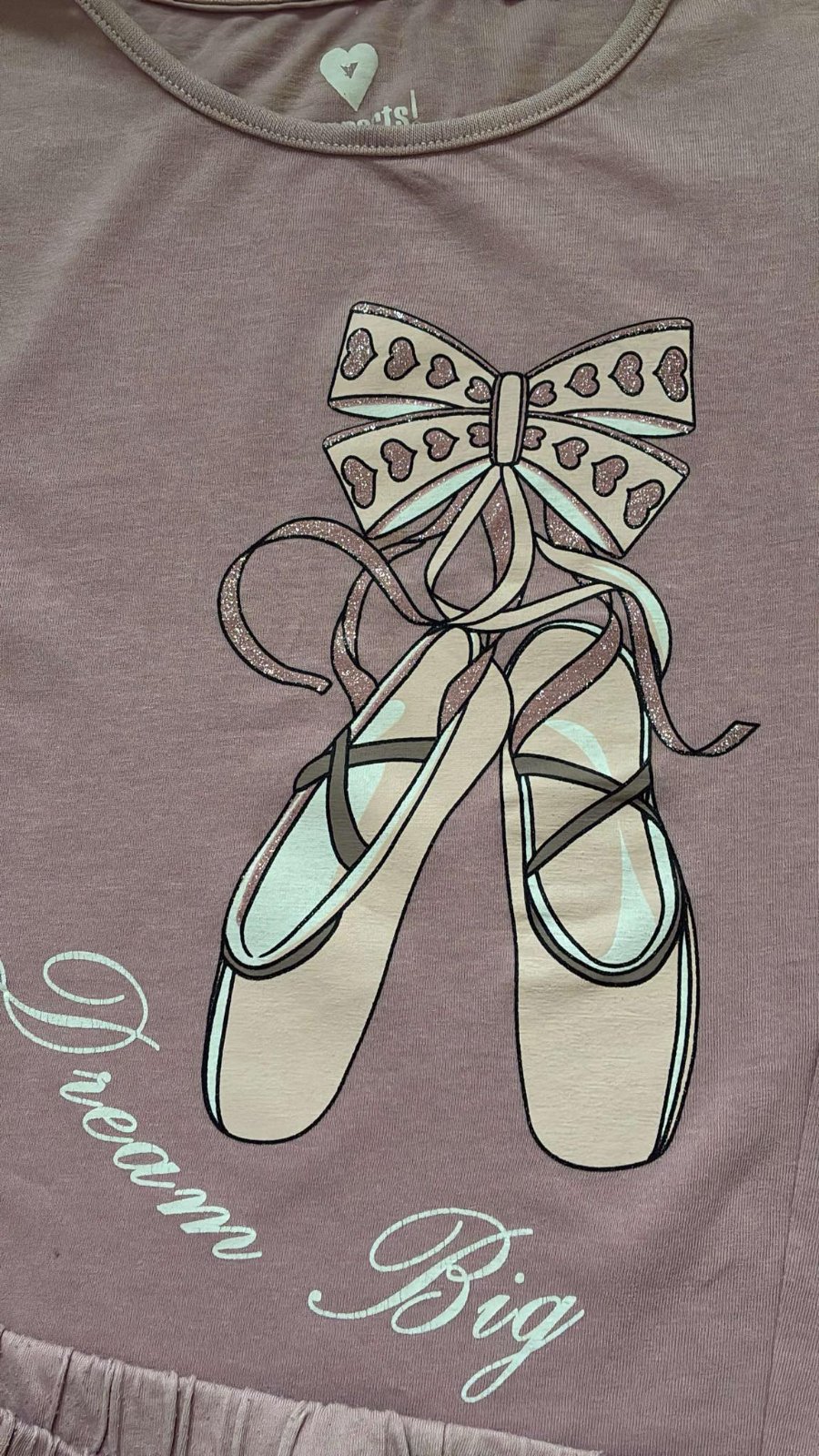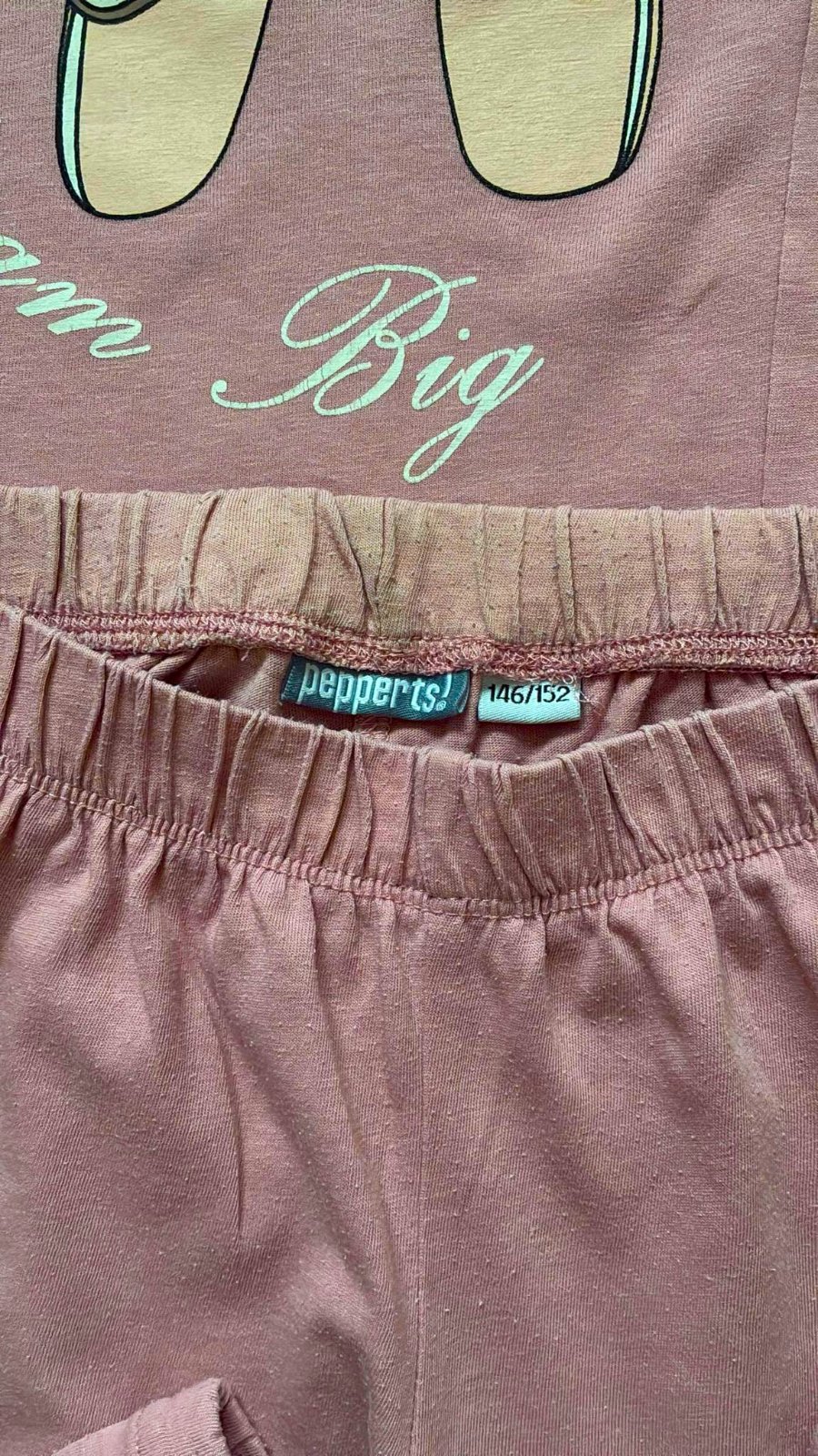 Predám dievčenské pyžamo veĺ.146/152, zn. Pepperts, staroružová farba ako na prvej foto, vrchný diel má motív baletných topánok s nápisom "Dream Big" a rozmery: d=53cm, š=43cm, r=53cm, rozmery dlhých ohavíc: d=79cm, š v páse=28cm a 2,5cm široká guma, dolu guma 2cm , pekný nosený stav, bez žmolkov, materiál bavlna.