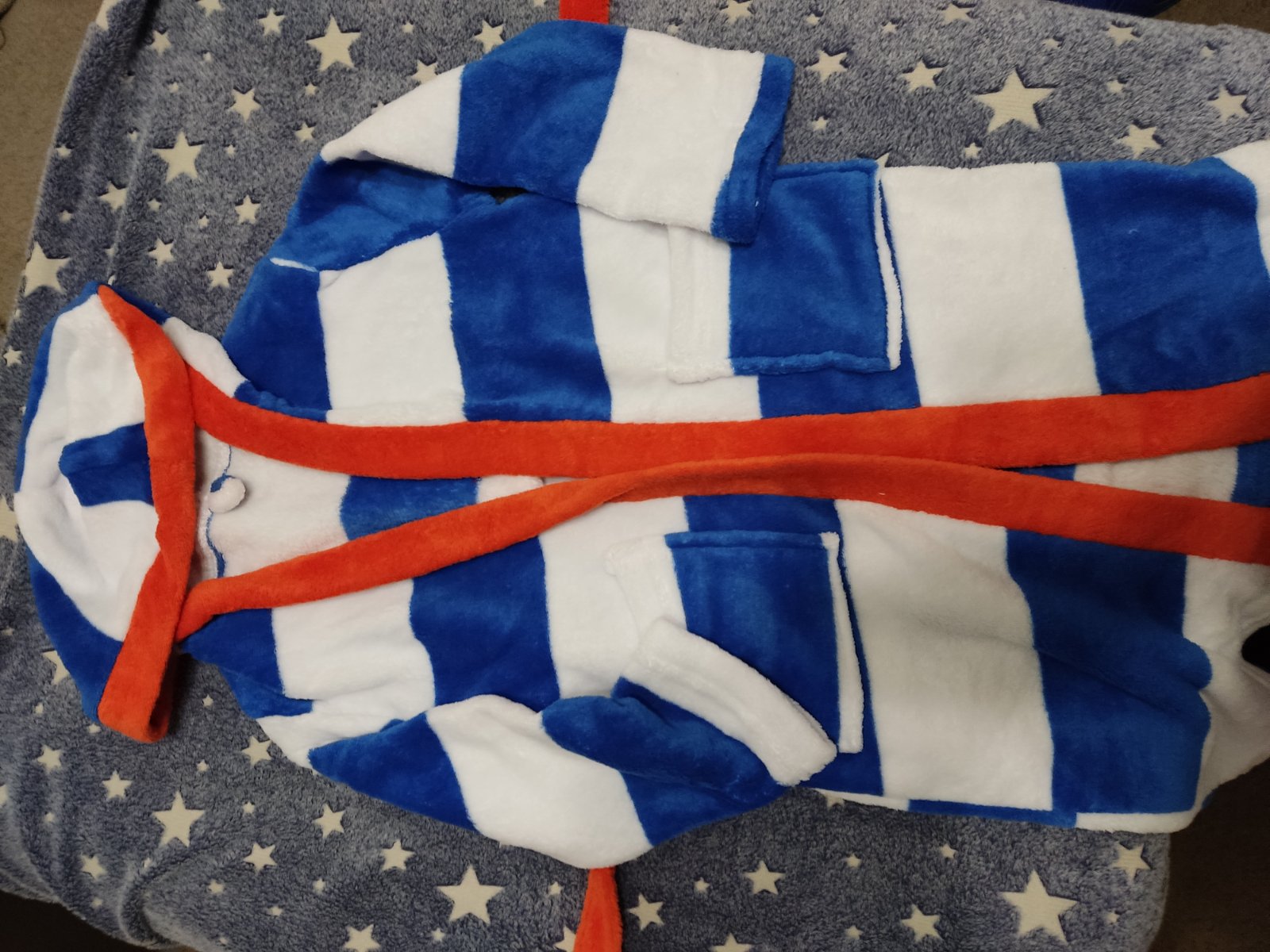 Ponúkam na predaj župan krátko používaný s futbalovým motívom/ 8 rokov/. Veľmi príjemná bavlna 100% od značky Soft cotton. Pôvodná cena 65 €. Dĺžka 80 cm. Ponúkam aj ten istý župan pre 10 ročného.
