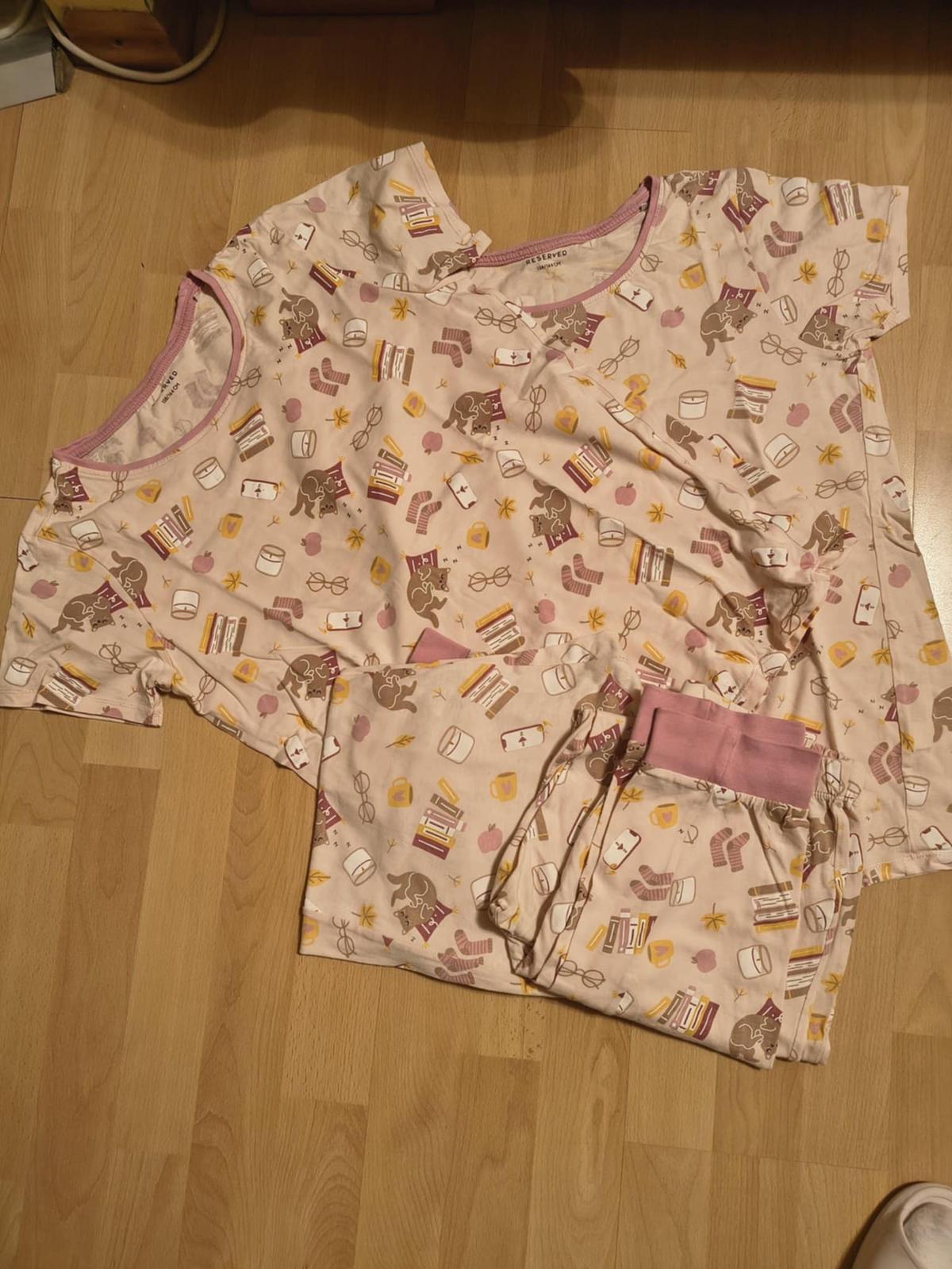 Pyžamko v dobrom stave, bez poškodení. 2x. Dĺžka nohavíc- 91cm, pás v kľude- 33cm x 2. Tričko dĺžka- 60,5cm, šírka trička 46cm x 2.