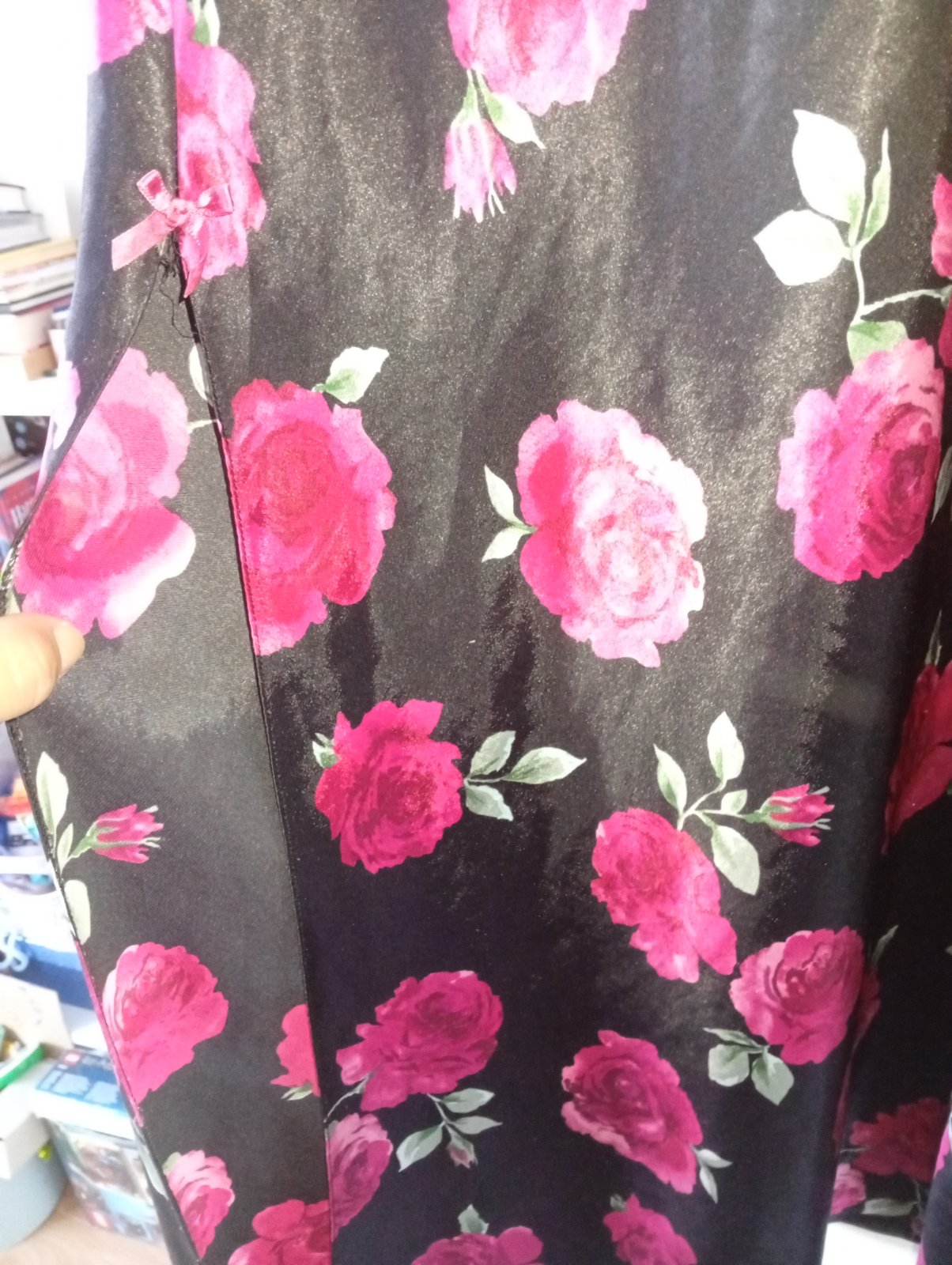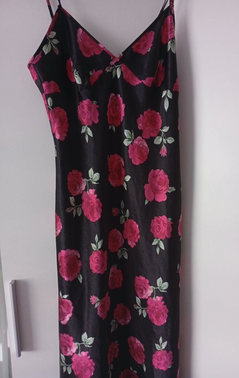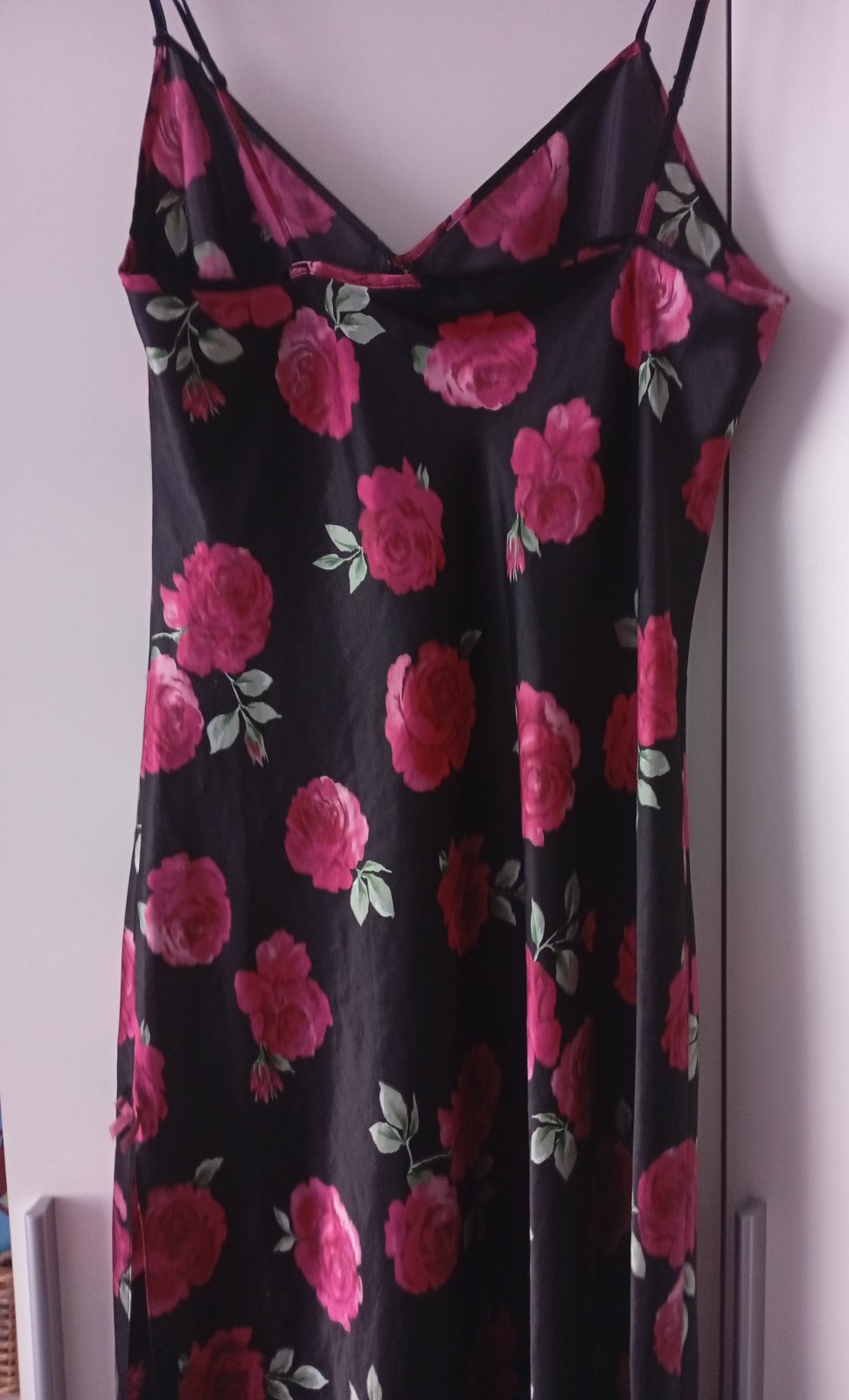 Predám peknú, ľahučkú, satenovu košieľku veľ. M /L s rázporkom a posuvnými ramienkami.Super stav, potlač purpurovych ruží.