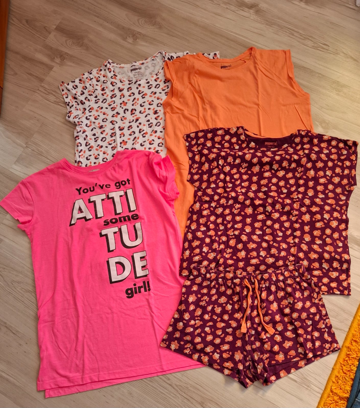 Ponukam 4 dievcenske pyžamá, v.158/164, nosené, stále pekne, ružové darujem, ma drobne zmolky z prania.