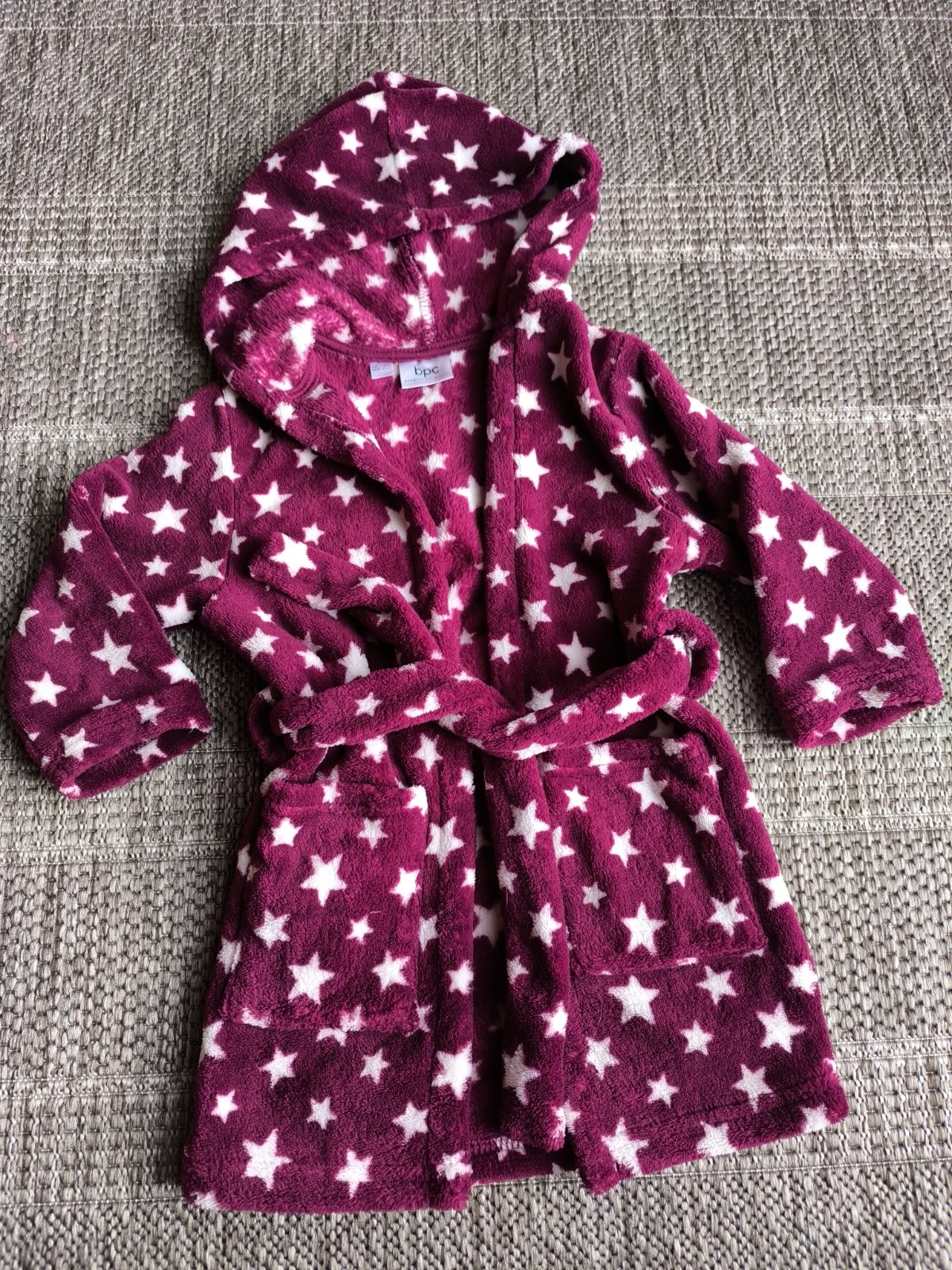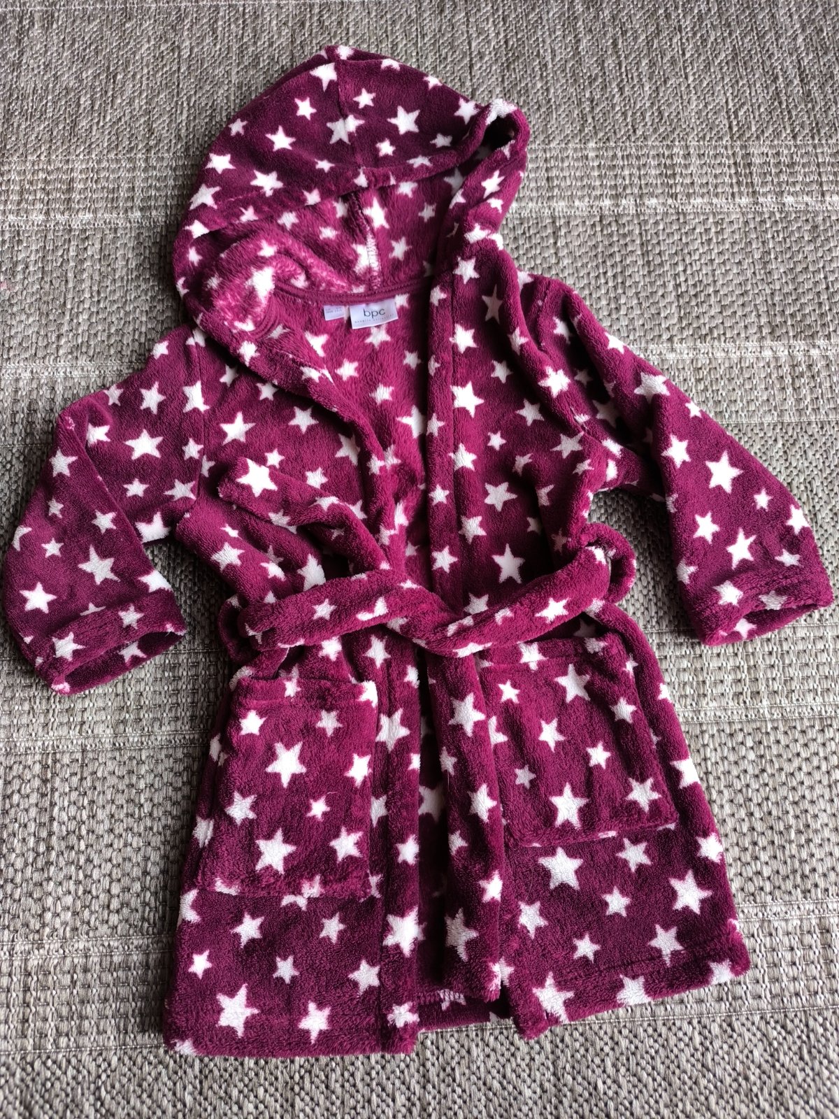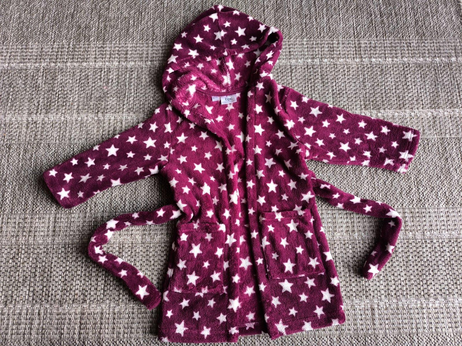 Mäkký, ľahký, hrejivý, rýchloschnúci, plyšový župan s kapucňou. Unisex, vhodný pre dievčatá aj chlapcov. Veľkosť 92-98, 2-3 roky. Dĺžka 55cm, šírka 30cm, rukáv od ramena 30cm. V super stave.