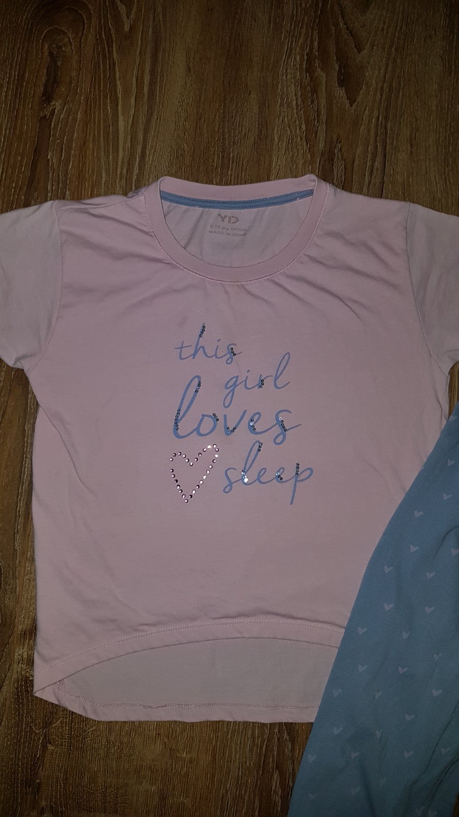 Zachovale pyzamko velkost 9/10 rokov gate dlzka 81 cm od rozkroku 57 cm tricko dlzka 53 cm sirka pod pazuchami 44 cm nosene na tricku v predu sa najdu bledulilinke fliacky neda sa to ani odfotit ale inak ok