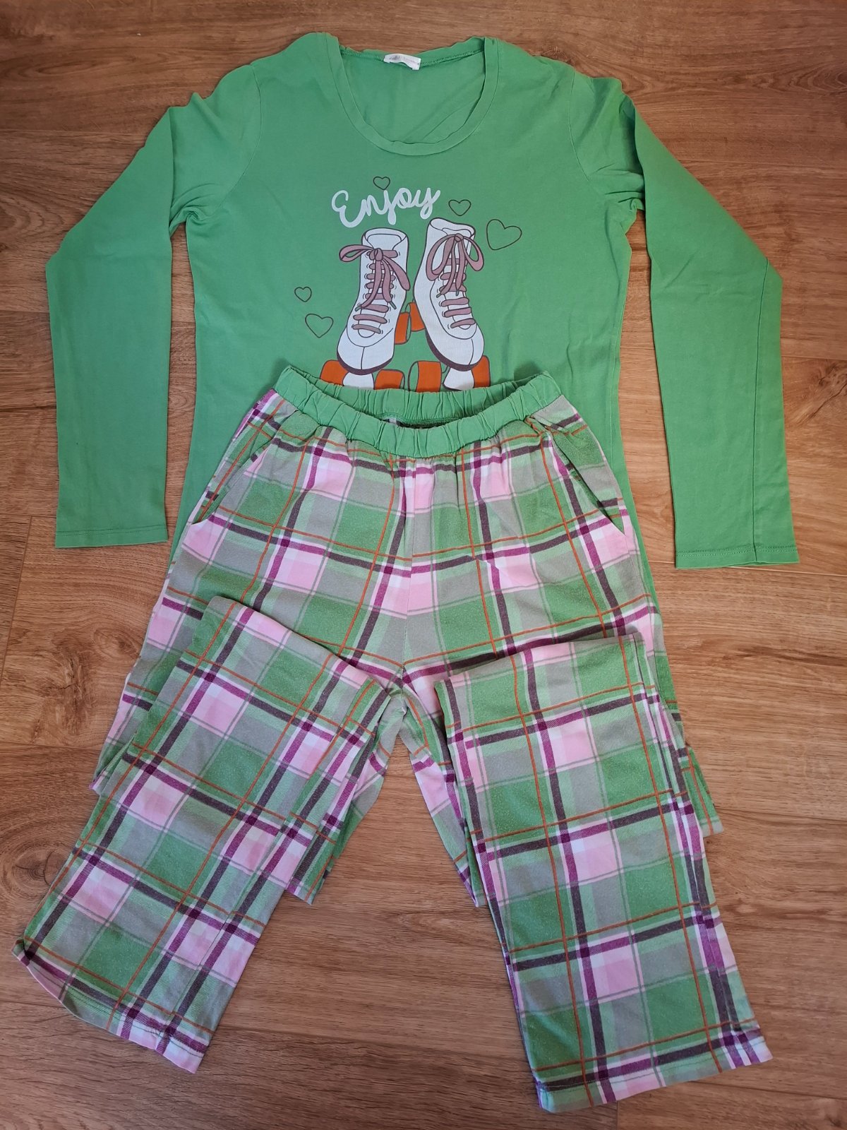Pyzamo s napisom a karovanymi nohavicami s vreckami bez patentov. Celkova dlzka vrchneho dielu 63 cm, sirka v podpazusi 44 cm, dlzka rukava 59 cm. Dlzka nohavic 100 cm, sirka bokov 50 cm, obvod pasa 60 cm.